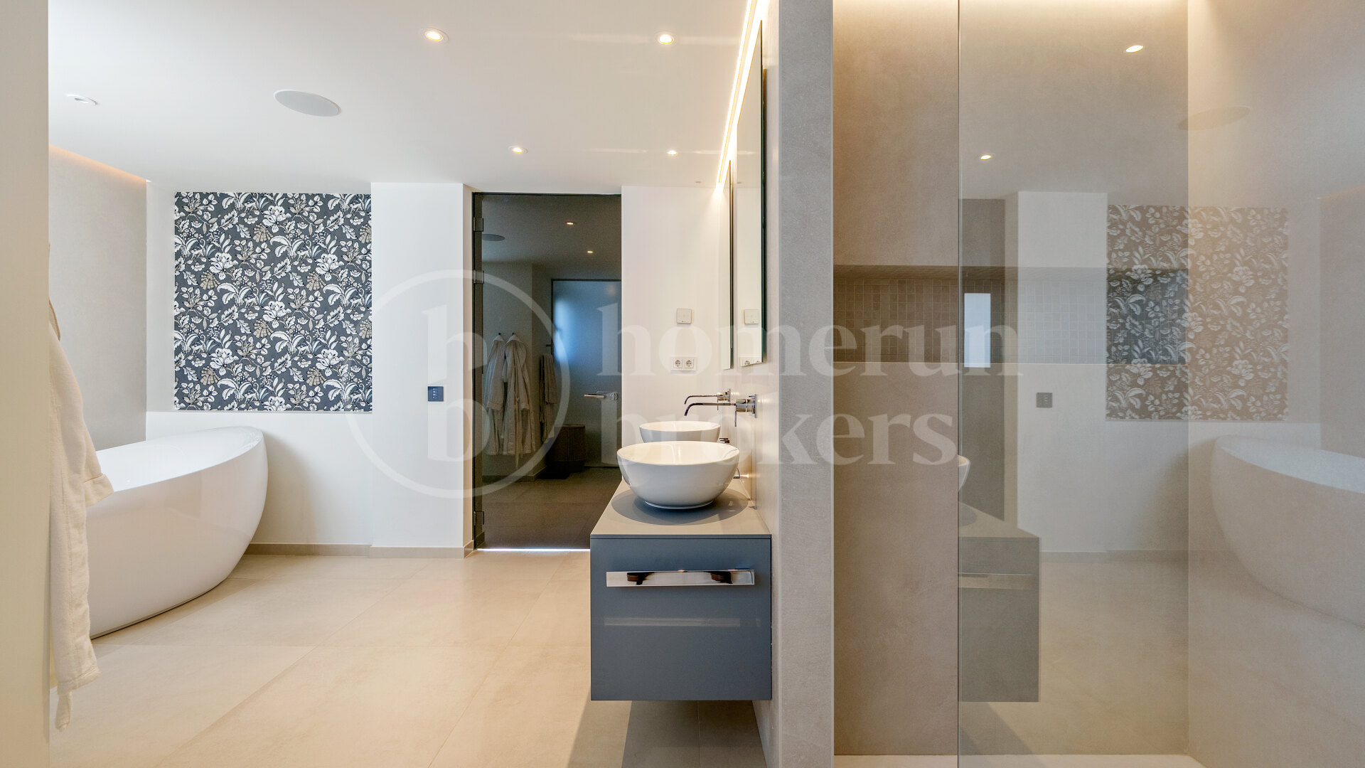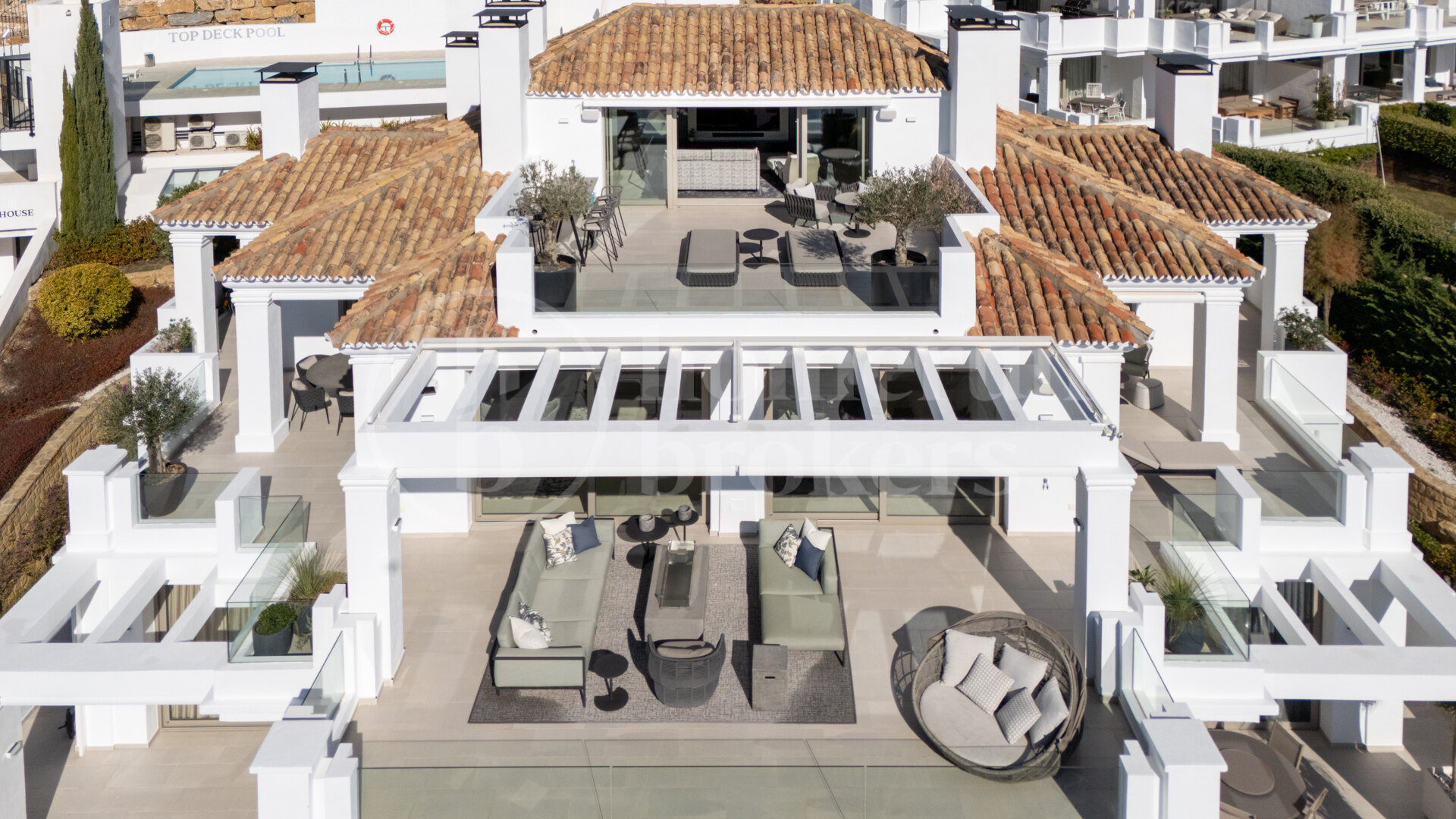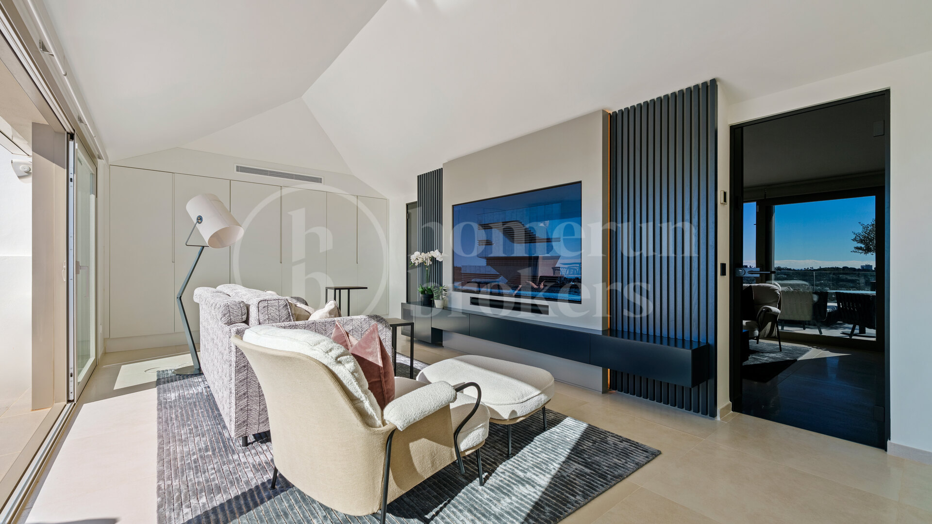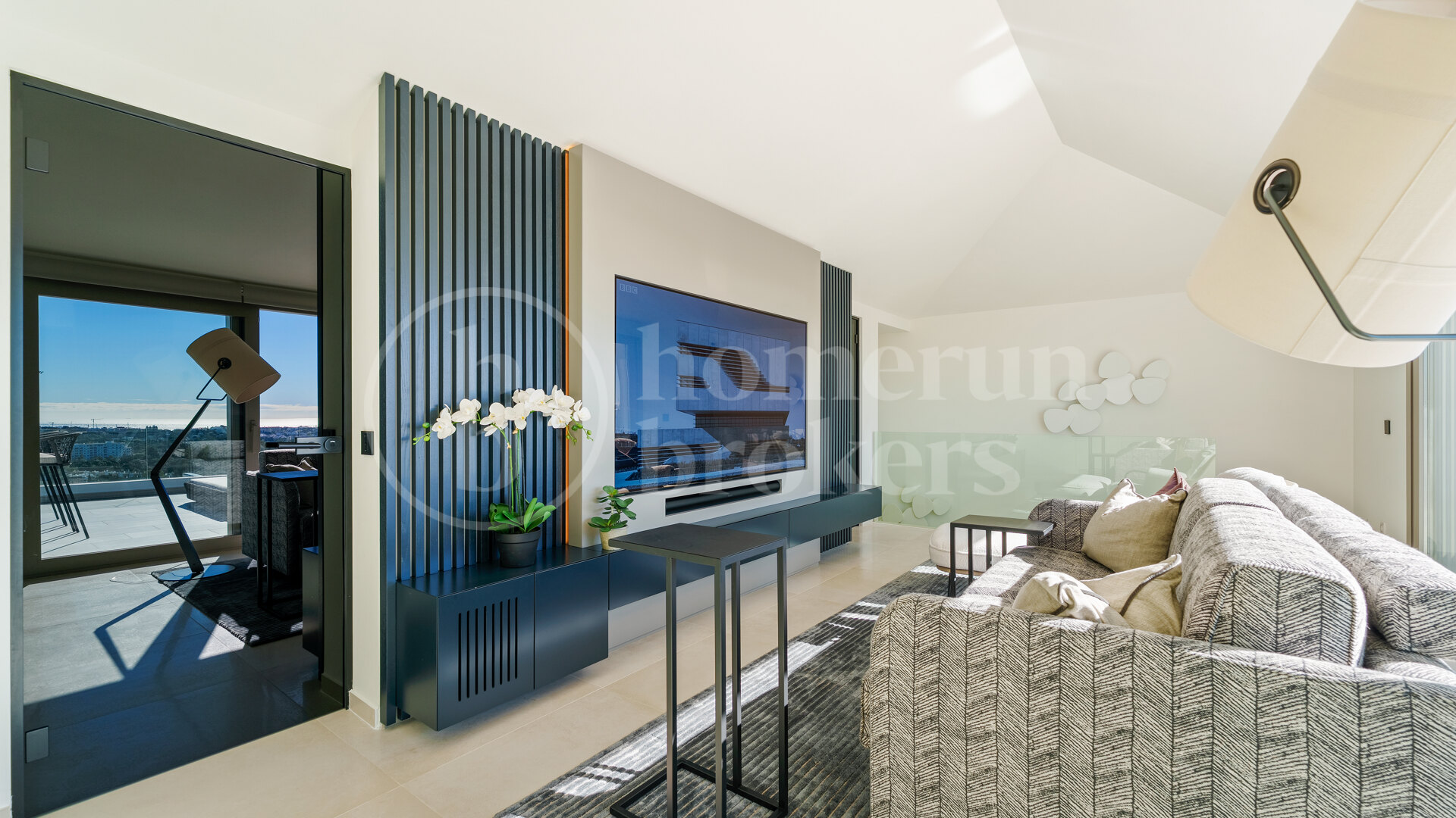 På övervåningen introducerar den andra nivån en mer privat och avslappnad atmosfär. En sekundär lounge ger ett extra vardagsrum som kan anpassas för underhållning, arbete eller tyst reträtt. Detta golv öppnar på omfattande terrasser som fungerar som utomhus vardagsrum, med plats för mat, lounging och sola under hela året. Den förhöjda positionen garanterar oavbruten utsikt och en hög sekretessnivå, vilket gör dessa terrasser till en av de definierande delarna av fastigheten.