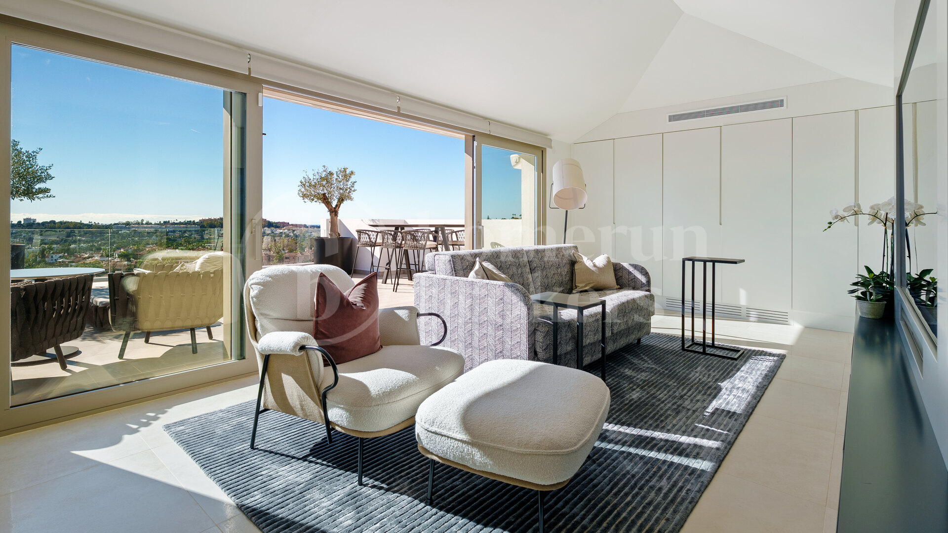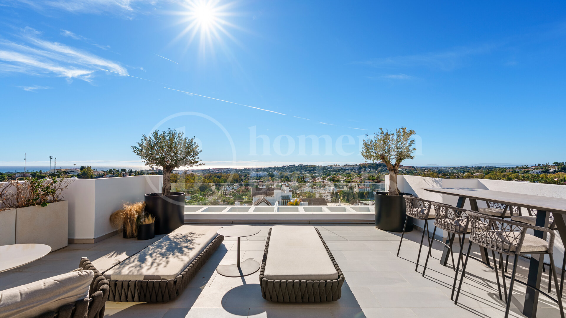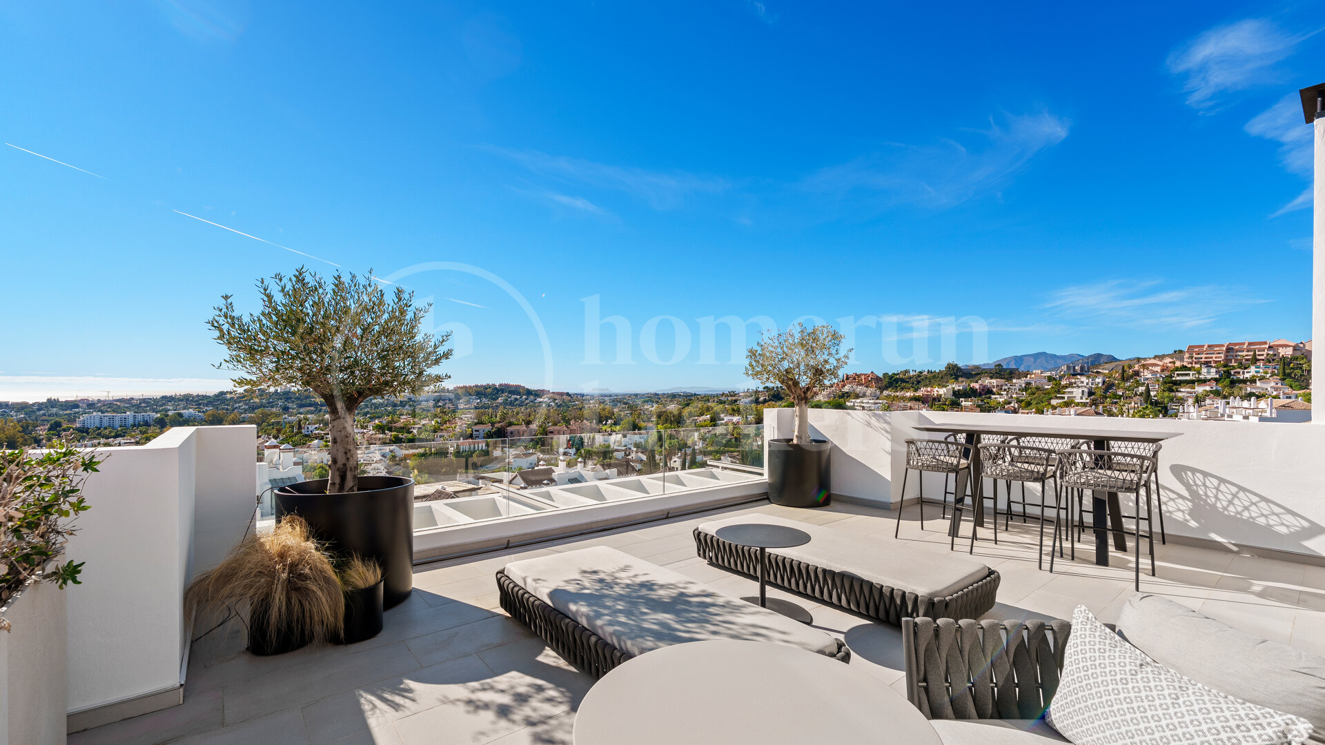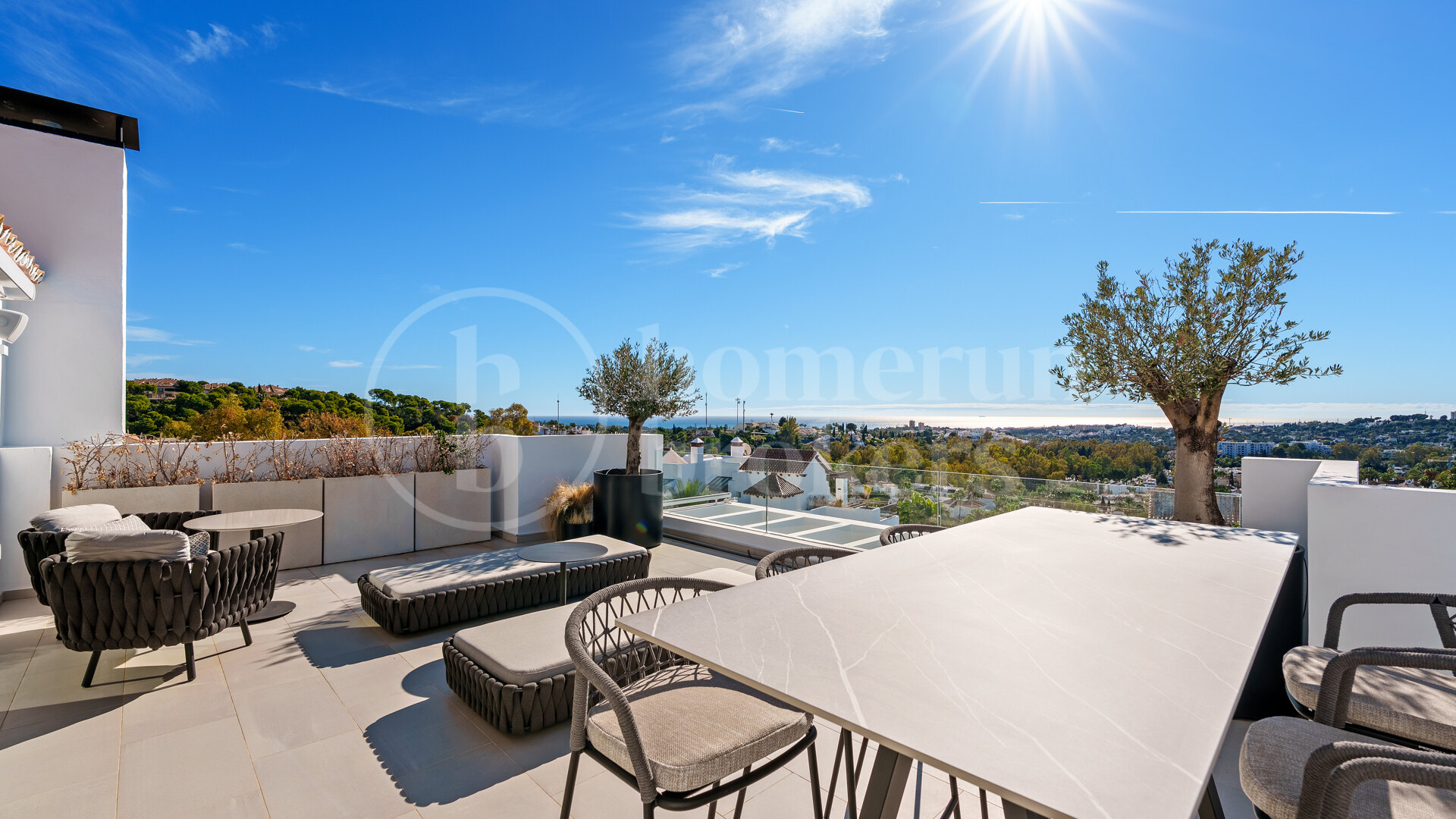 Duplex takvåning till salu i Nine Lions, Nueva Andalucía, en modern bostad som ligger över två nivåer med flera sovrum och en-suite badrum, expansiva terrasser, öppen plan inredning och panoramautsikt över grönska, berg och Medelhavet, beläget inom en säker gated community med resort-stil faciliteter och 24-timmars säkerhet.