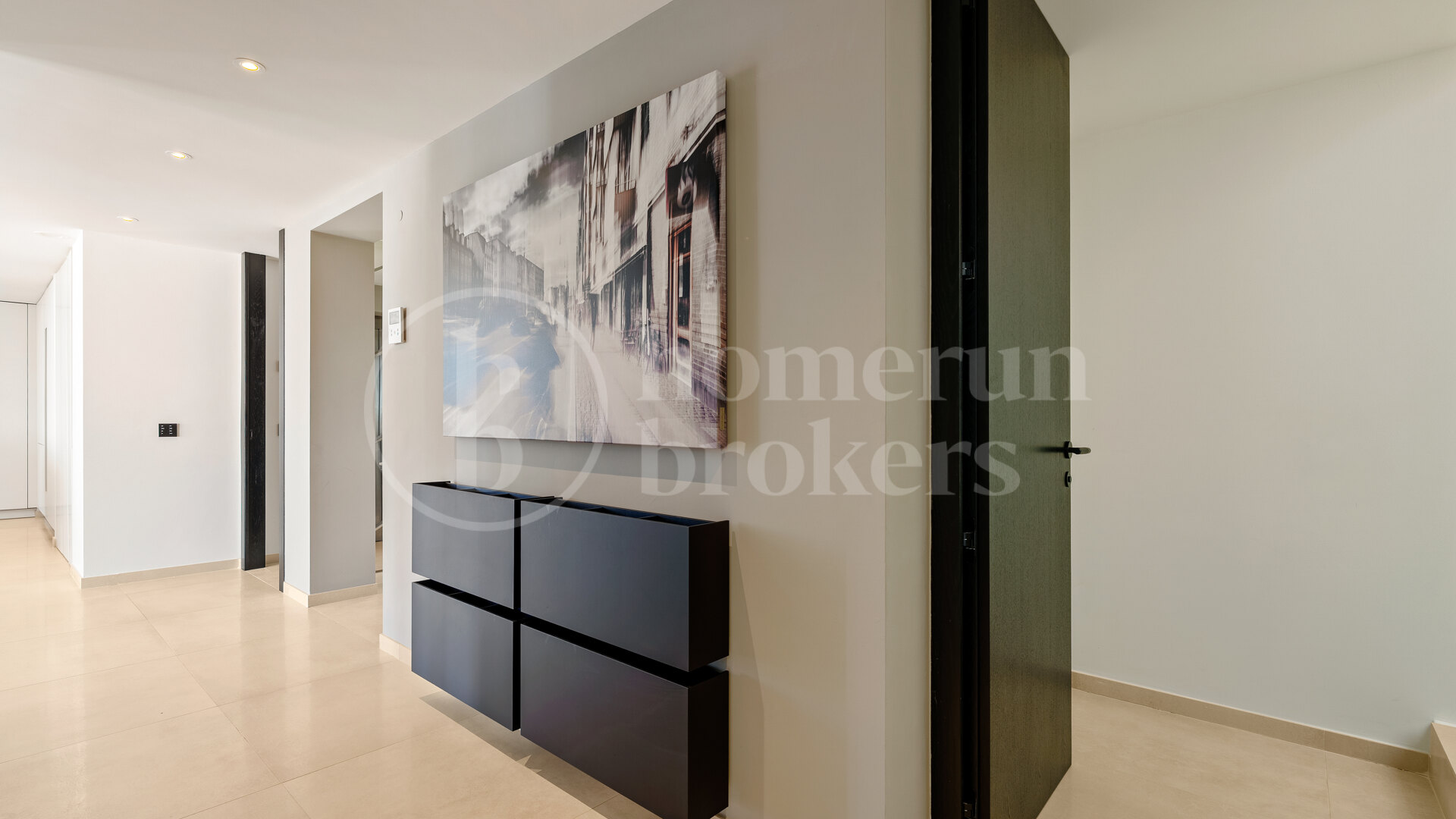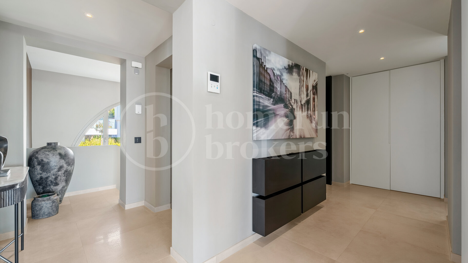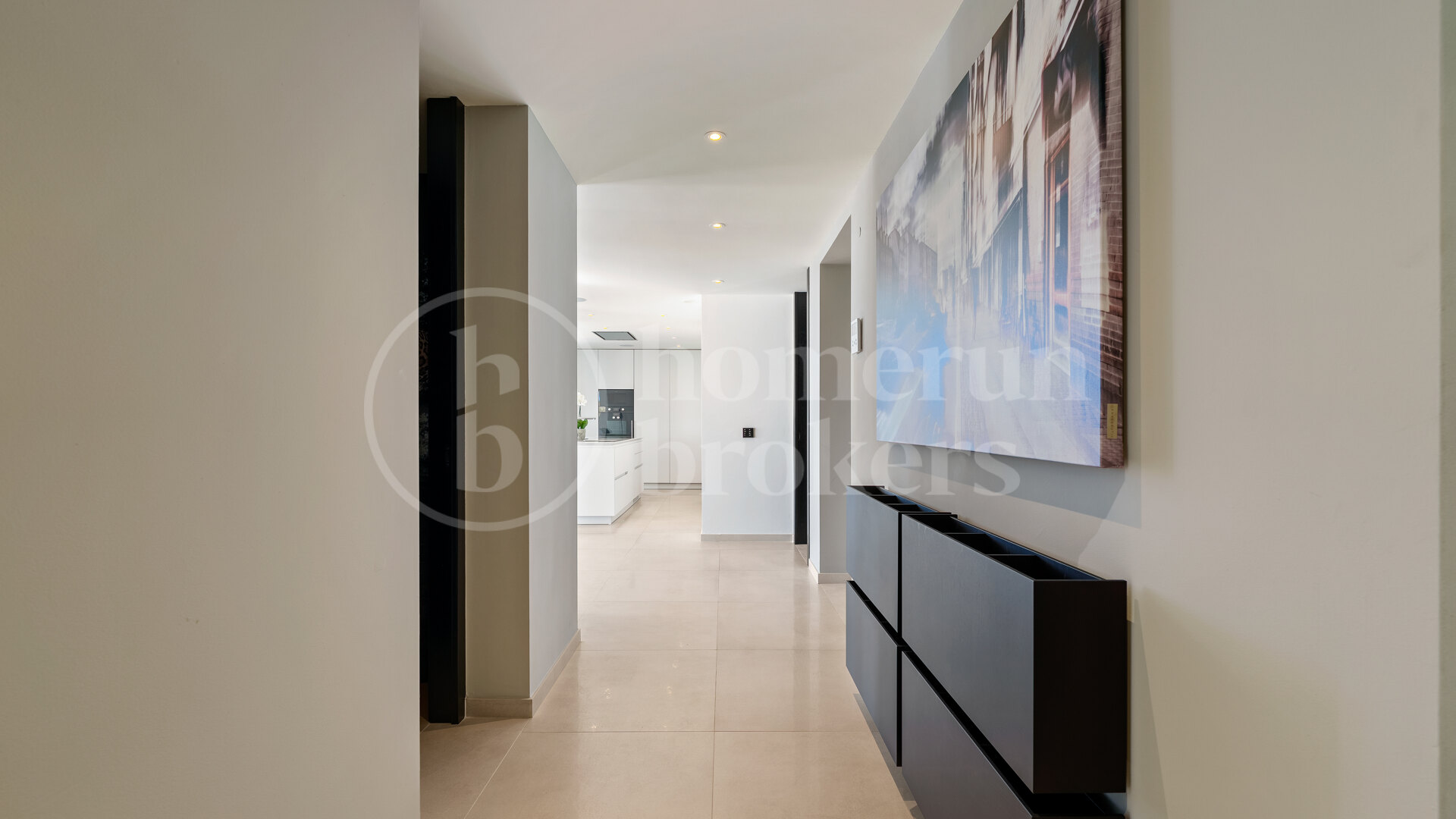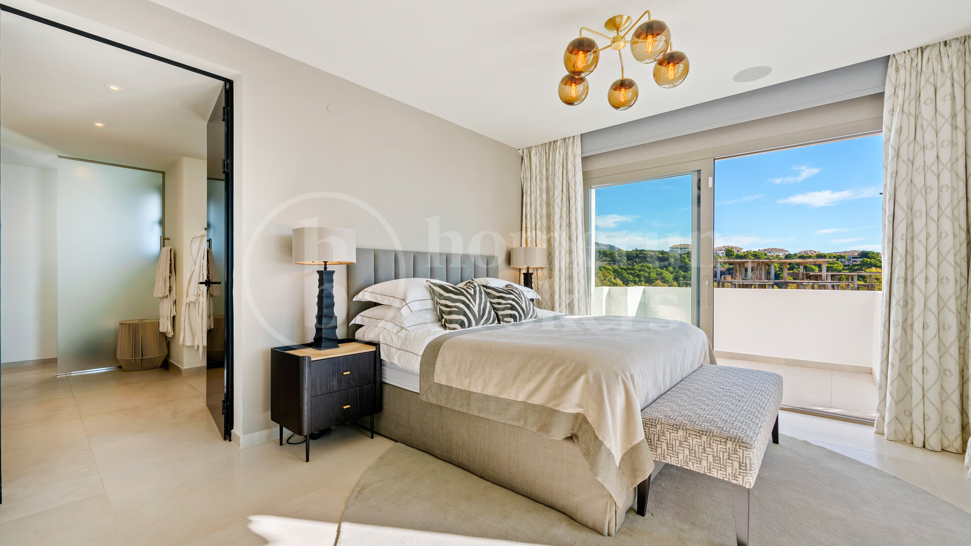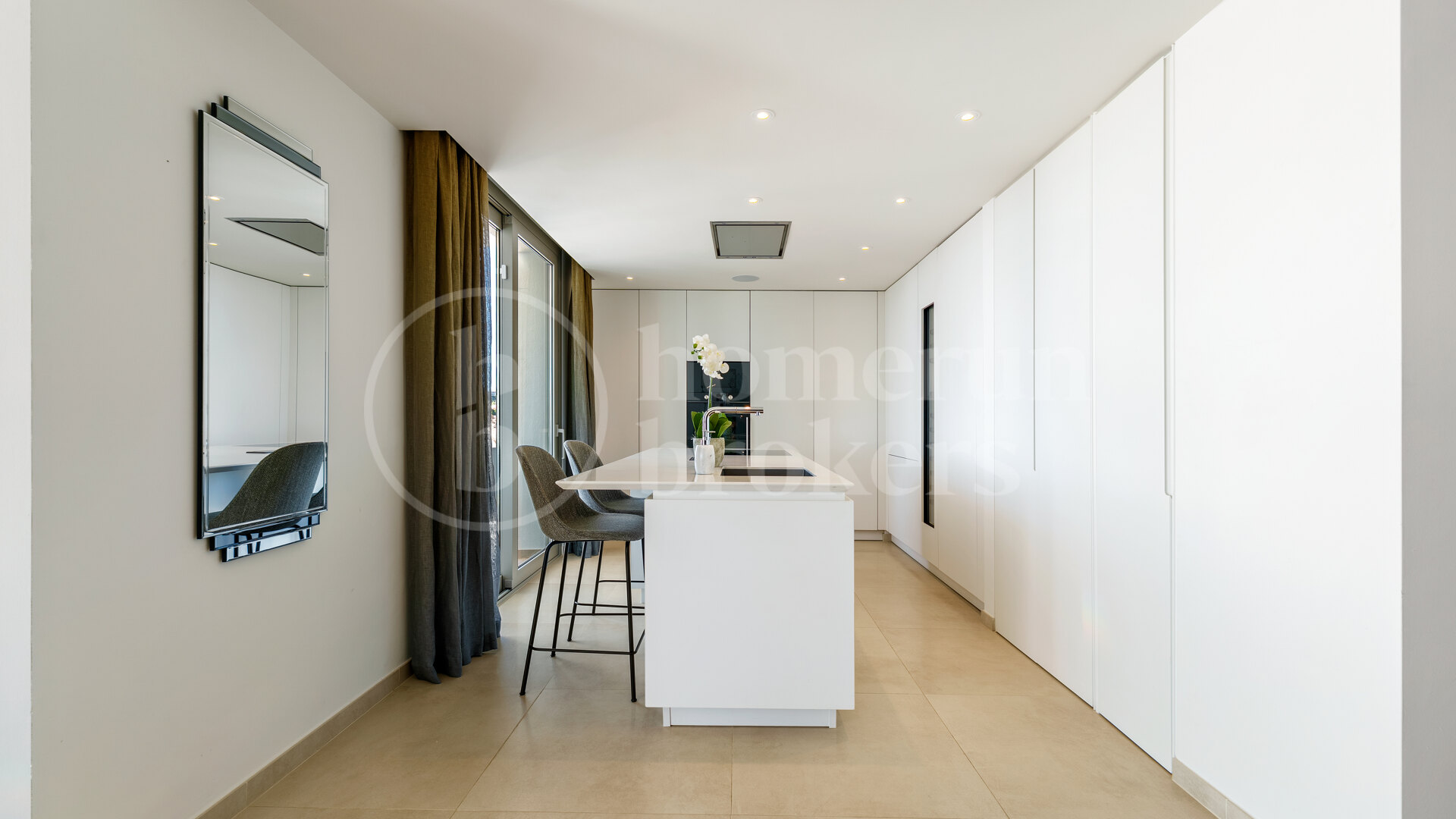 Huvudnivån på fastigheten är utformad kring en rymlig öppen planlayout som integrerar de levande, matsal och köksområden i ett kontinuerligt utrymme. Golv till tak glidande glasdörrar öppna direkt på generösa terrasser, vilket gör att naturligt ljus kan röra sig fritt genom inredningen samtidigt som det förstärker anslutningen med utomhusområdena. Köket följer en modern design med högkvalitativa apparater och raffinerade ytor, som erbjuder både praktiskhet och en stark visuell närvaro i vardagsrummet. Sovrum på detta golv är ordnade för komfort och integritet, var och en med en-suite badrum och en lugn, neutral estetik som kompletterar den övergripande designen av hemmet.
