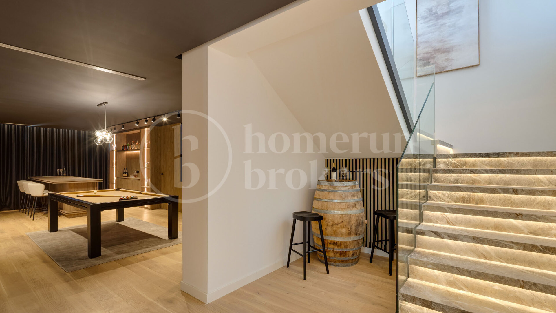 Villa Embers interiör andas stil och sofistikation. Från det ögonblick du kliver in möts du av en känsla av diskret lyx, förstärkt av noggrant utvalda material såsom ekgolv och stora porslinskakel. GAGGENAU- och SIEMENS-vitvaror av högsta kvalitet har integrerats genom hela hemmet, vilket understryker dess höga standard och funktionella excellens.