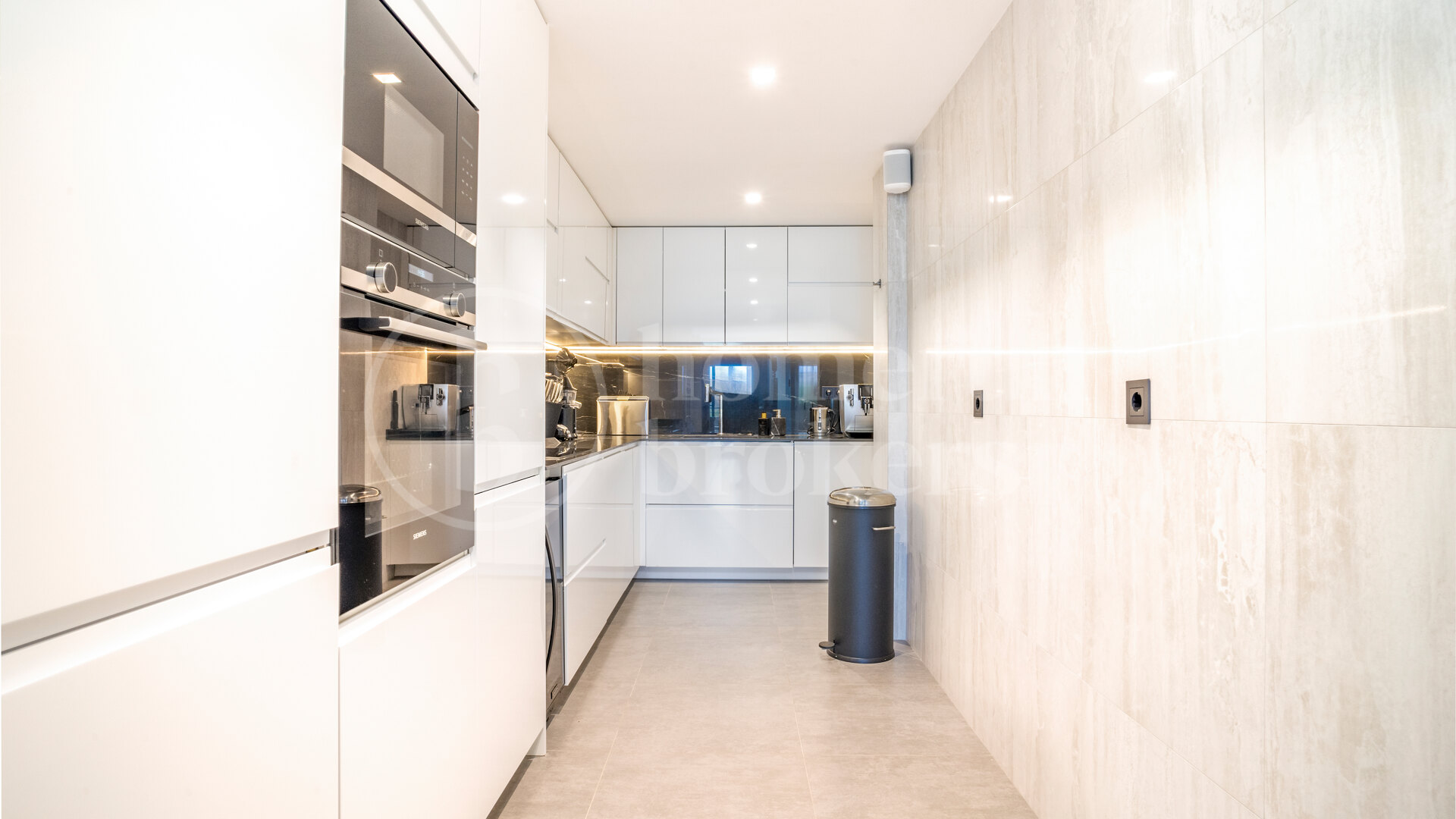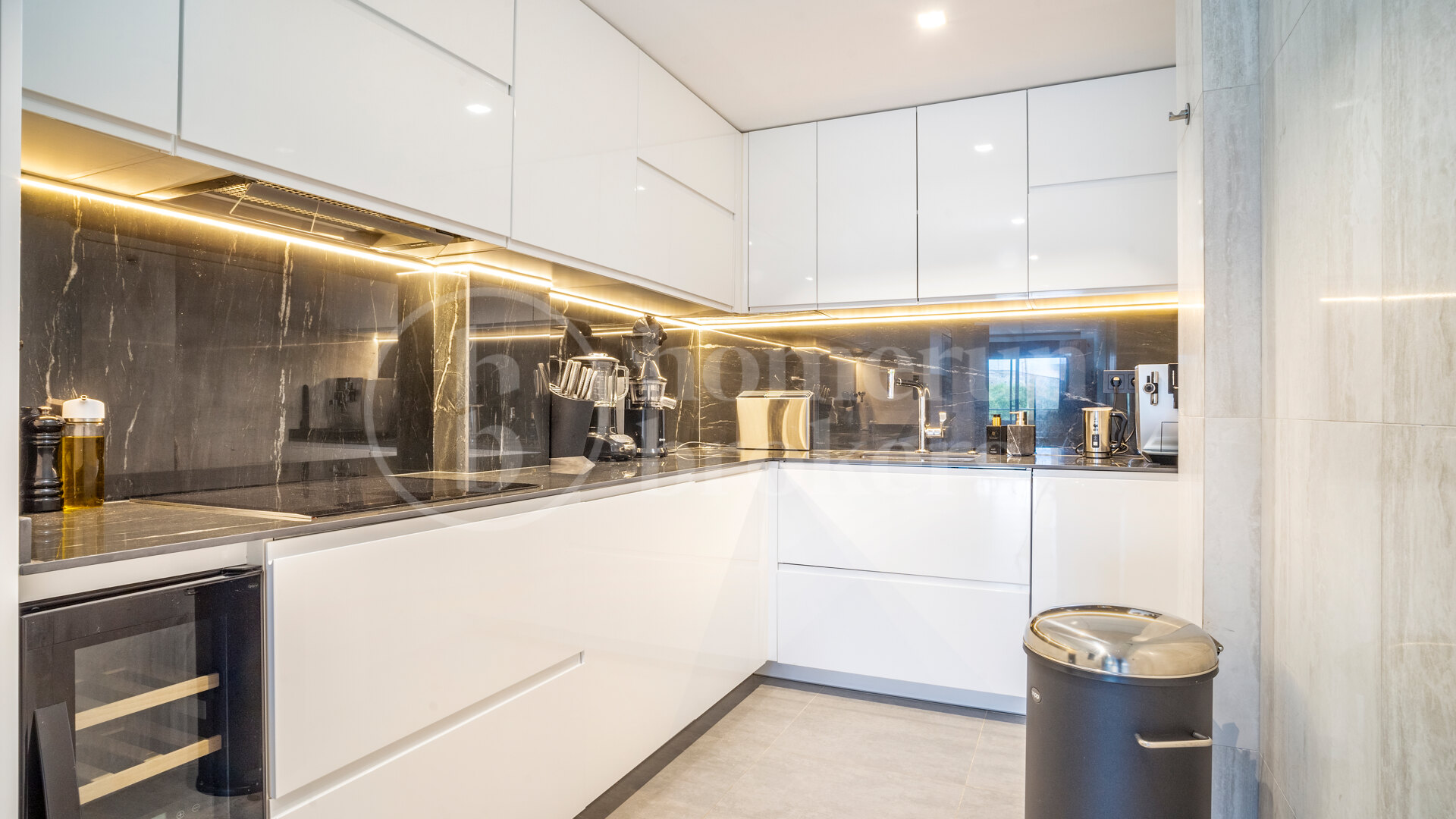 Interiören följer en samtida skandinavisk stil, kännetecknad av rena linjer, ljusa ytor och högkvalitativa materialval. Det öppna köket, utrustat med Siemens vitvaror, integreras perfekt med mat- och vardagsrumsdelarna och skapar en flytande planlösning som passar både avkoppling och sociala tillställningar. Stora skjutdörrar leder ut till den västvända terrassen, där boende kan njuta av panoramautsikt över Los Arqueros golfbana och det omgivande bergslandskapet. Här är solnedgångarna särskilt imponerande, vilket gör kvällarna på terrassen till en höjdpunkt för fastigheten.