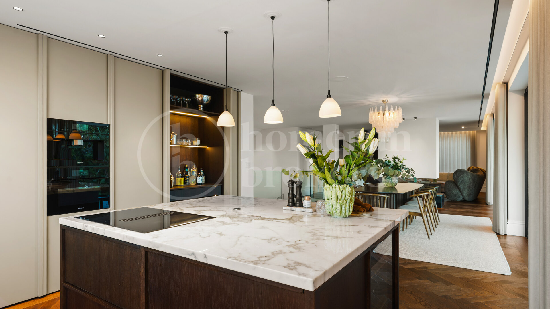 Den huvudsakliga levande nivån är utformad kring en öppen planlayout som förbinder entréhallen med levande, matsal och köksområden, vilket skapar ett praktiskt och sammanhängande utrymme. Stora fönster tillåter naturligt ljus att komma in hela dagen samtidigt som de bildar de omgivande vyerna. Köket är utrustat med Miele-apparater och innehåller en separat dold kock kök, vilket ger ytterligare arbetsyta för underhållning samtidigt som man behåller ett rent och organiserat huvudområde. En torr bar kompletterar ytterligare hemmets sociala layout.