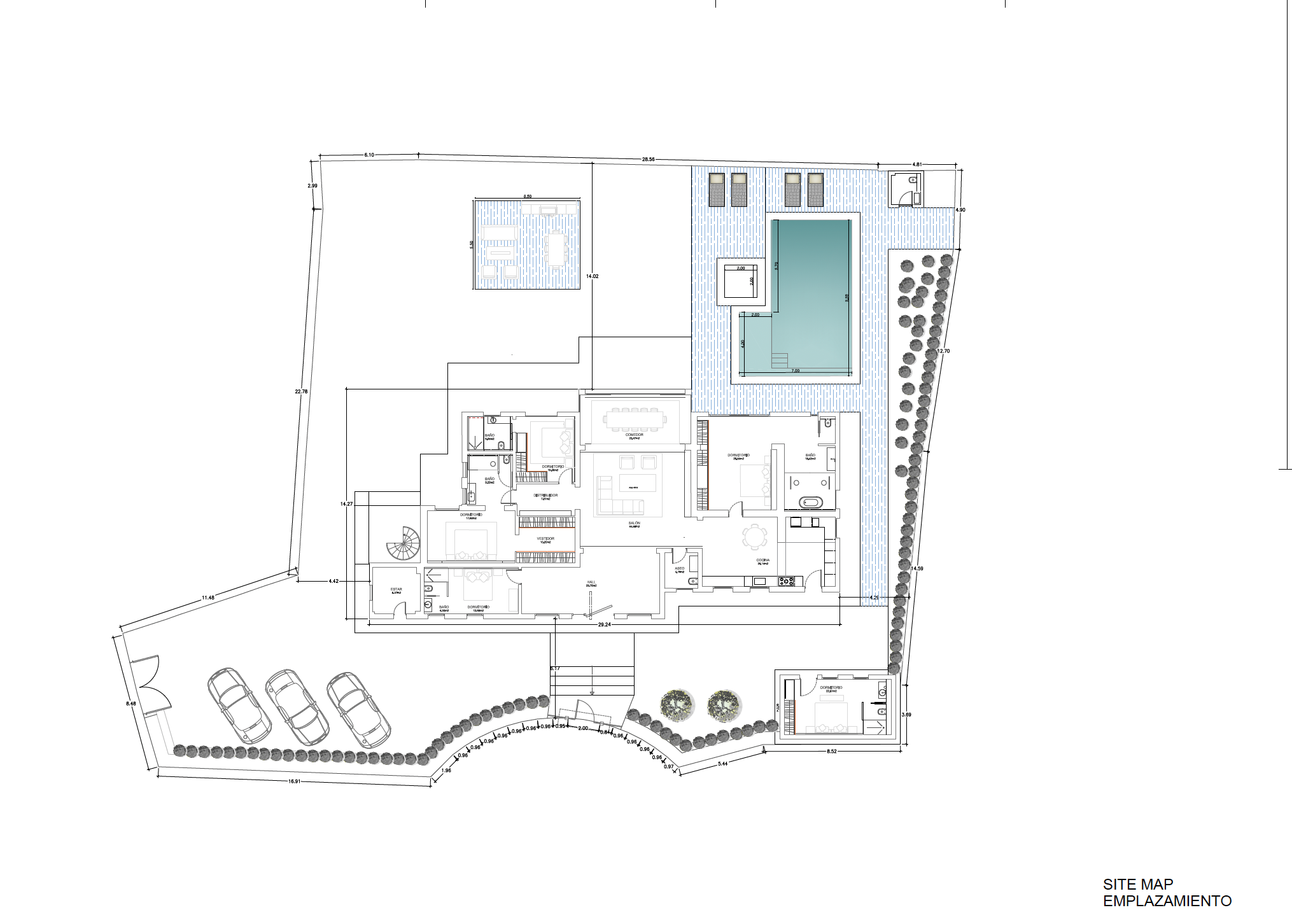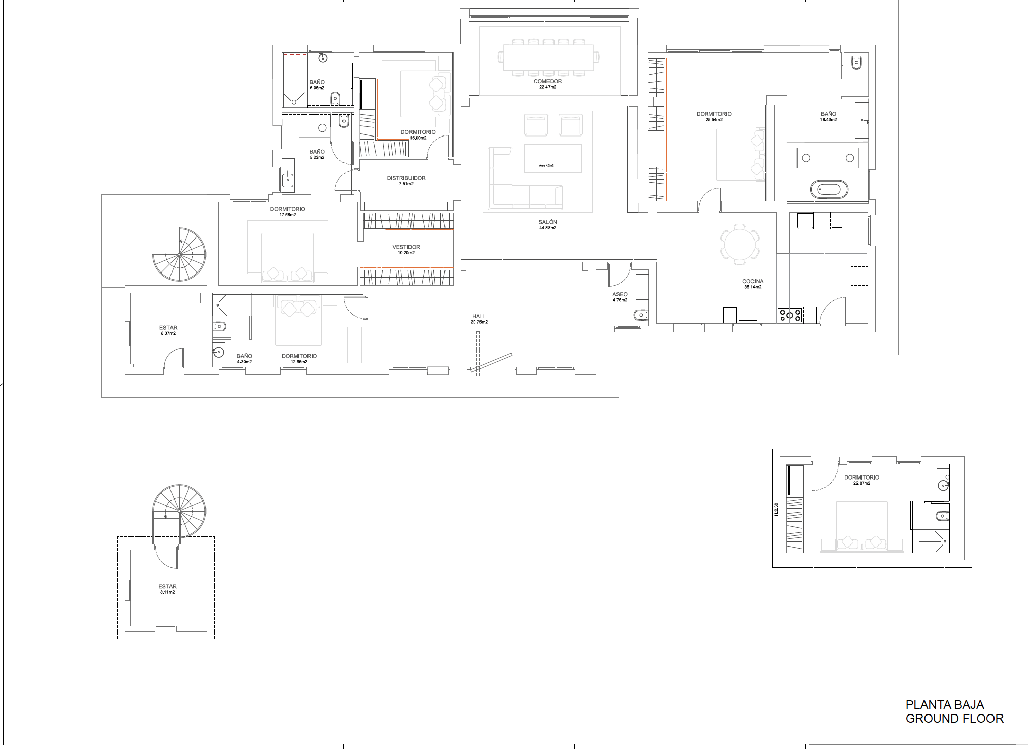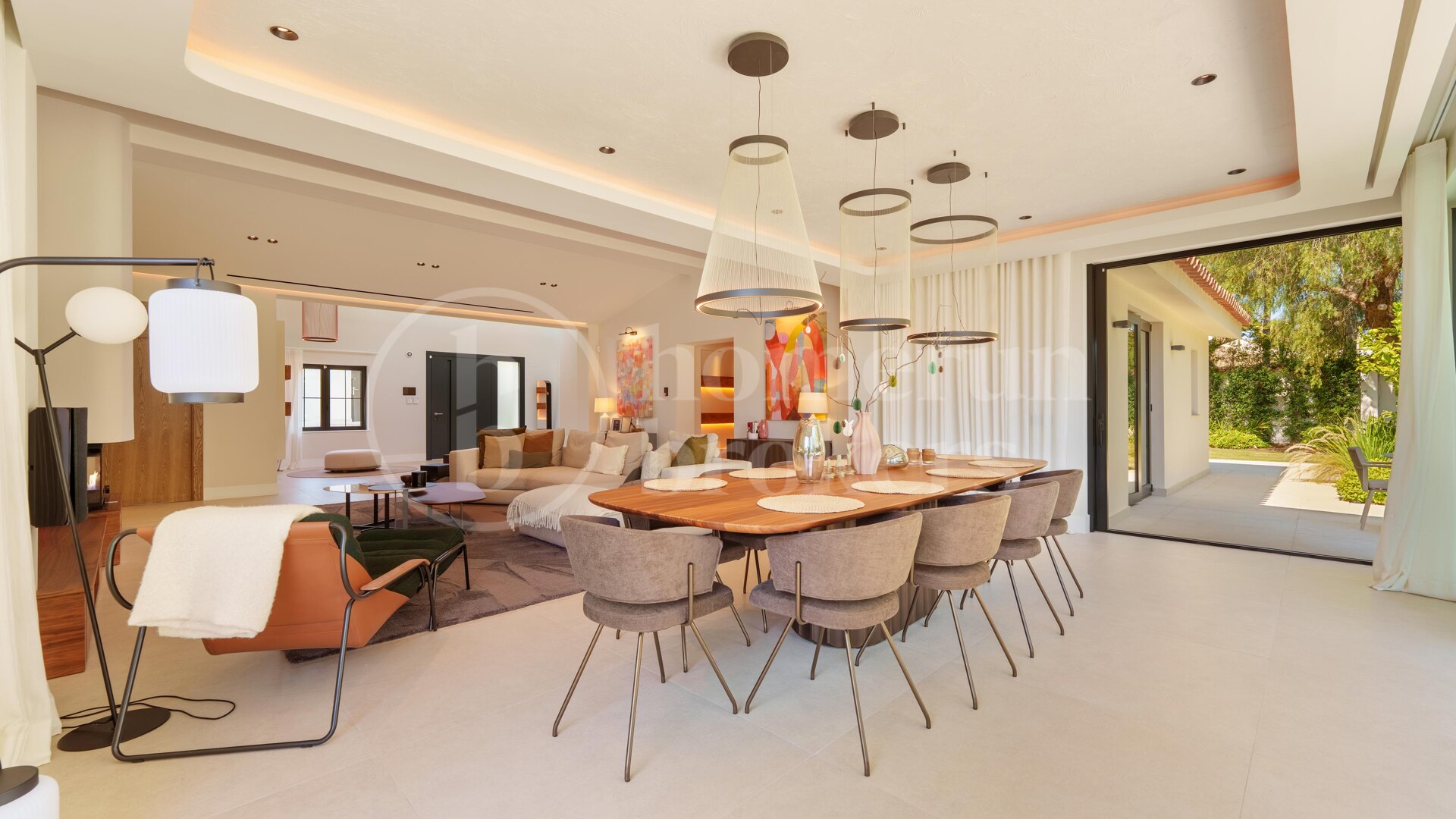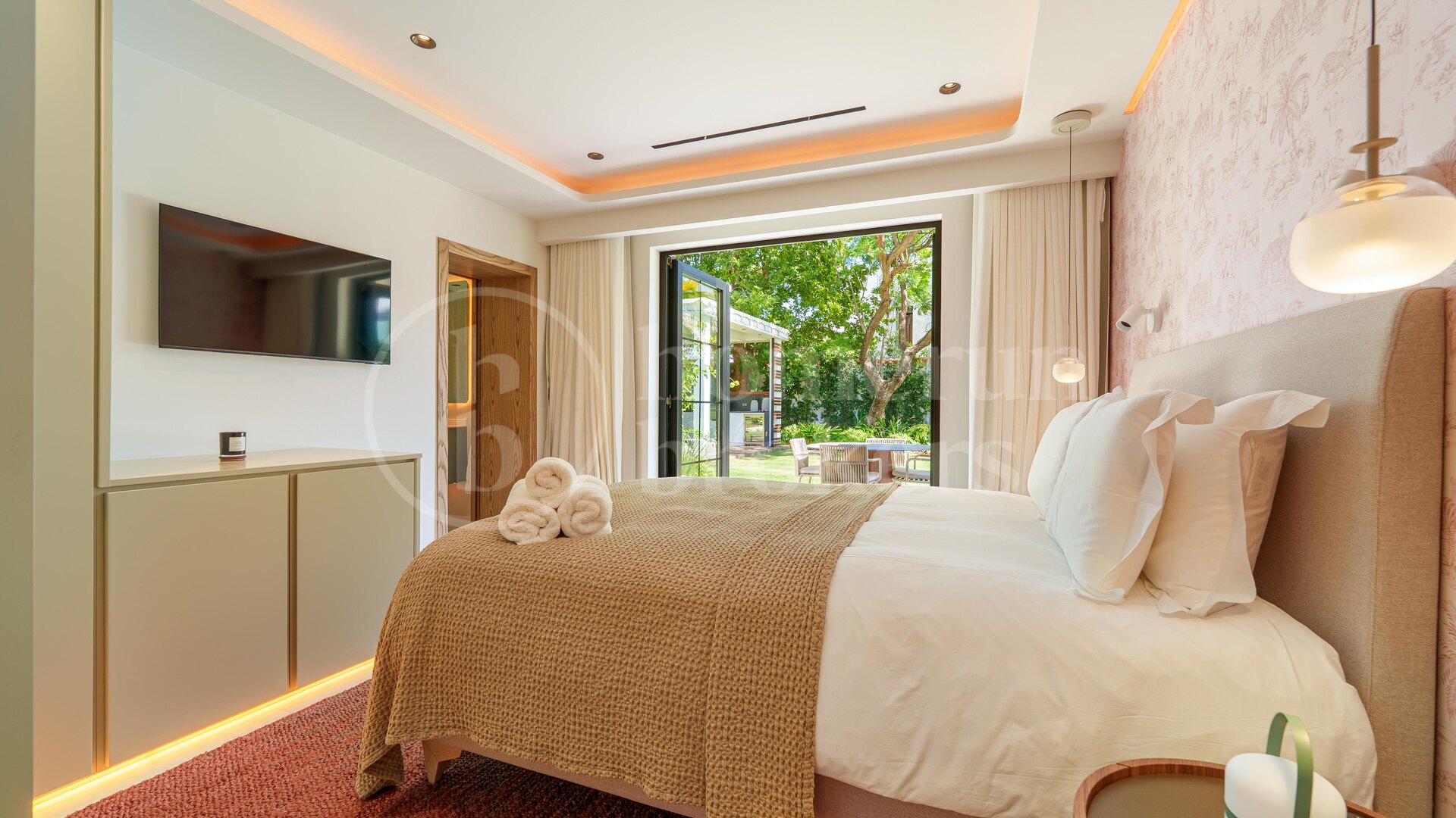 Det finns fem rymliga sovrum i hemmet, alla utformade för att maximera komfort. Master bedroom har direkt tillgång till terrassen och poolen, samt ett lyxigt badrum med fristående badkar och dusch. Alla rum är noggrant utformade för att skapa en lugn och harmonisk känsla.