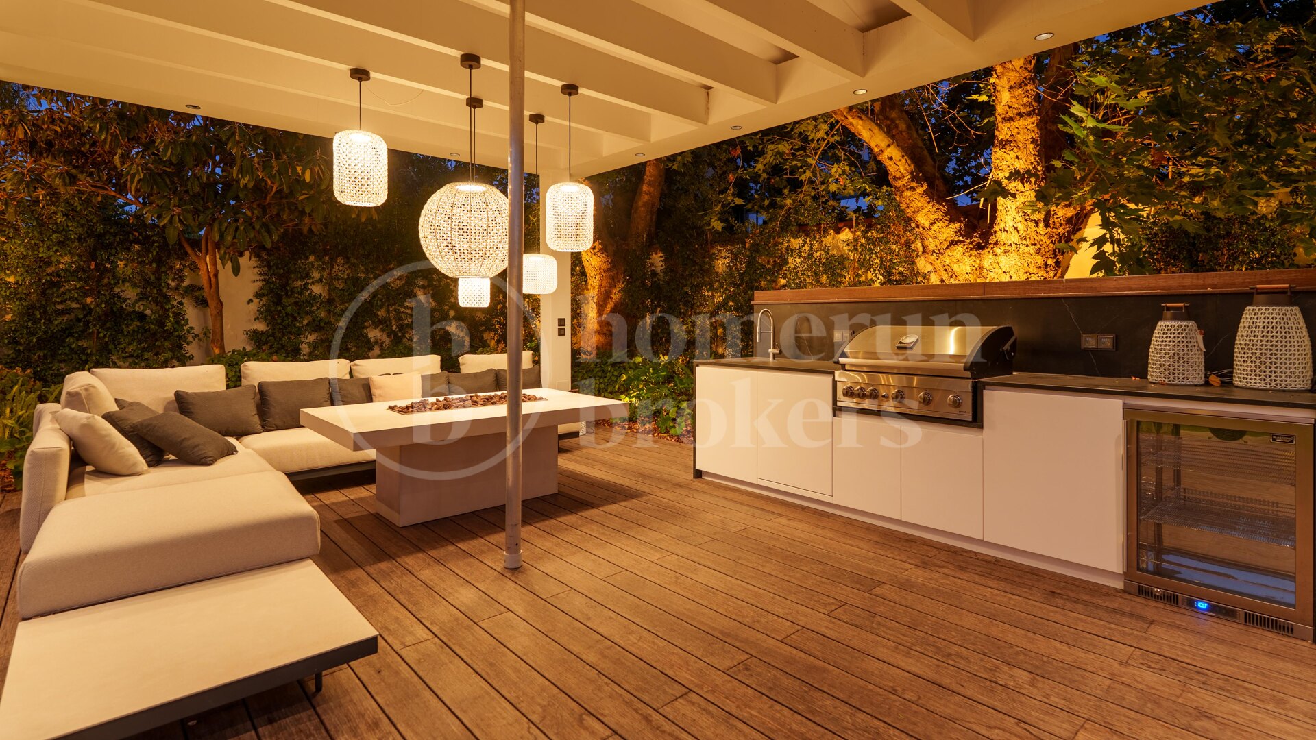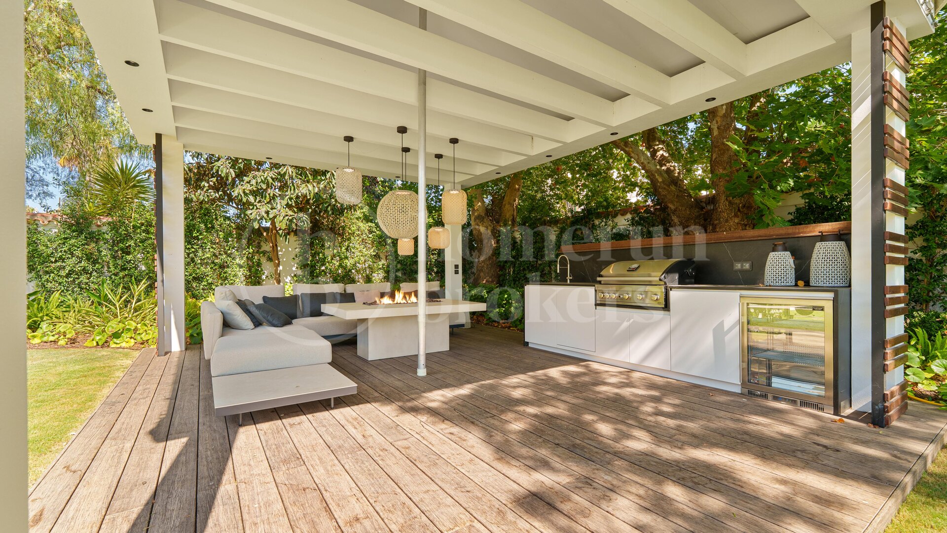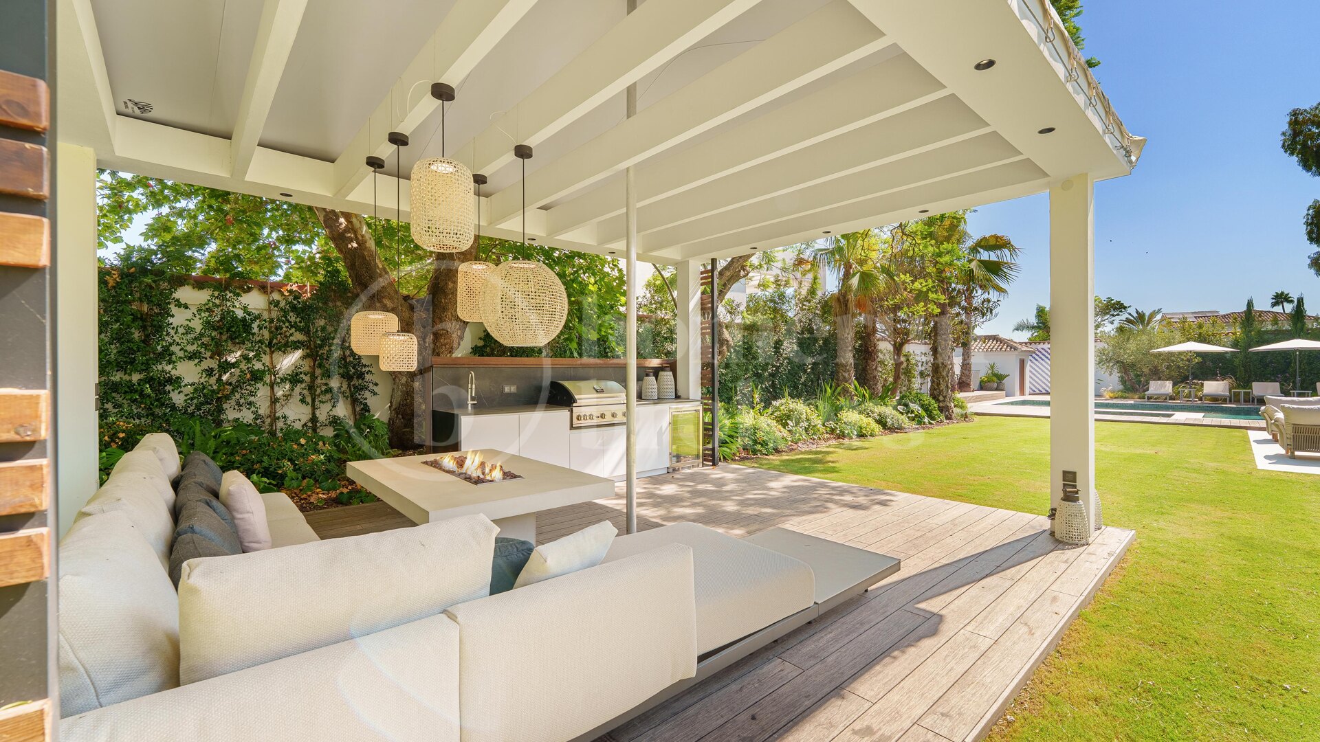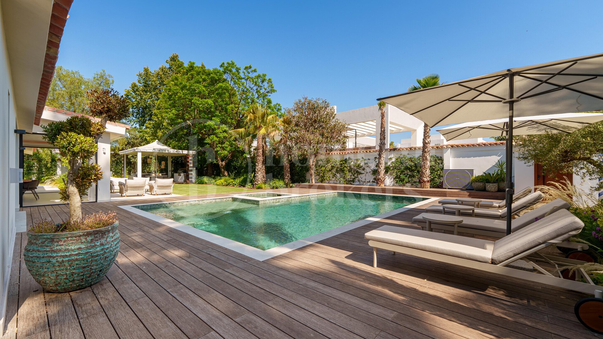 Utomhus bjuder trädgården på en uppvärmd pool och jacuzzi, omgiven av bambu- och trätrall. Det finns ett fullt utrustat utekök med grill, flera loungeytor, och en stilren pergola med italienska designmöbler. Dessutom finns utedusch, separat pool-wc och ett automatiskt bevattningssystem.