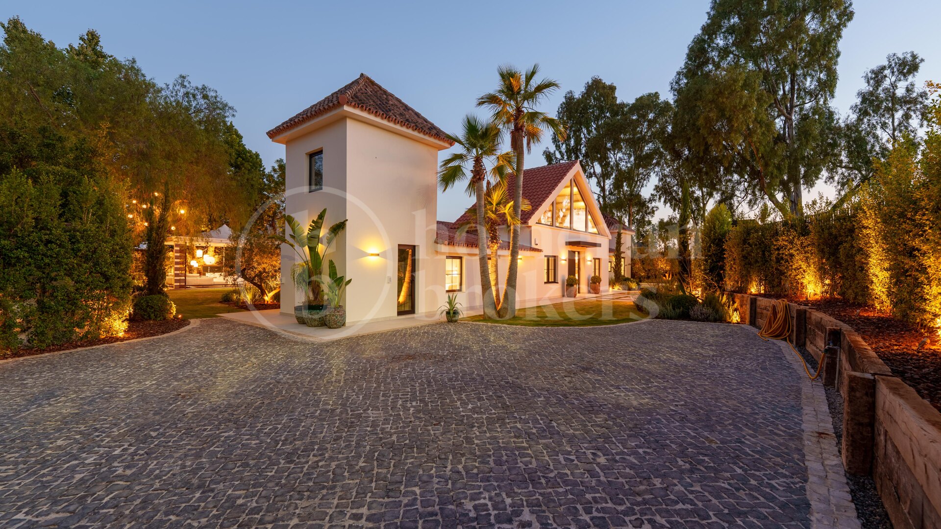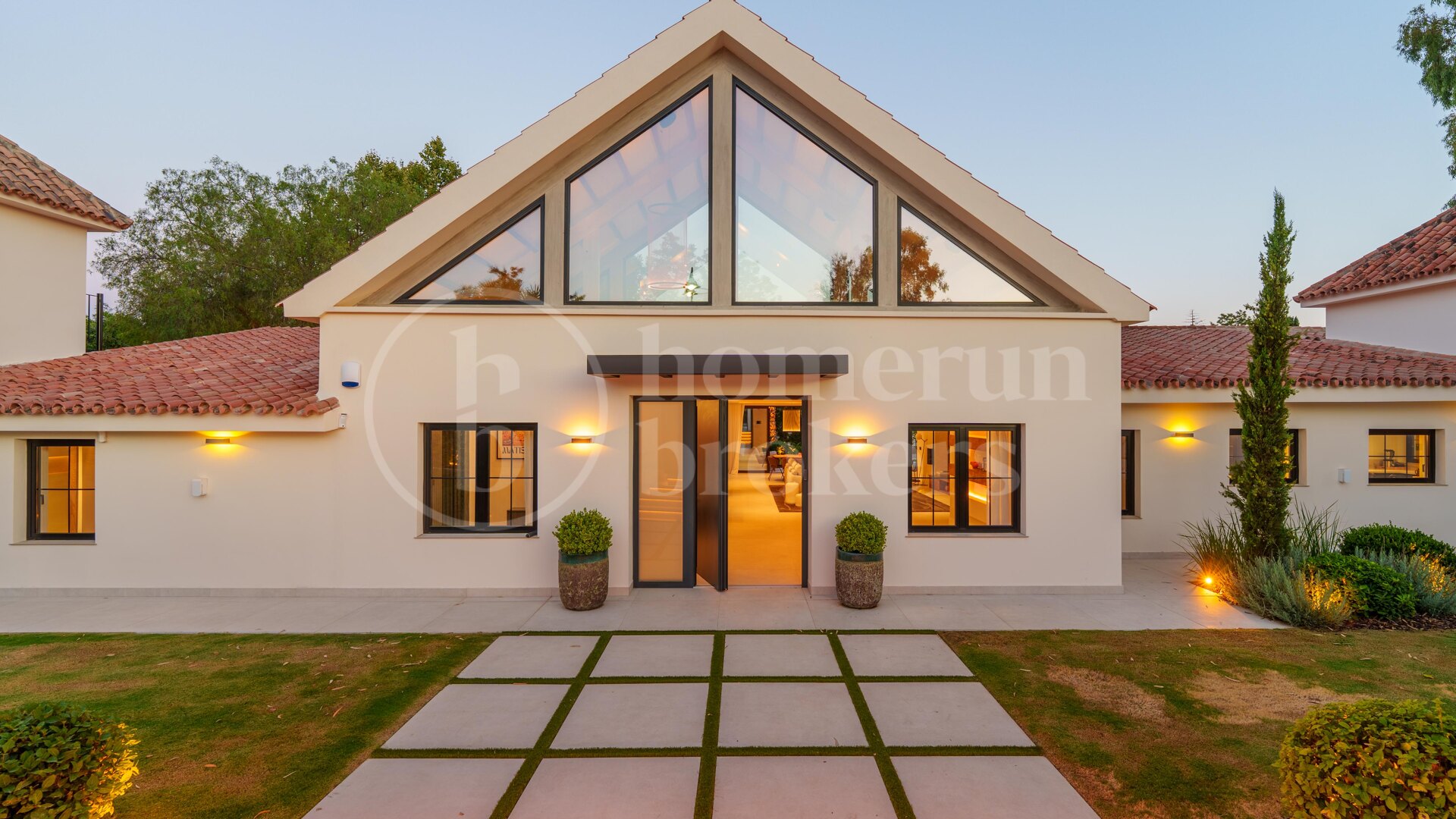 Det smarta hemsystemet gör det möjligt att styra ljus, klimat, ventilation och gardiner direkt via mobil eller surfplatta. Andra exklusiva detaljer inkluderar golvvärme, säkerhetssystem, eldstad, förvaringsrum samt en uppfart klädd i portugisisk sten.