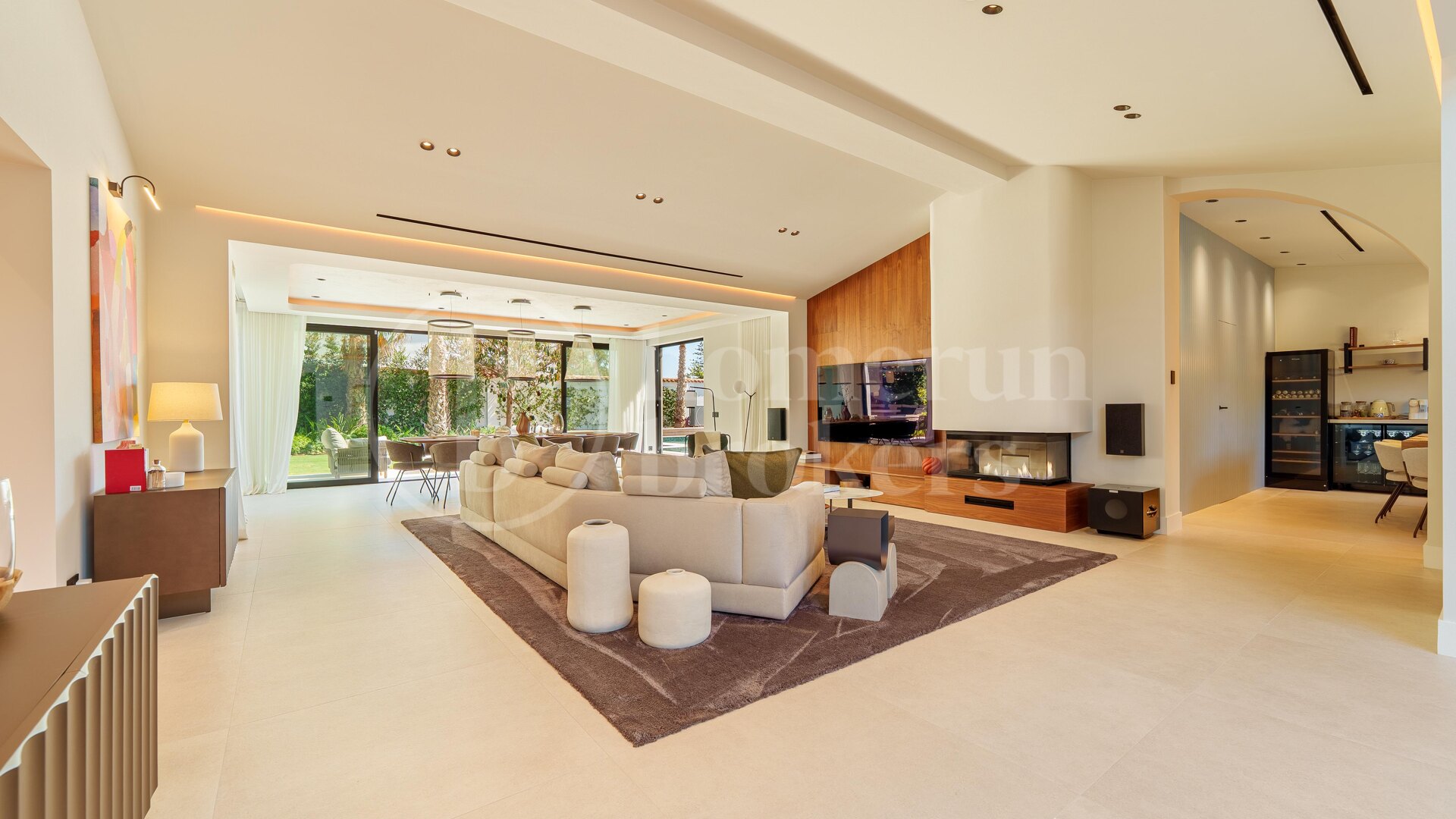 En pampig entréhall med dubbla takhöjder och geometriska linjer sätter tonen för villans inre. Golv-till-tak-fönster i tyskt aluminium ger både ljusinsläpp, isolering och säkerhet. Planlösningen är öppen och inkluderar ett elegant vardagsrum, ett modernt kök med central ö och premiumutrustning samt en matplats med öppen spis och skräddarsydd inredning.
