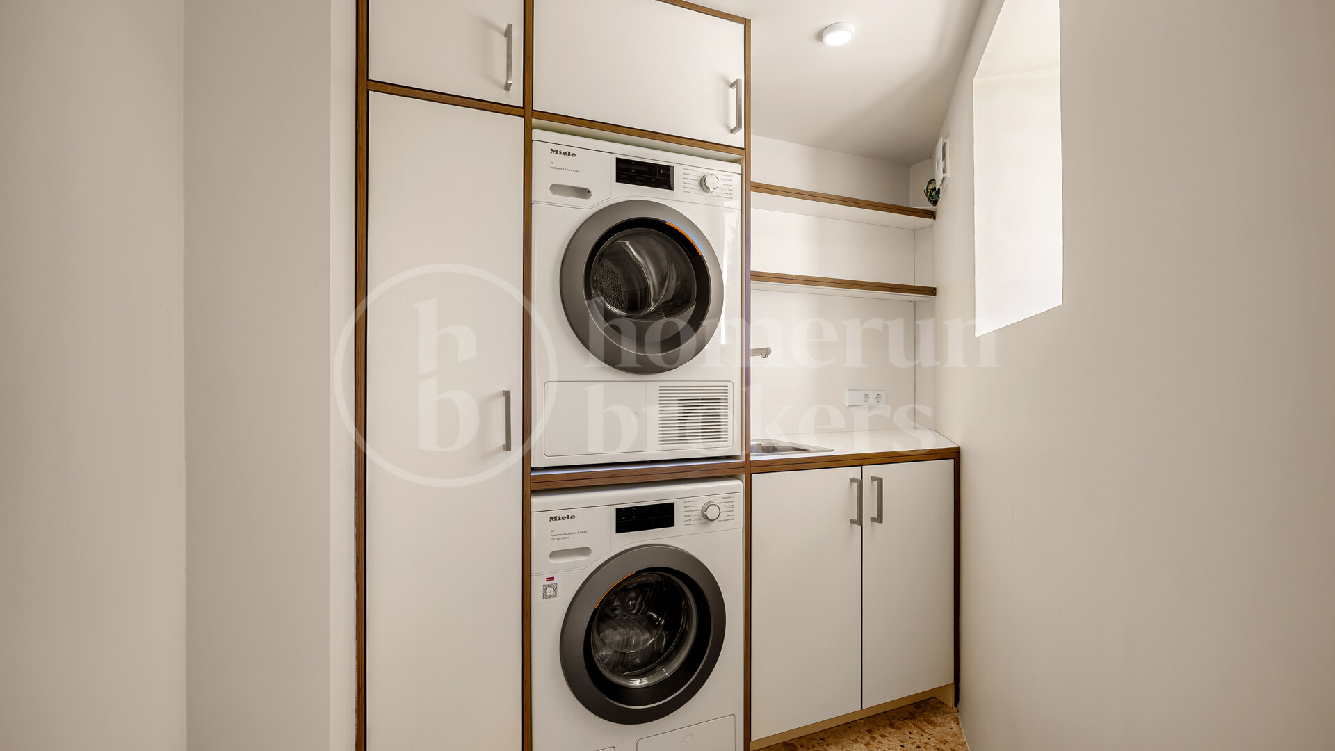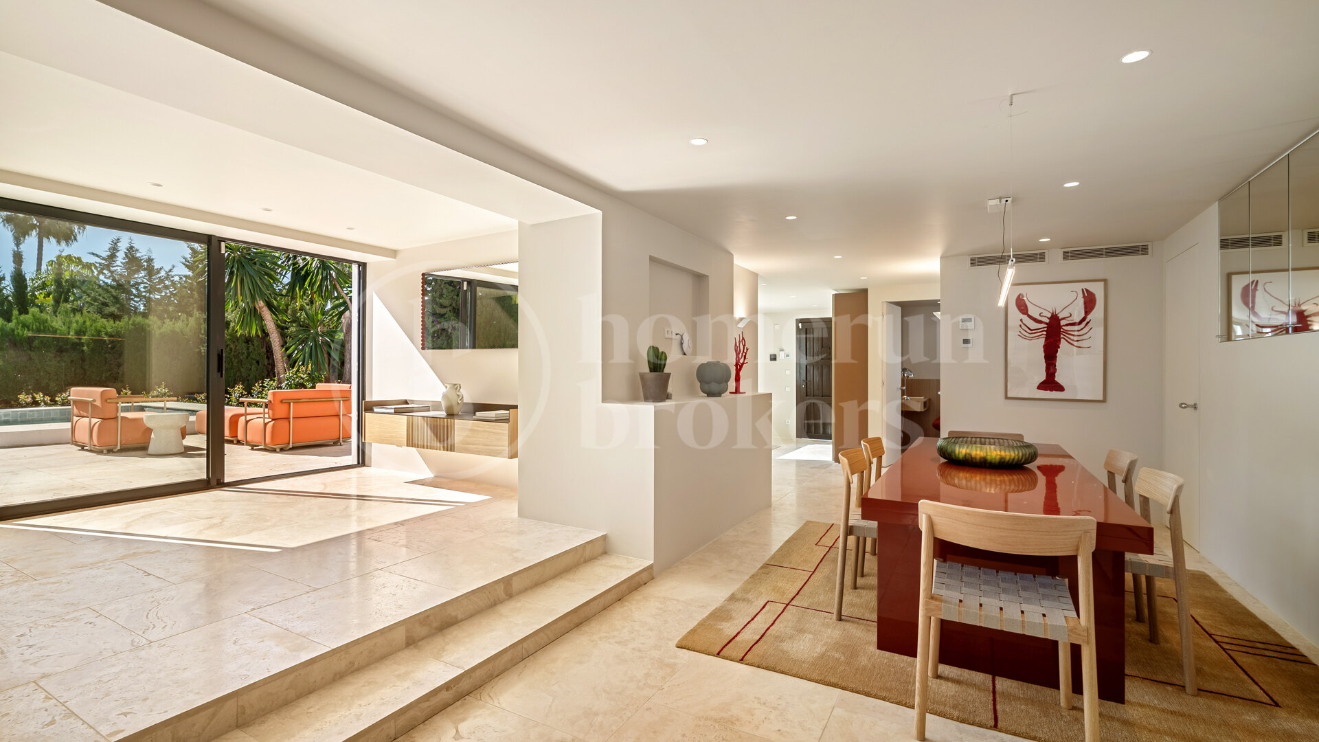Villans hjärta är köket från Ernesto Meda, utrustat med Miele-apparater och armaturer från Fantini Rubinetti (Italien). Köket smälter sömlöst samman med matsal och vardagsrum och öppnar ut mot terrass och pool. Varje detalj är noggrant utvald: från de arkitektoniska dörrsystemen som försvinner i designen, till de italienska inbyggda garderoberna med modulär flexibilitet och högkvalitativa ytor. Även de över 100 år gamla italienska handtagen bidrar med ergonomi och stilren estetik.
