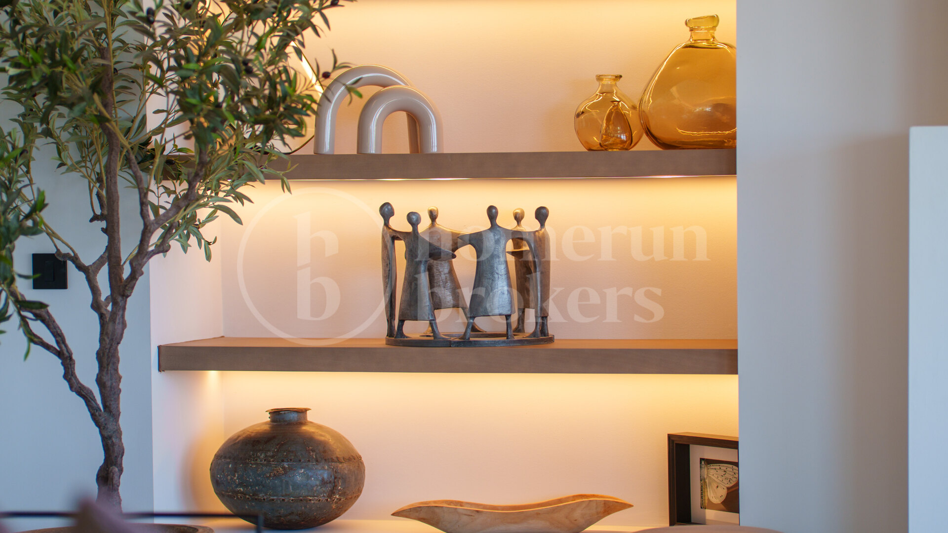 Inne, Villa Alba blandar minimalism med värme. Neutrala paletter, natursten, mjuka trä finish och anpassade möbler definierar en lugn men lyxig estetik. Golv till tak fönster ram svepande vyer, och handvald belysning och hantverksinredning förbättrar villans unika identitet. Varje detalj – från materialets textur till den subtila integreringen av lagring och hyllor – återspeglar exceptionellt hantverk och uppmärksamhet på balans.