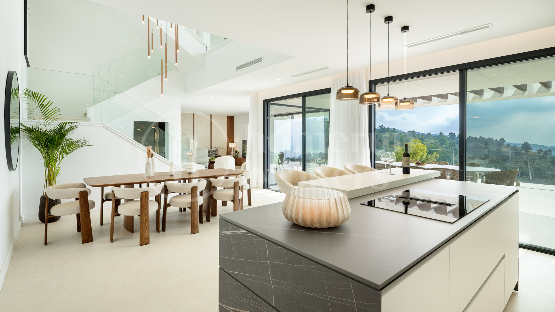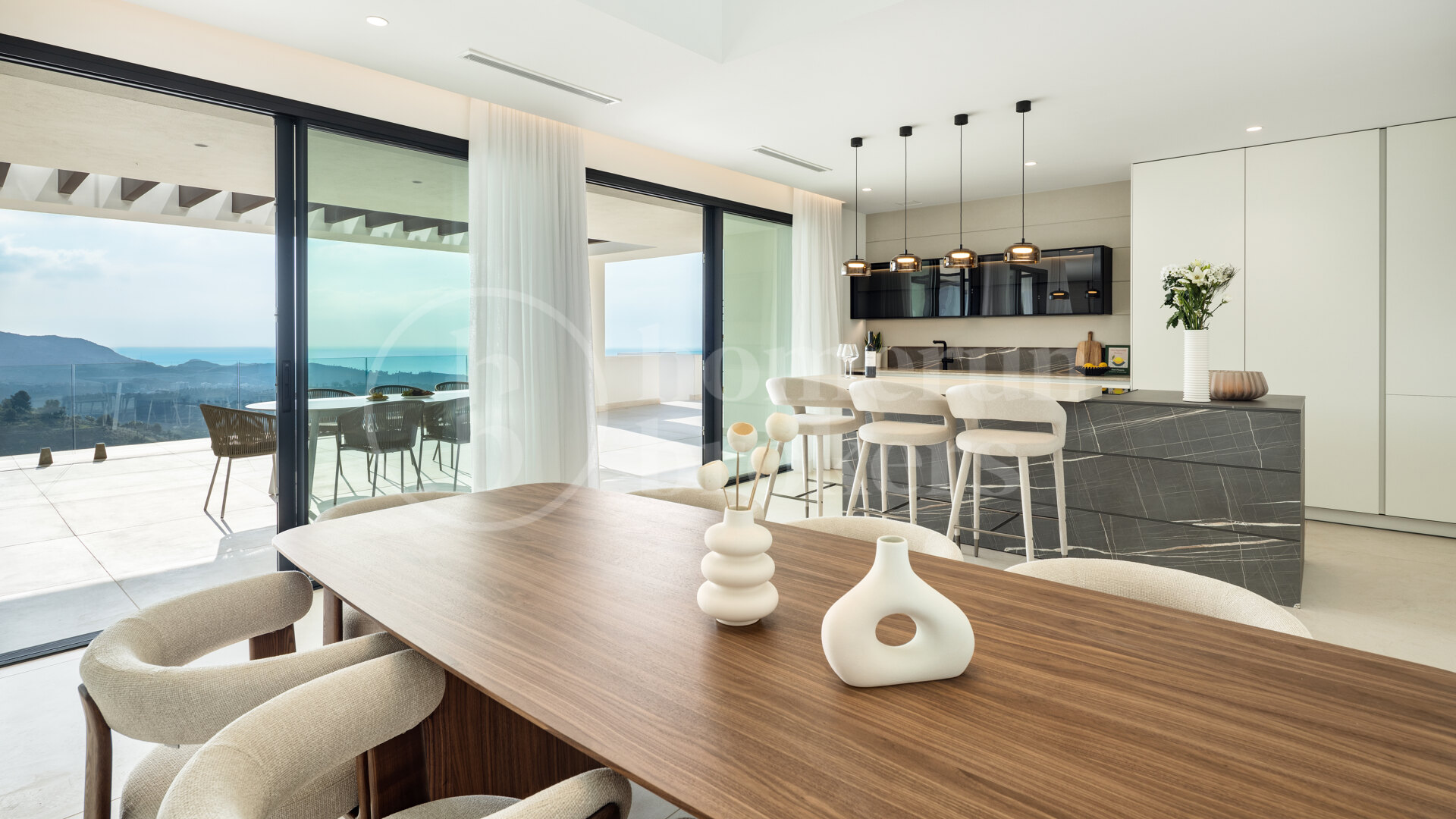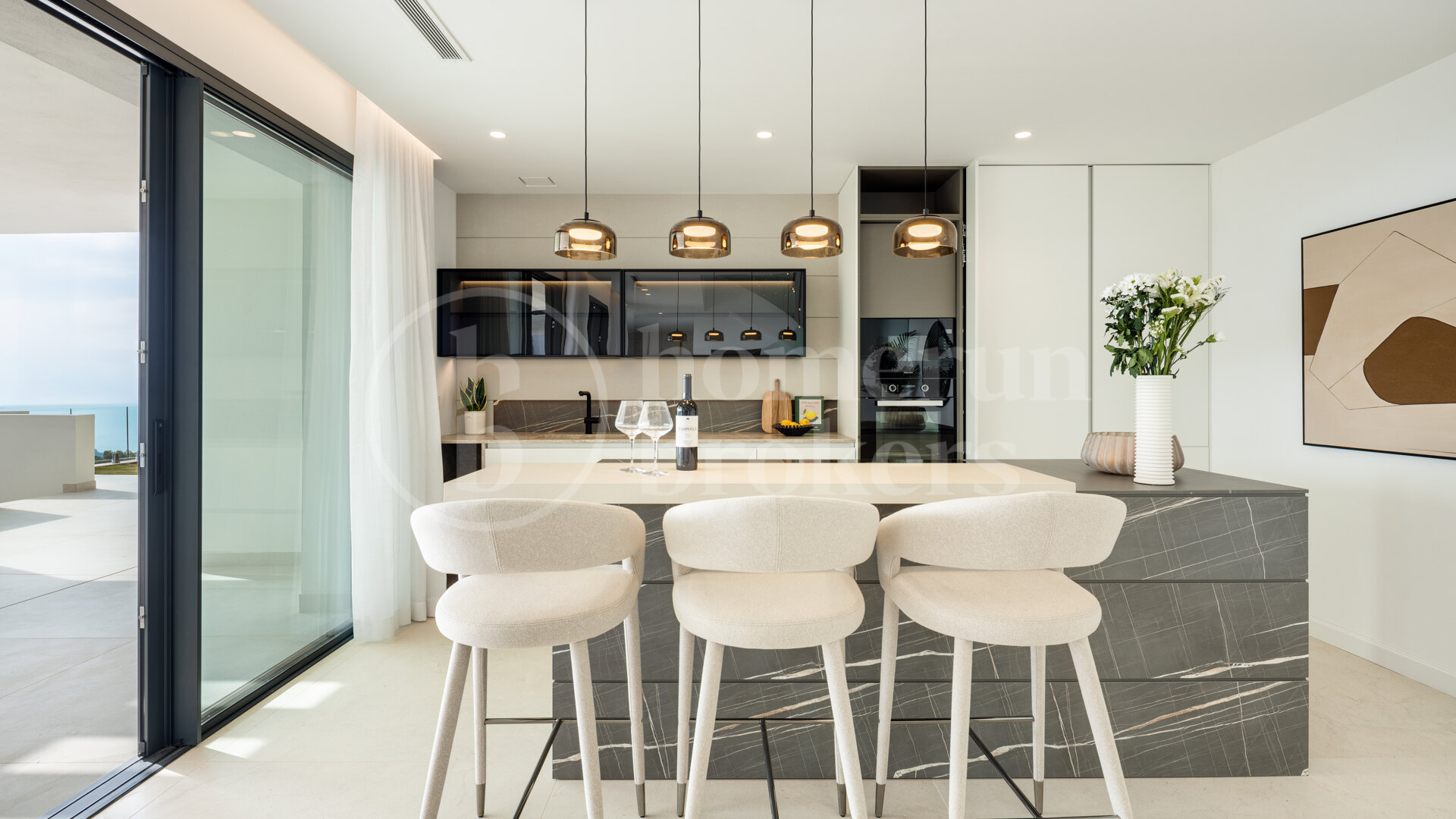 Huvudytorna för vardagsrum, matplats och kök ligger på den nedre nivån i en öppen planlösning. Här finns också en gästtoalett, perfekt när man har besök. Köket är ett av villans riktiga höjdpunkter, designat av Moldunova och utrustat med Ritmonio-blandare – en kombination av modern stil och utmärkt hantverk. De stora fönstren släpper in rikligt med dagsljus och ramar in den fantastiska utsikten över havet och kullarna.