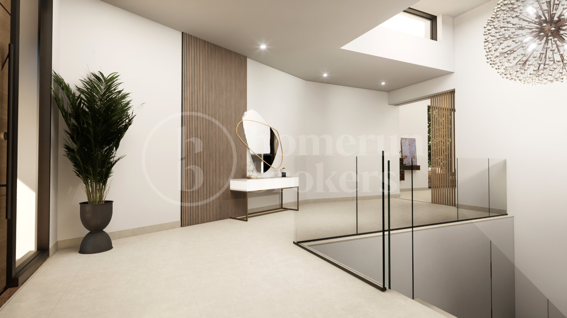Villan har en total byggyta på 879 kvadratmeter, med 550 kvadratmeter inomhusyta kompletterad av generösa 329 kvadratmeter terrasser. Fördelad över tre genomtänkt planerade våningar prioriterar planlösningen utrymme, ljus och integritet. Fem eleganta sovrum, vart och ett med eget badrum, säkerställer att både familjemedlemmar och gäster åtnjuter fullständig komfort. En gästtoalett ger extra bekvämlighet vid sociala tillställningar. Med sitt sydvända läge fylls hemmet av naturligt solljus och erbjuder vidsträckta vyer över de omgivande bergen och det frodiga landskapet.