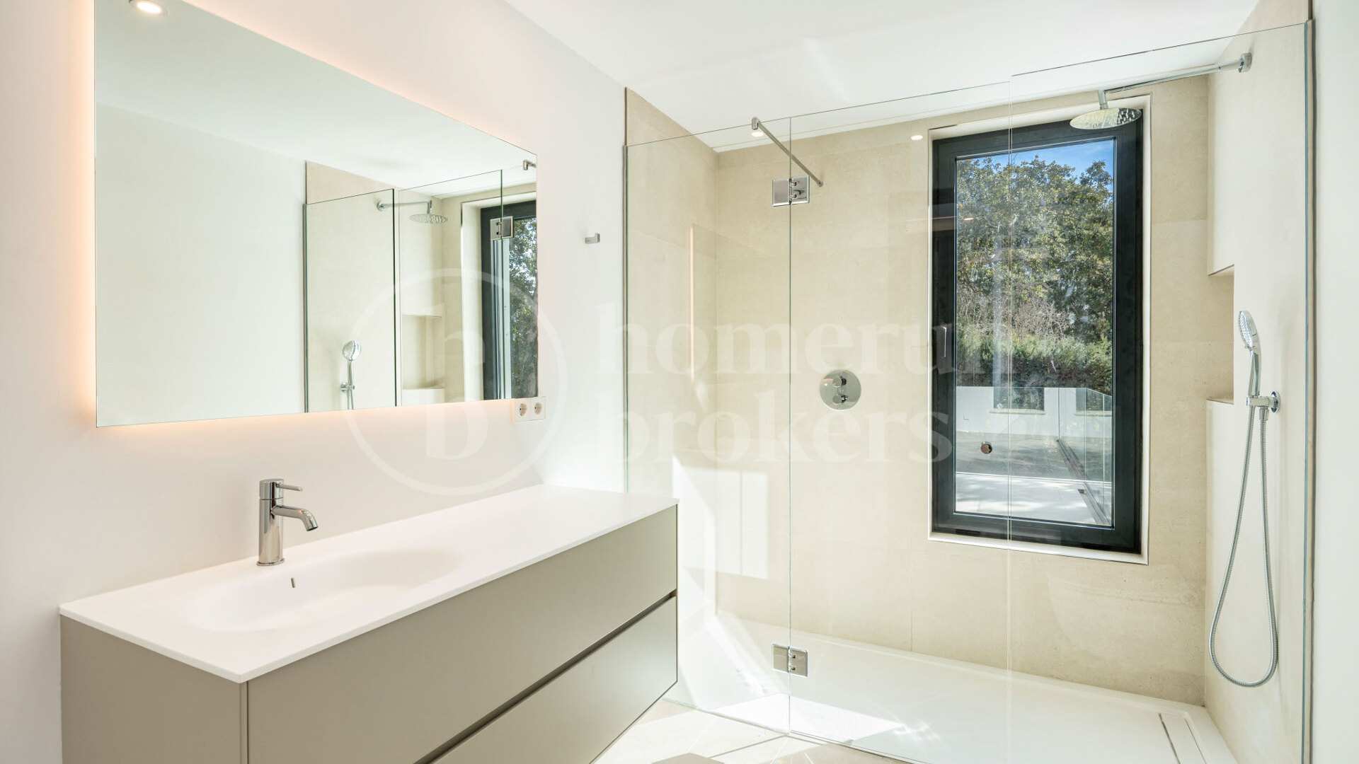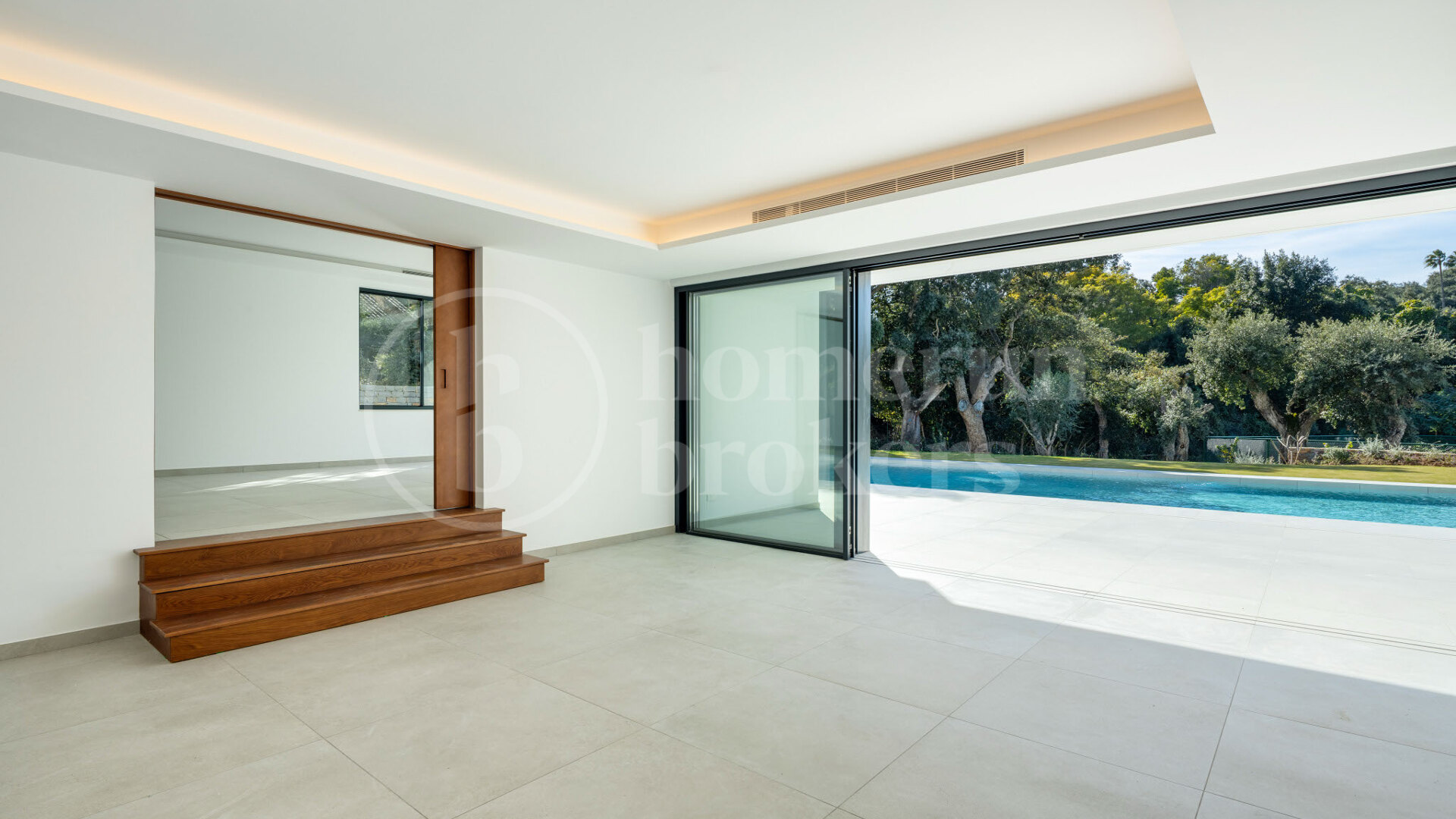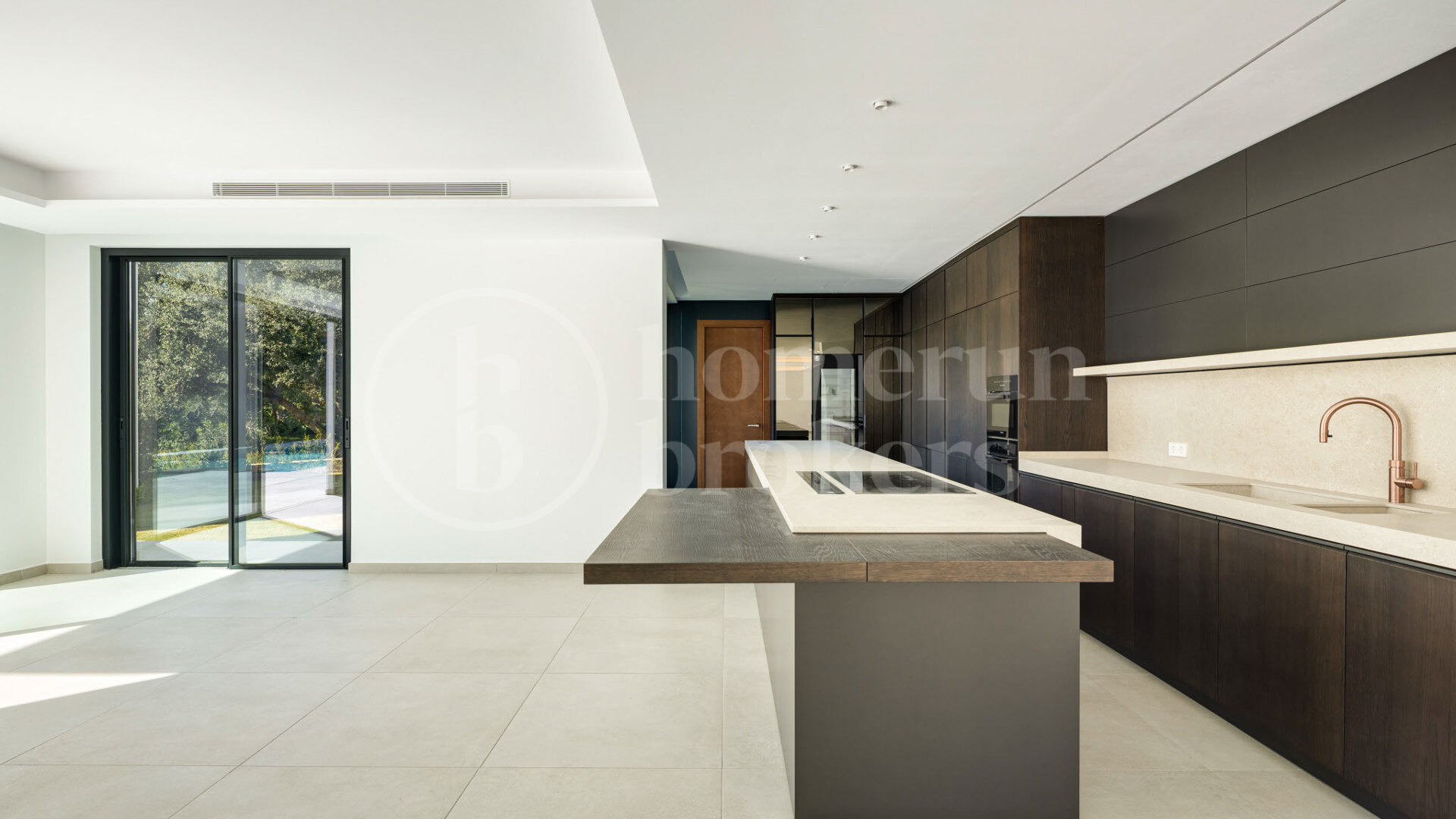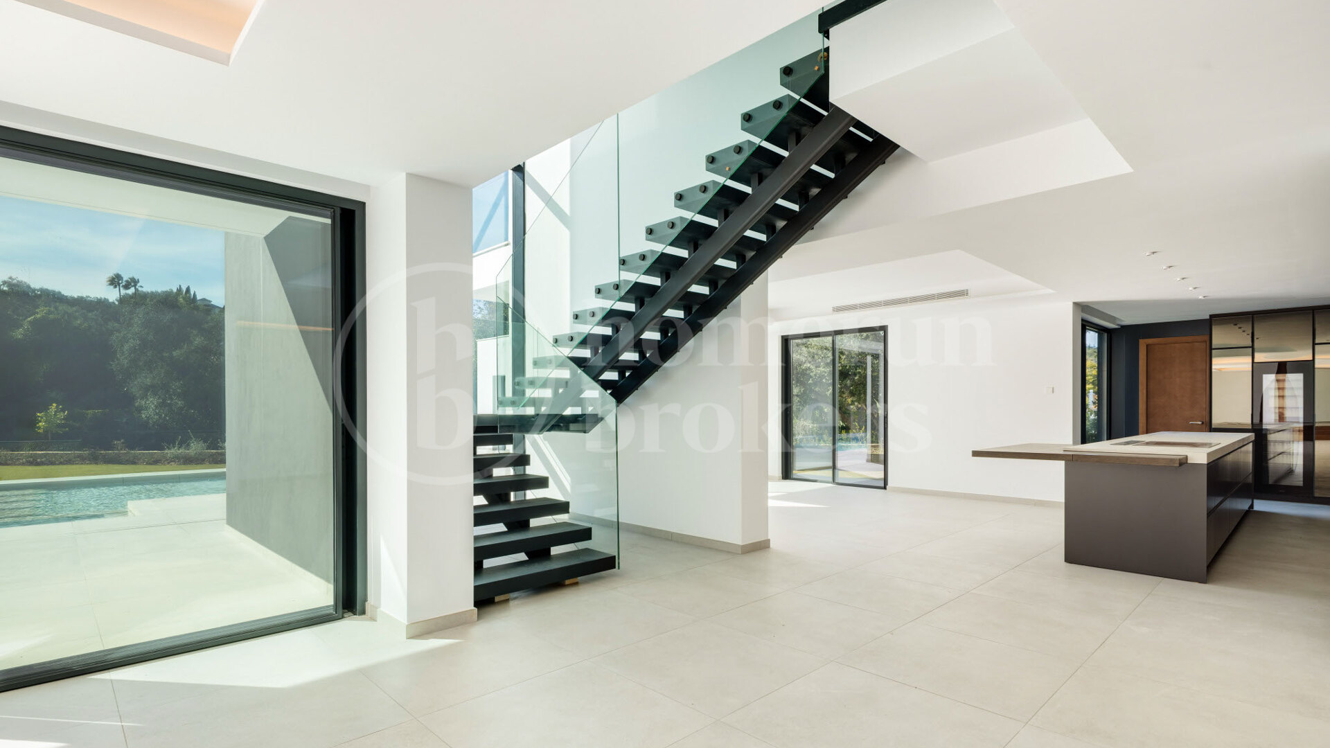Interiören är modern med en neutral färgpalett och exklusiva materialval. Köket är öppet och fullt utrustat med förstklassiga Miele-apparater – perfekt för både vardagsbruk och sociala tillställningar. Huset är utrustat med golvvärme, luftkonditionering, ett avancerat domotiskt styrsystem och en hiss för fyra personer som går hela vägen upp till takterrassen.