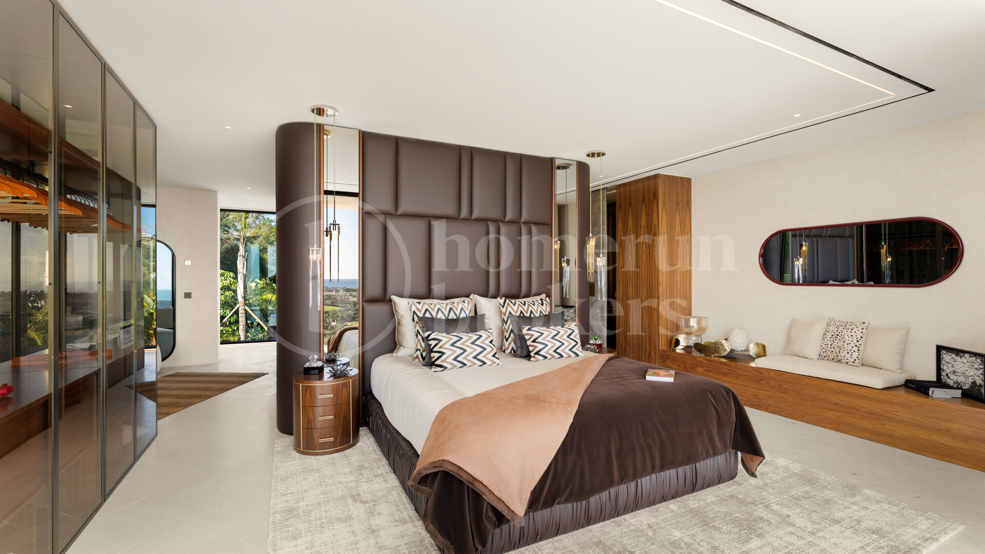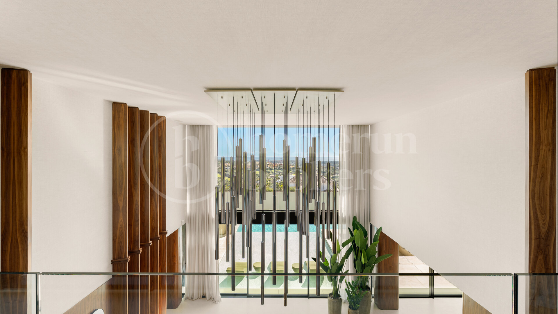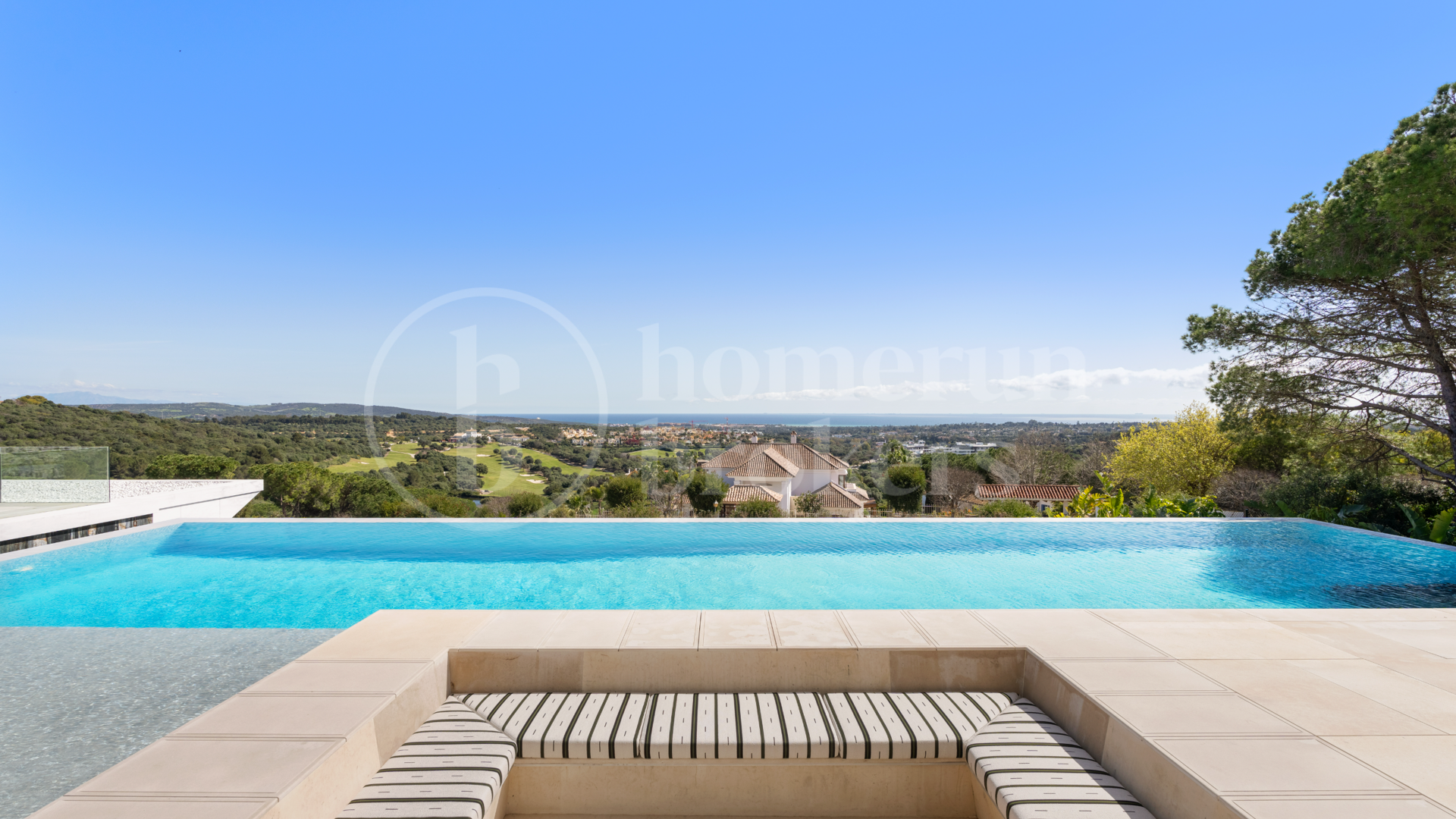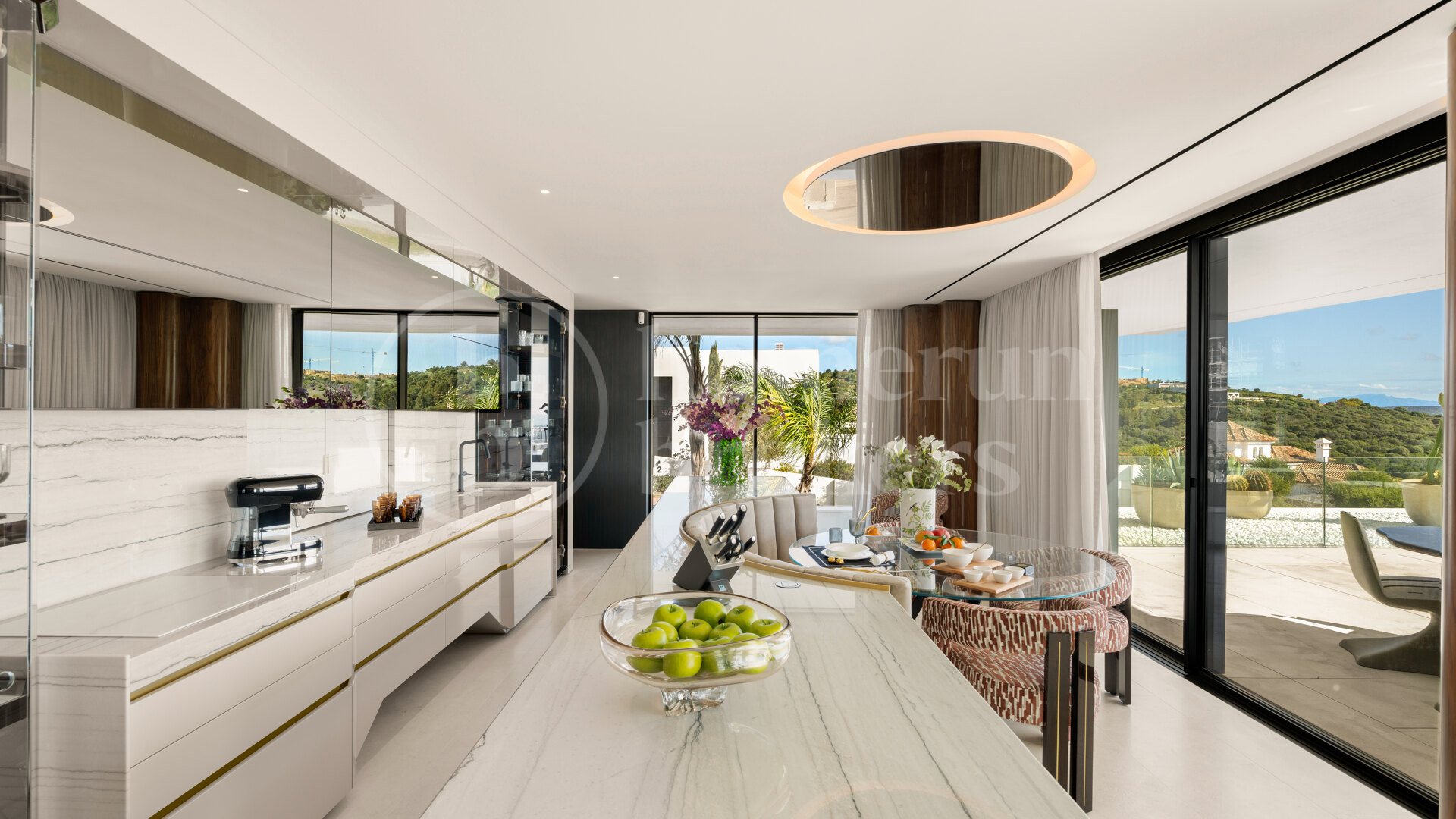 De viktigaste bostadsområdena flödar utan ansträngning på expansiva terrasser, vilket skapar en idealisk miljö för både lugn avkoppling och sociala sammankomster. Utomhusområden är utformade för året runt användning, med en saltvattenbassäng omgiven av anlagda trädgårdar och soldränkta terrasser som gynnas av fastighetens orientering, vilket garanterar naturligt ljus hela dagen och in på kvällen. Från flera utsiktsplatser sträcker sig öppna vyer över golfbanan mot Medelhavet och erbjuder en känsla av öppenhet och lugn.