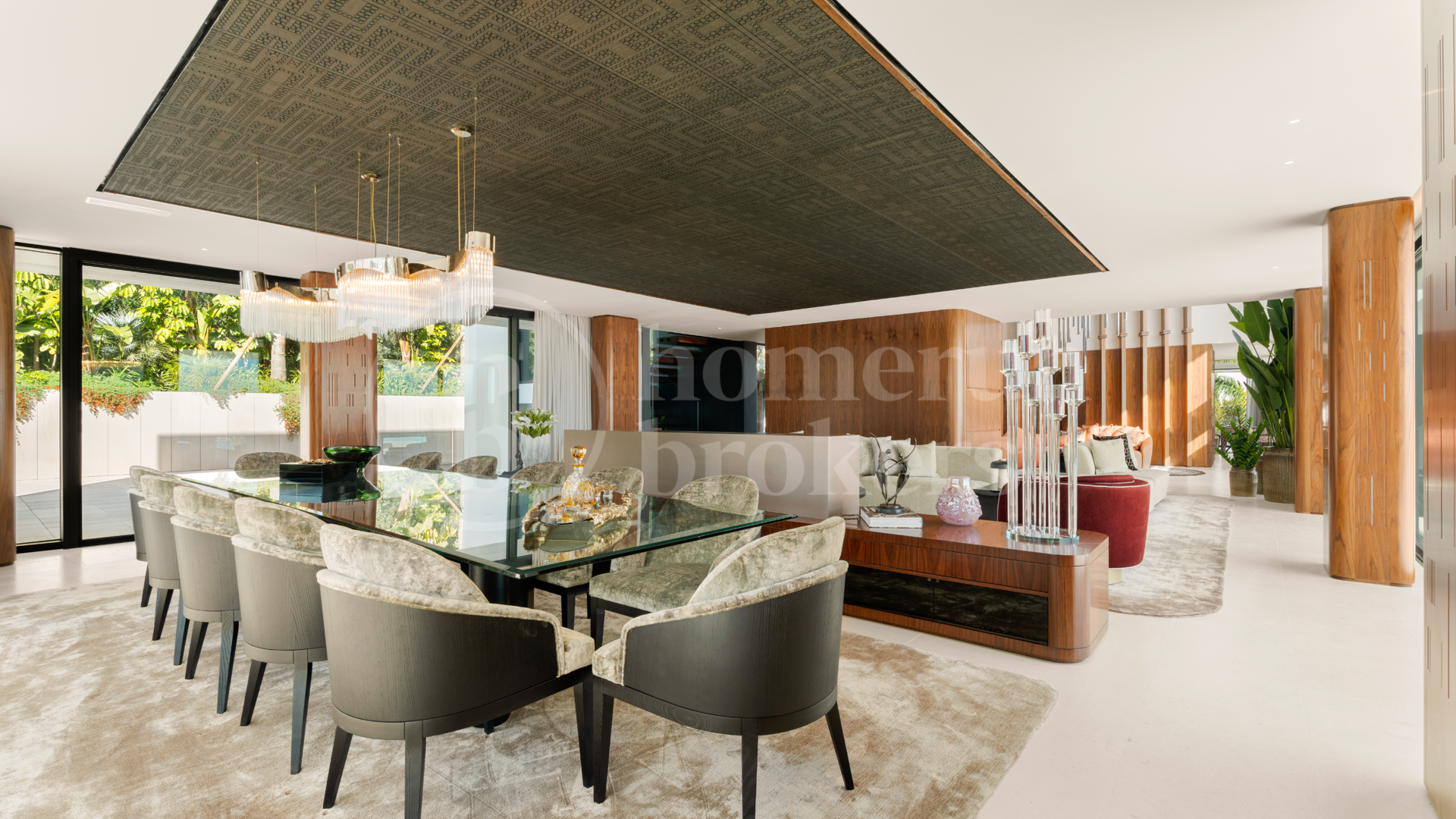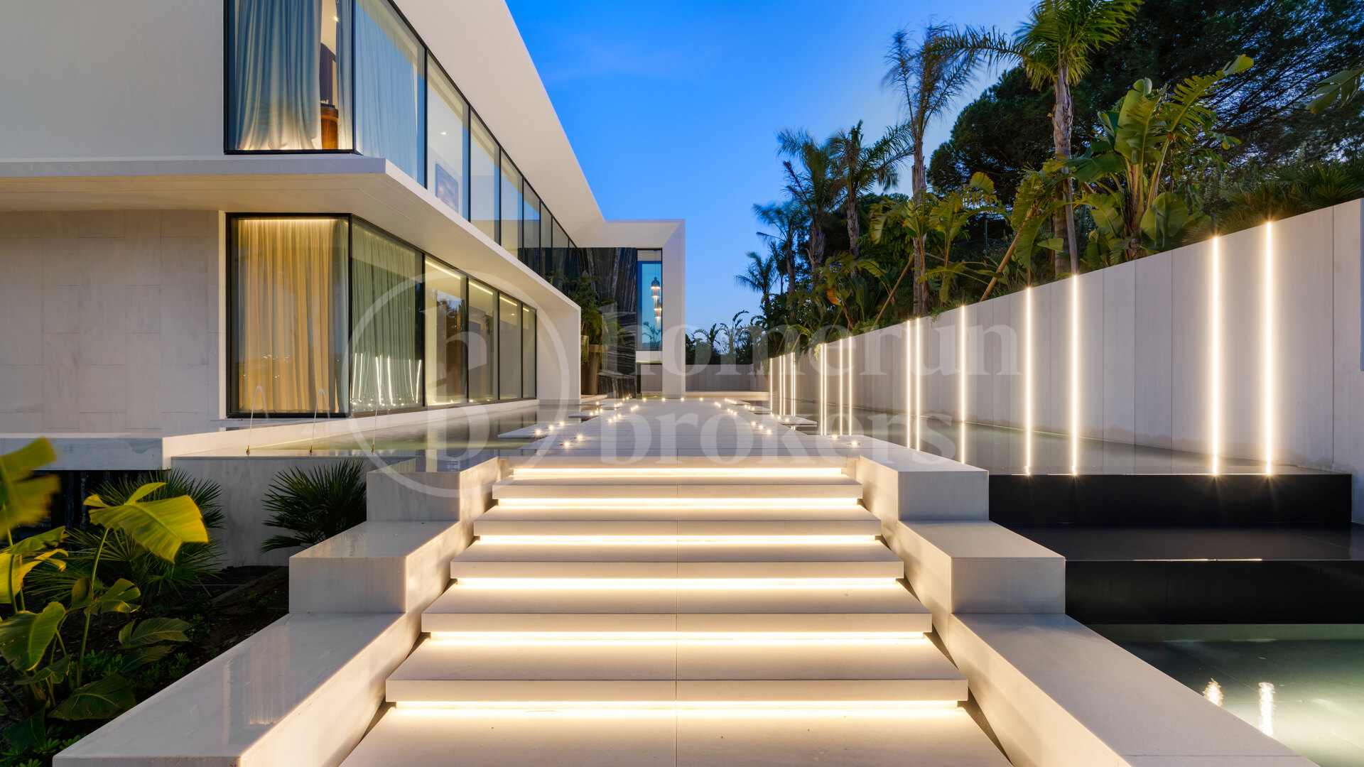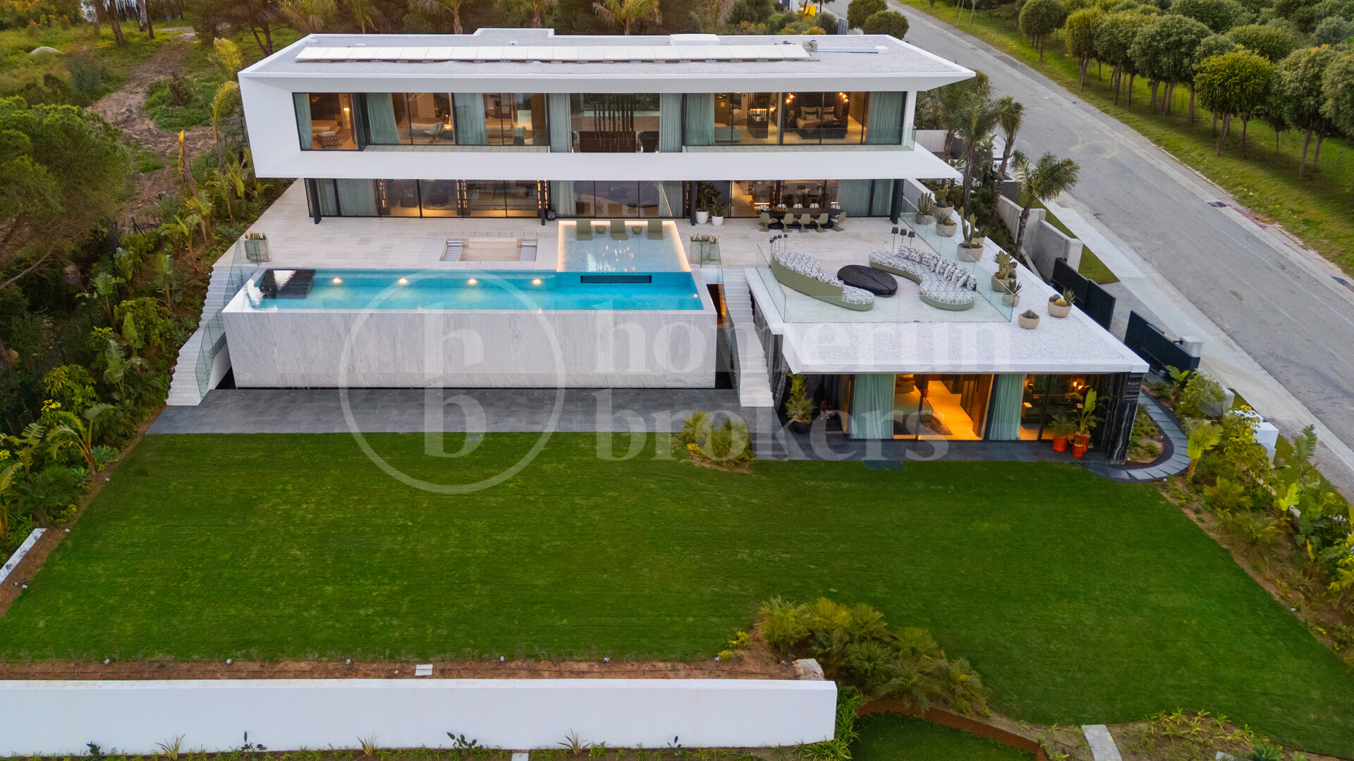 Villa till salu i La Reserva de Sotogrande, som erbjuder 6 sovrum med en-suite badrum, 2 gästtoaletter, 921 m2 byggt område, 192 m2 terrasser och en 2,635 m2 tomt med sydväst orientering och panoramautsikt över golf och hav. Denna moderna fastighet är utformad med fokus på rymd, naturligt ljus och sömlös inomhus-utomhus levande, kombinerar rena arkitektoniska linjer med högkvalitativa material och skräddarsydda ytor. Full-höjd glasering förbättrar kopplingen mellan inre levande områden och de omgivande terrasserna, vilket gör att landskapet blir en del av den dagliga upplevelsen. Layouten är noggrant planerad att ge både integritet och funktionalitet, medan en hiss ansluter alla nivåer av hemmet för ökad komfort och tillgänglighet.