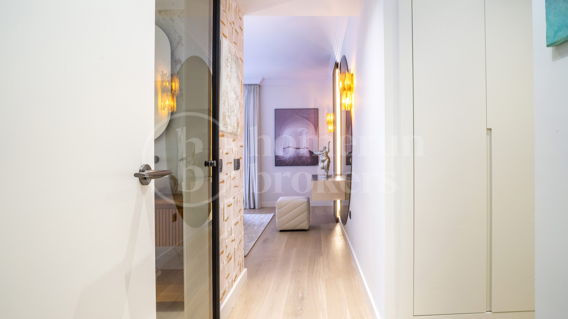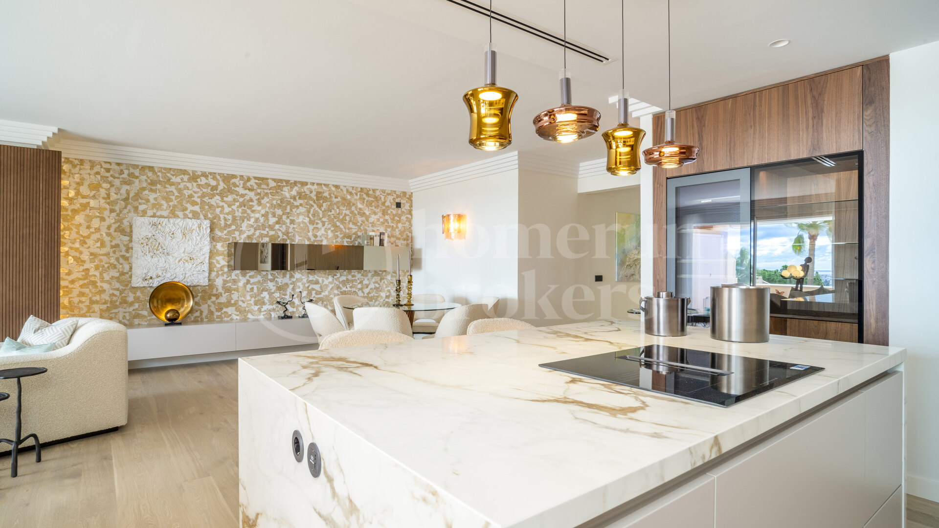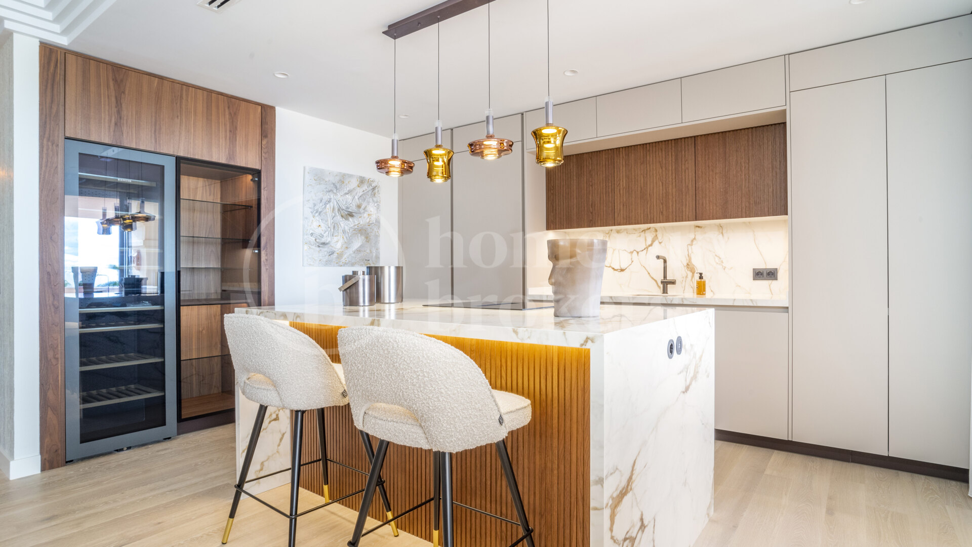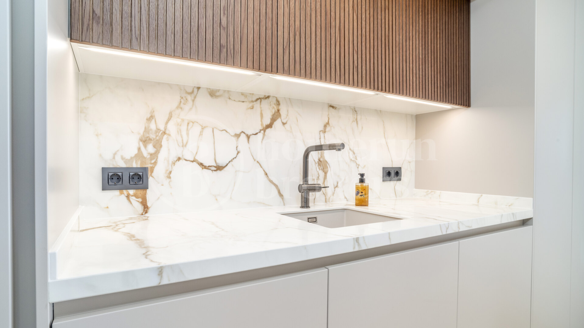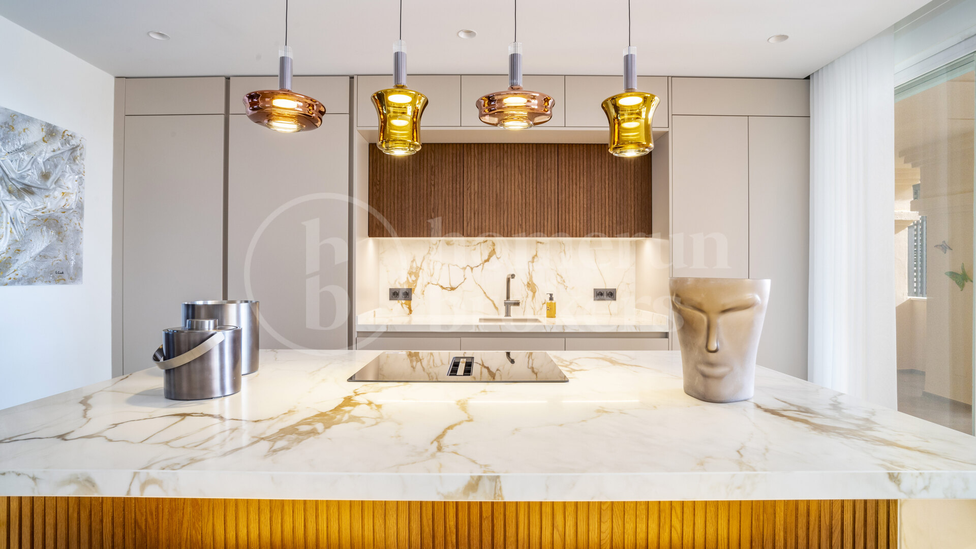 The layout has been carefully planned to ensure a seamless living experience. A bright and generous living area connects directly to the terrace, creating a unified space suited for both indoor relaxation and outdoor entertaining. The terrace is one of the standout features of the property, offering uninterrupted views and forming an ideal backdrop for al fresco dining or simply enjoying the serene surroundings. Inside, every detail—from the refined material palette to the precise craftsmanship—contributes to the penthouse’s cohesive and serene atmosphere.