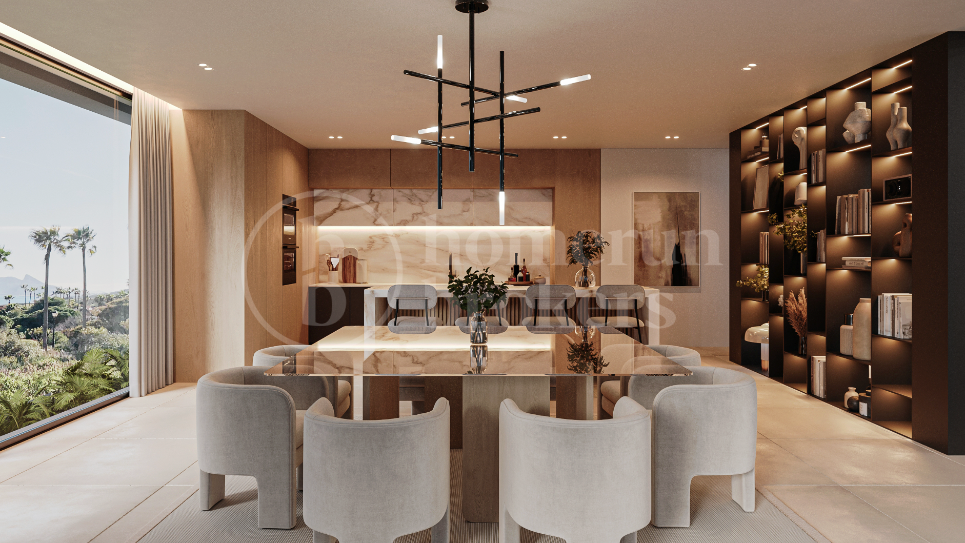 Designed to deliver a refined contemporary lifestyle, the villa combines bold architectural lines with expansive glazing that maximises natural light throughout. The main living areas flow seamlessly toward the outdoor terraces, creating a strong connection between interior and exterior spaces. The open-plan kitchen is fitted with premium Gaggenau and Siematic appliances, offering both visual impact and professional-level functionality. Every bedroom benefits from its own en-suite bathroom, ensuring privacy and comfort for residents and guests alike, while two additional guest toilets enhance practicality for entertaining.