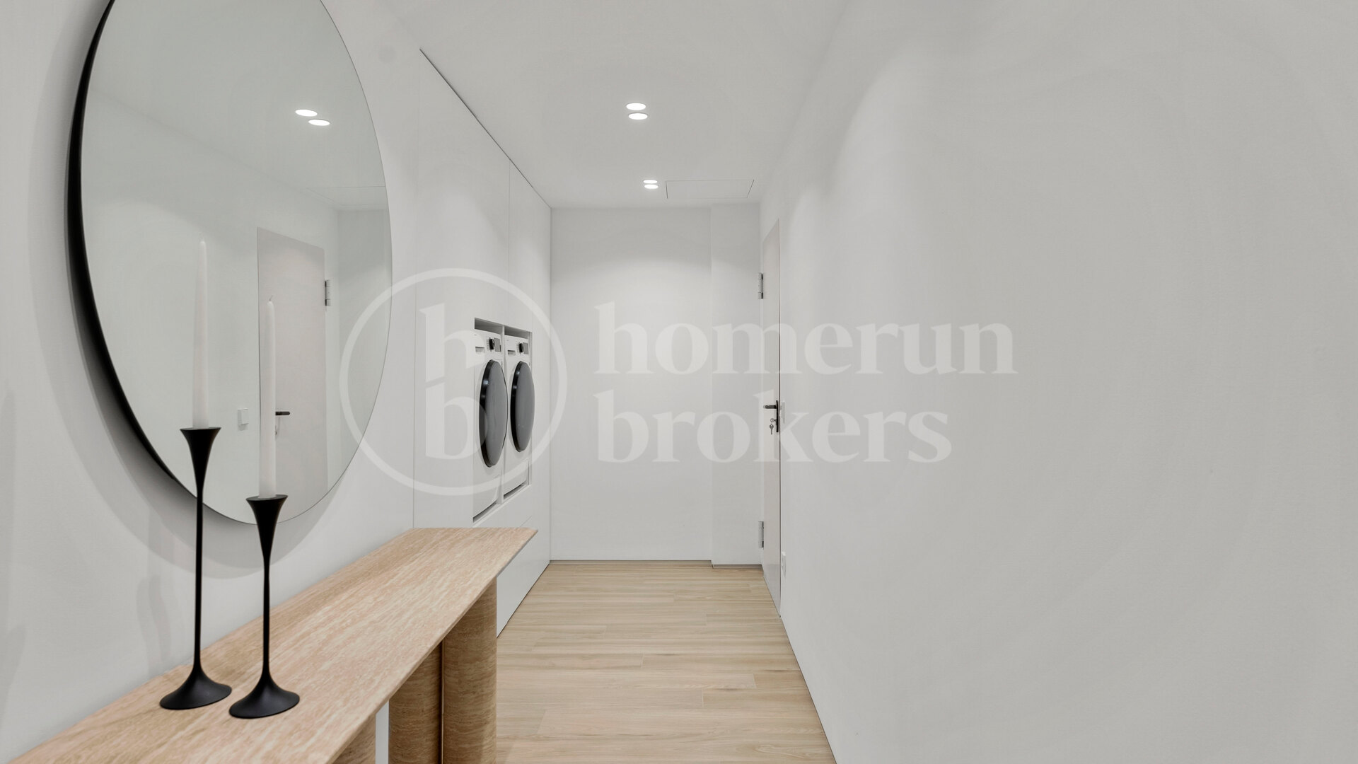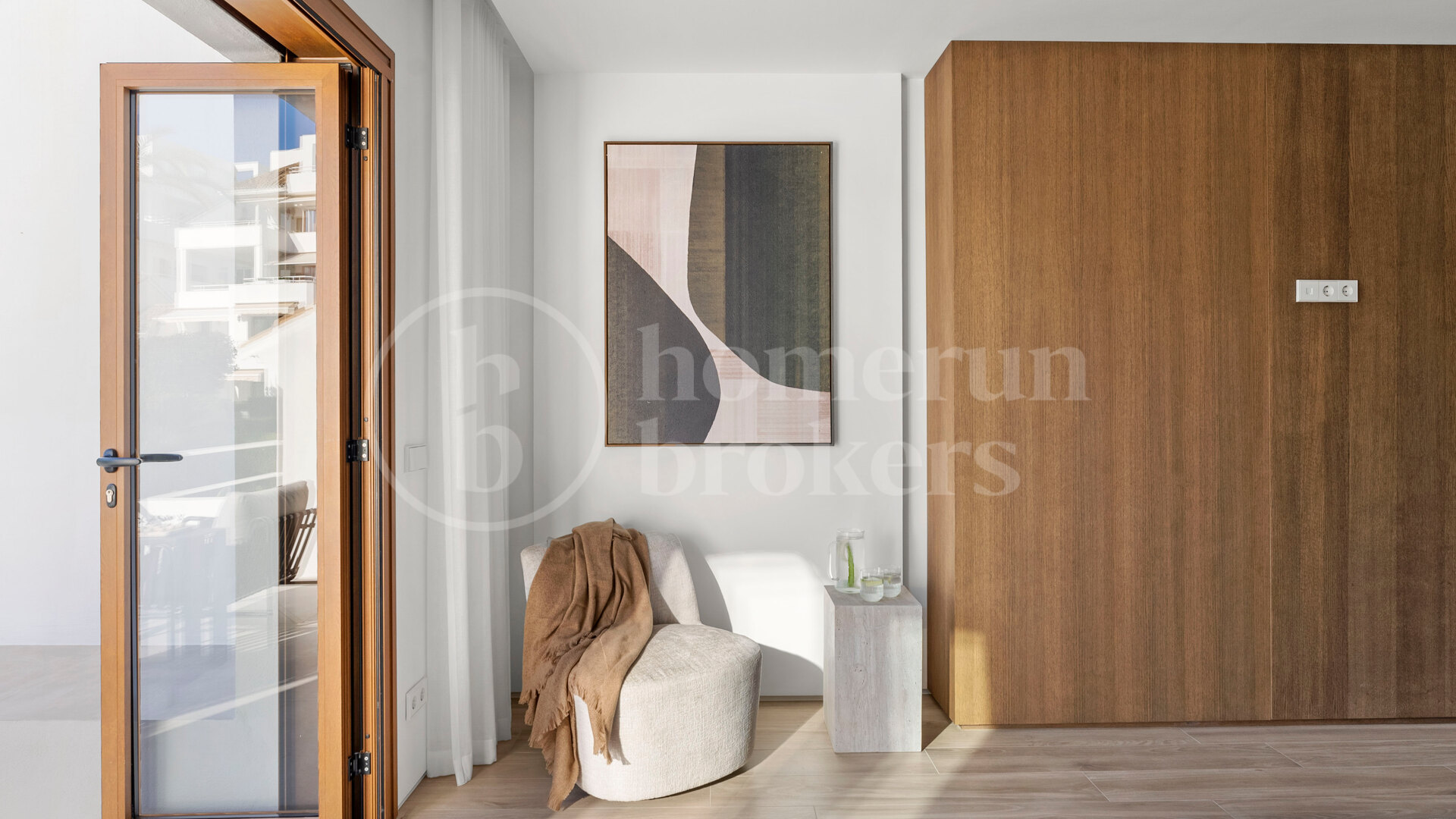 The layout has been carefully conceived to maximise comfort and light throughout the day. Living and dining areas flow seamlessly together, creating an open environment suited to both everyday living and entertaining. Large openings connect the interiors directly to spacious terraces, extending the usable space outdoors and allowing residents to enjoy the mild Mediterranean climate year-round. Natural textures and refined finishes introduce warmth without excess, reinforcing the home’s understated elegance.