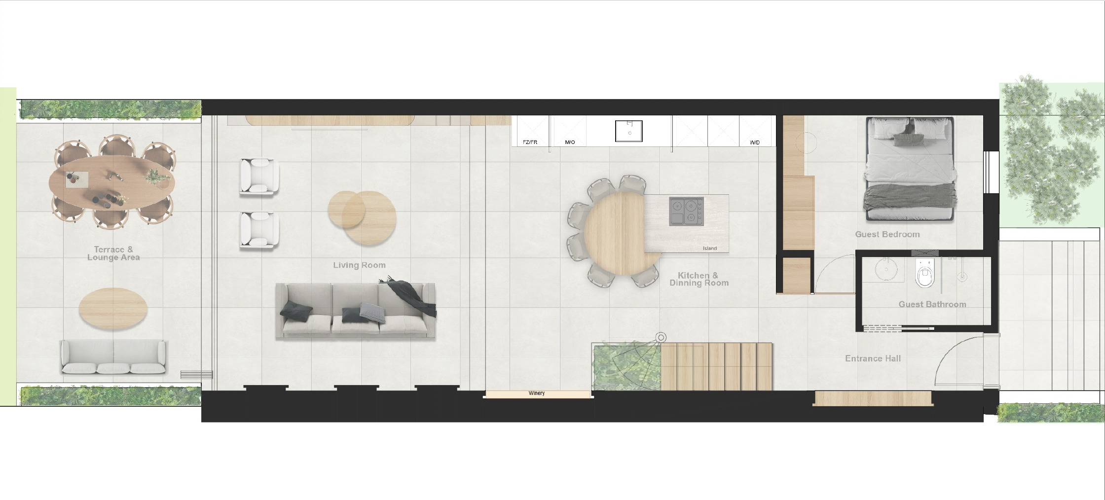 Outdoor areas form an integral part of the townhouse’s appeal. Generous terraces provide ample space for dining, relaxing and entertaining, with open views that enhance the sense of light and openness. These exterior spaces extend the living environment and allow residents to enjoy the surrounding landscape in a private and comfortable setting.