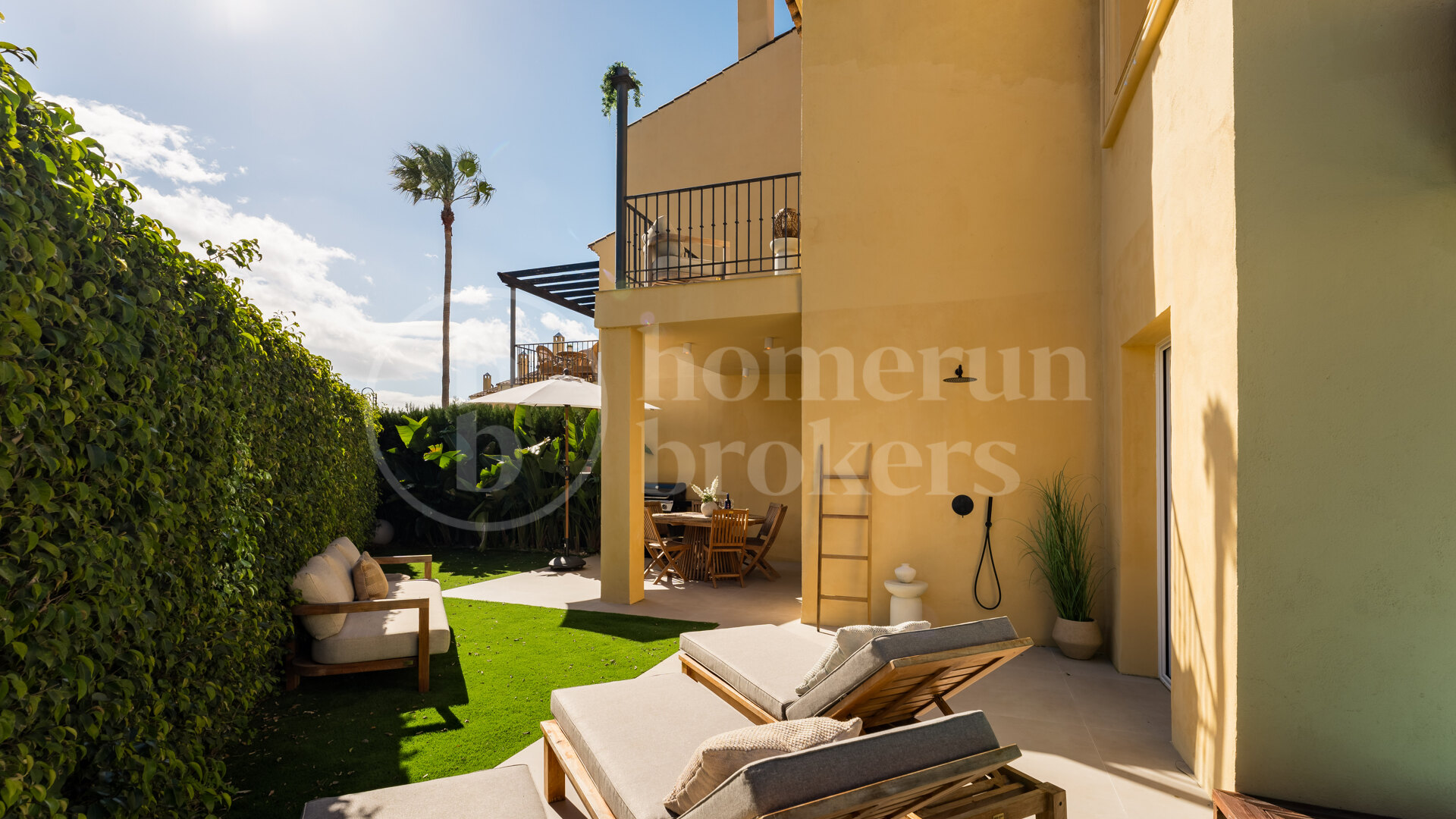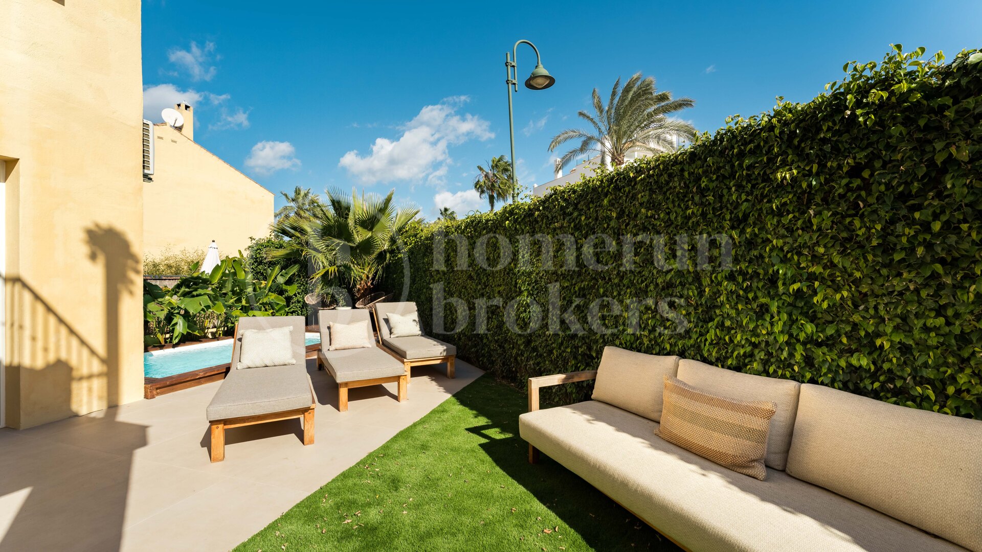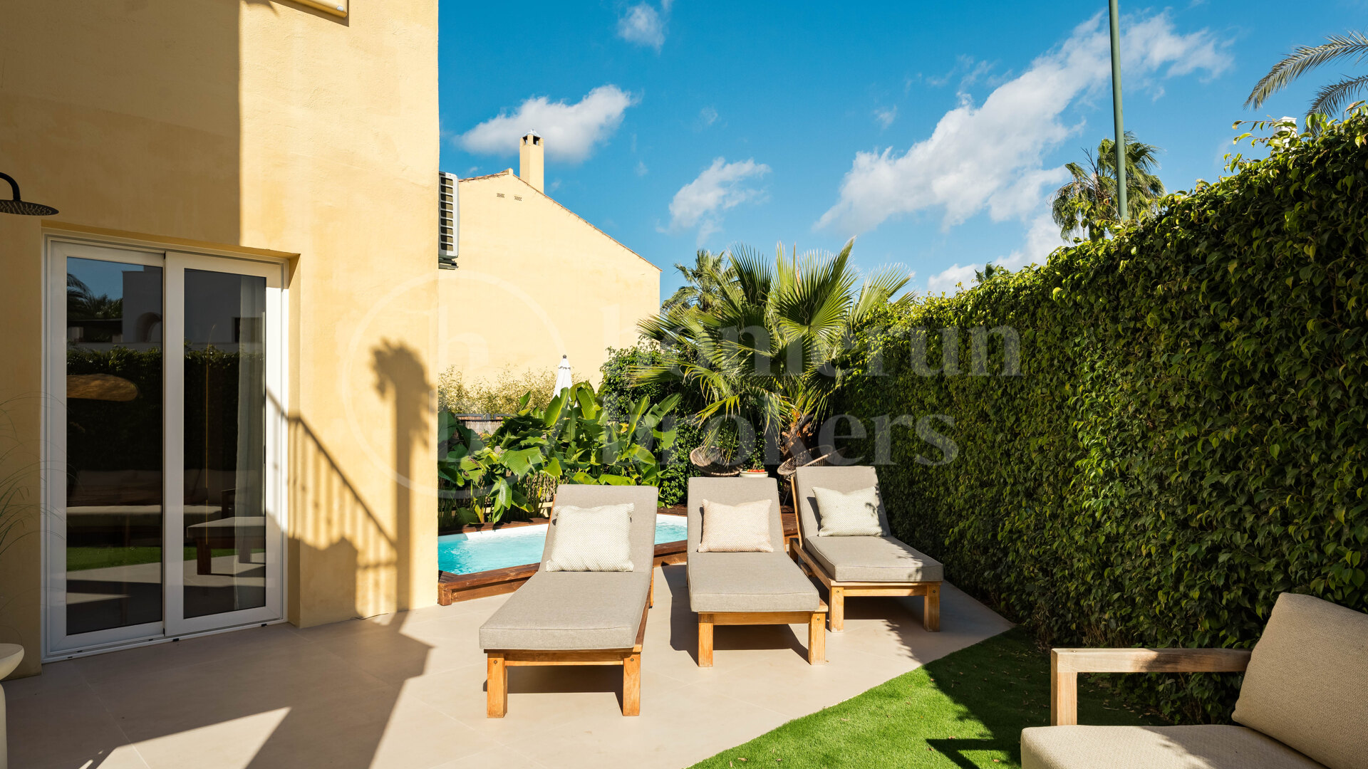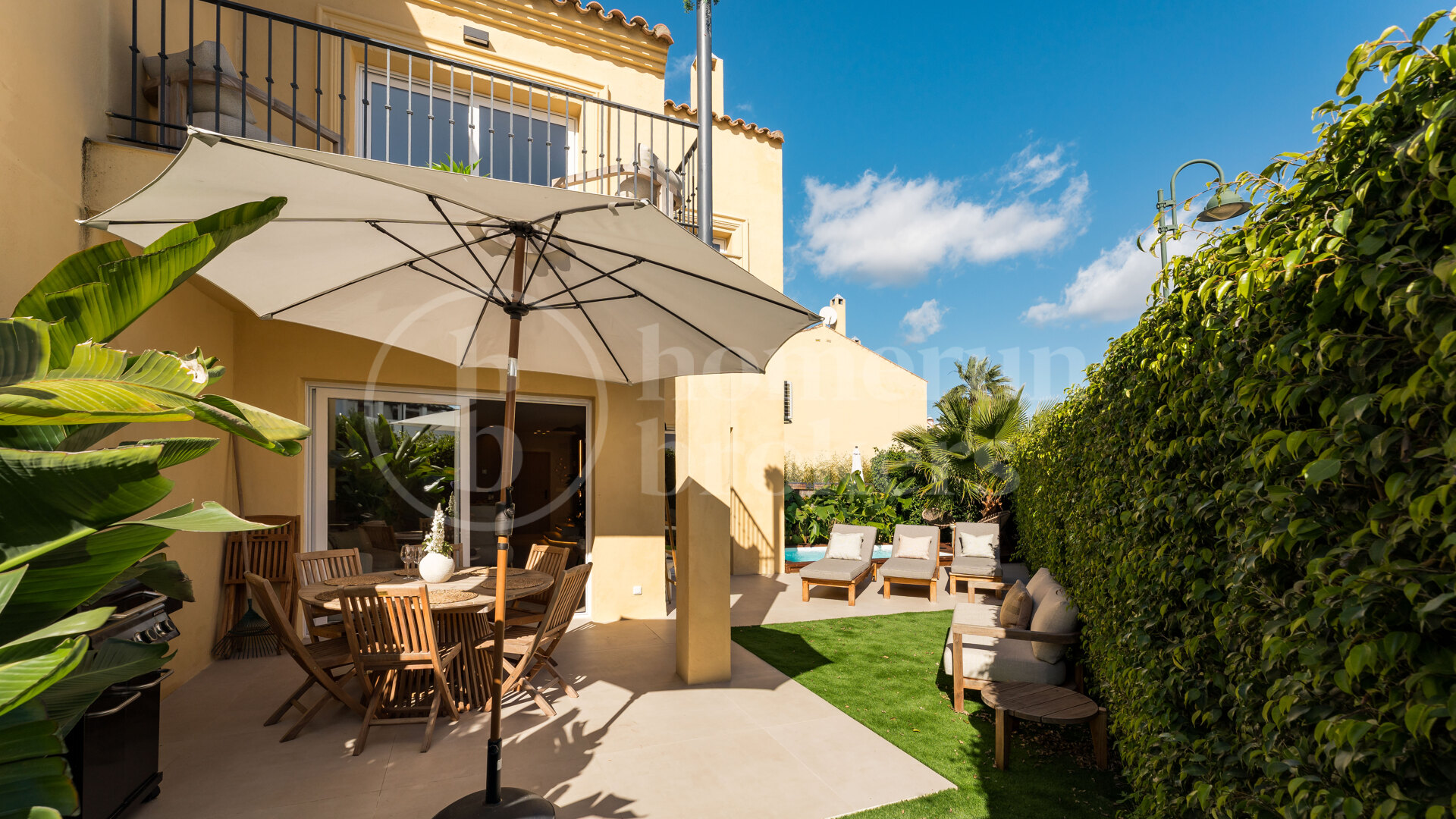 Outside, this townhouse truly shines. The private swimming pool and lush landscaped garden offer an oasis of privacy, while both covered and uncovered terraces provide multiple settings for outdoor dining, sunbathing, or hosting gatherings with friends and family. A barbecue area and automatic irrigation system add convenience to the beautifully maintained outdoor spaces. The property is located within a secure gated community, offering peace of mind and a sense of exclusivity.