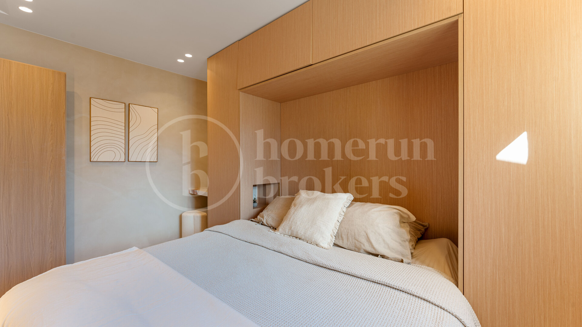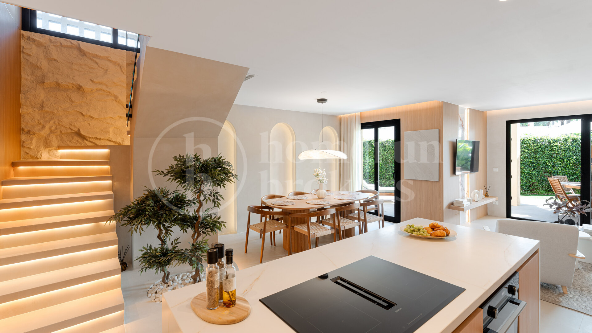The townhouse spans four bedrooms and three bathrooms, including one en-suite, a full family bathroom, and a guest toilet. Every detail of the renovation has been executed with precision and taste. The interiors feature bespoke carpentry, microcement finishes, and discreet LED lighting that creates a warm and inviting ambiance. The result is a home that feels both sophisticated and comfortable, equally suited for year-round living or as a luxurious holiday retreat.