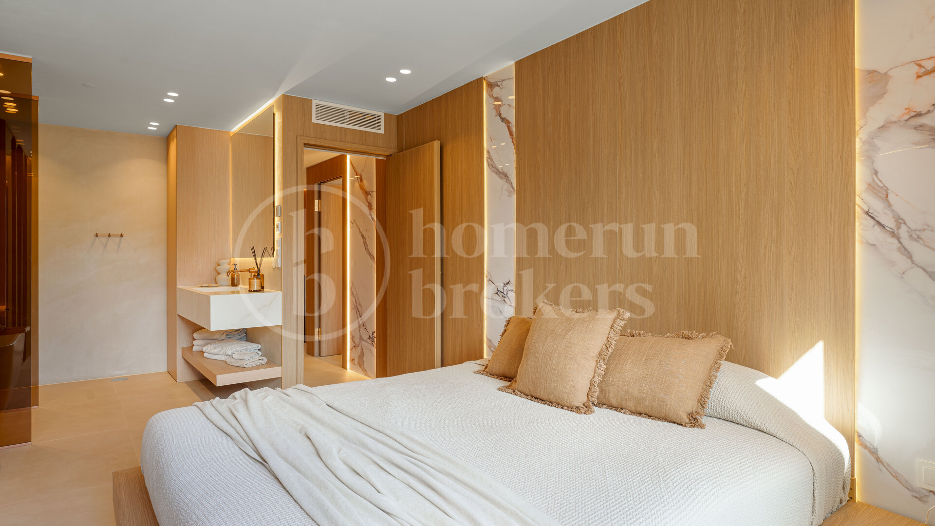 The open-plan living and dining area connects seamlessly with the fully equipped designer kitchen, creating a bright and functional space ideal for entertaining. Floor-to-ceiling glass doors flood the interiors with natural light and provide direct access to the private terrace and garden. High-quality stone floors and premium finishes enhance the contemporary aesthetic, while central air conditioning with Airzone technology allows for individual climate control in every room. Underfloor heating in the bathrooms ensures year-round comfort.