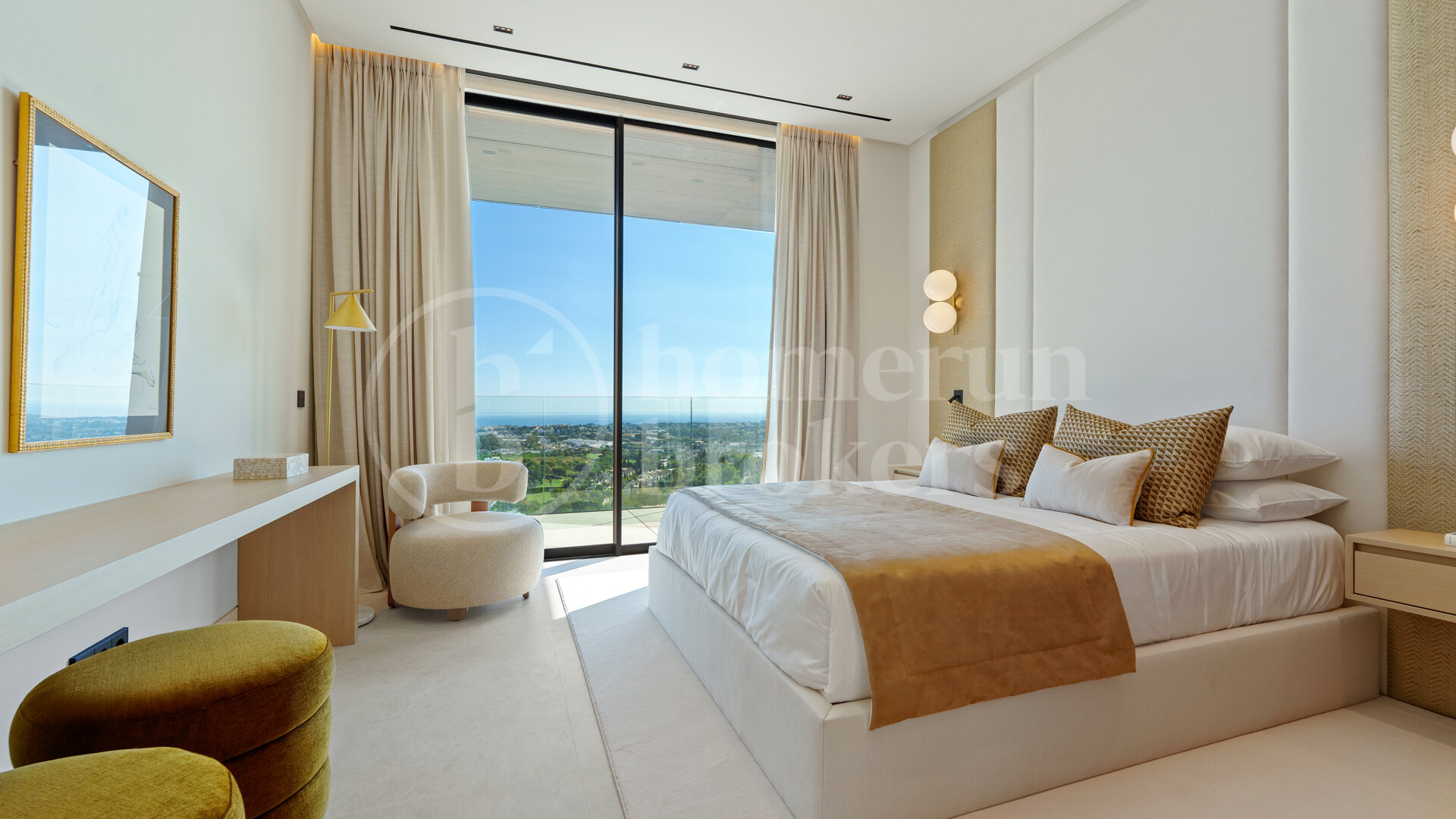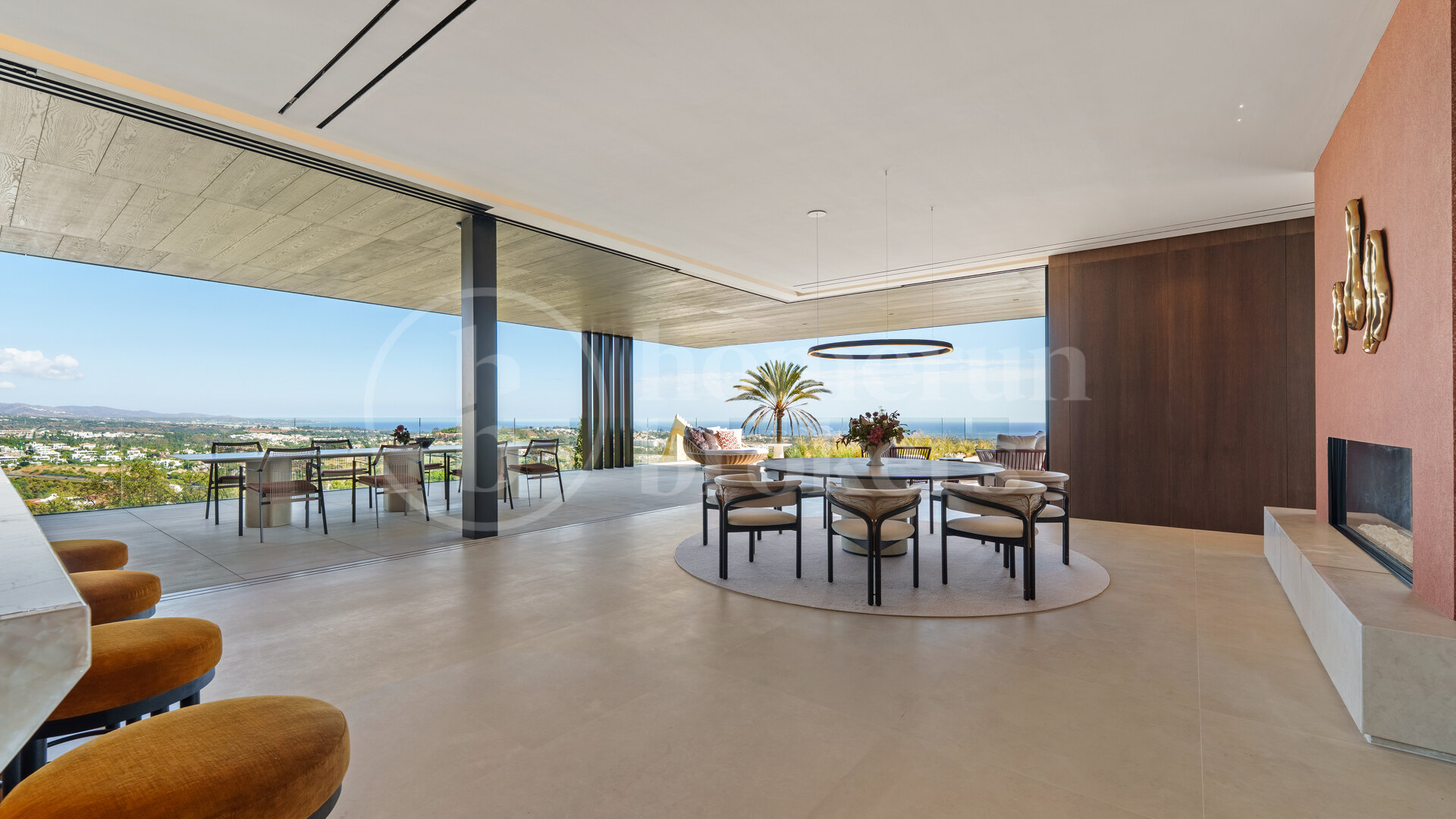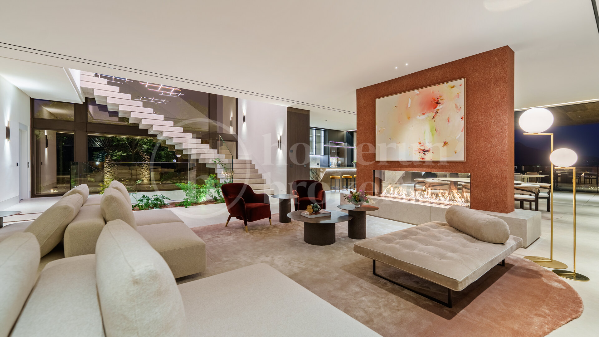 Upon entering, the home reveals an interior flooded with natural light, thanks to its floor-to-ceiling windows that frame uninterrupted vistas of the mountains, coastline, and sea. The main living area embodies openness and refinement, with a stylish lounge centered around a sculptural fireplace that subtly divides it from the spacious dining area and state-of-the-art kitchen. The kitchen itself is equipped with premium appliances, elegant cabinetry, and direct access to an outdoor kitchen and dining terrace, ideal for entertaining in true Marbella style. This level also hosts two en-suite guest bedrooms, providing comfort and independence for visitors.