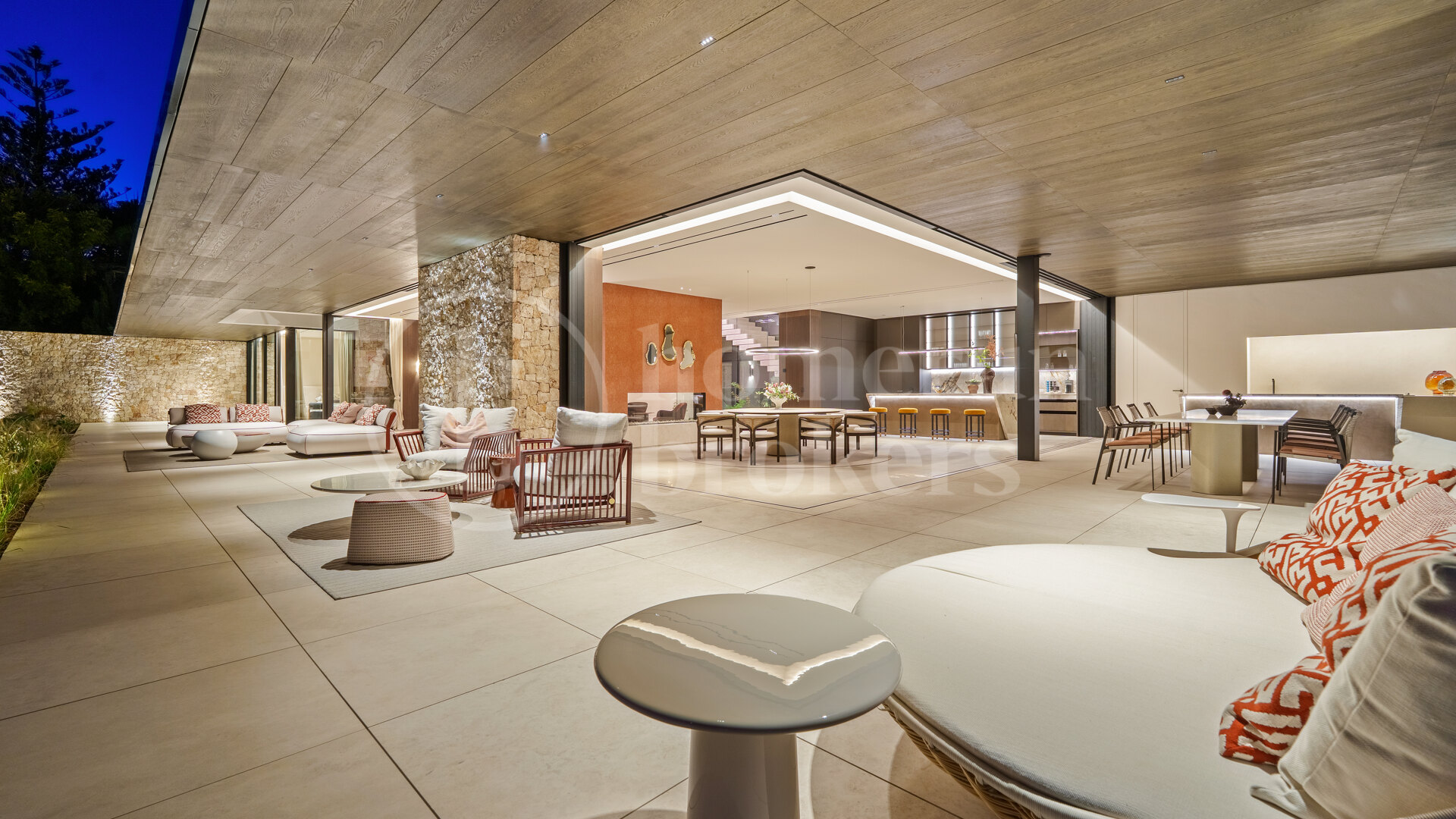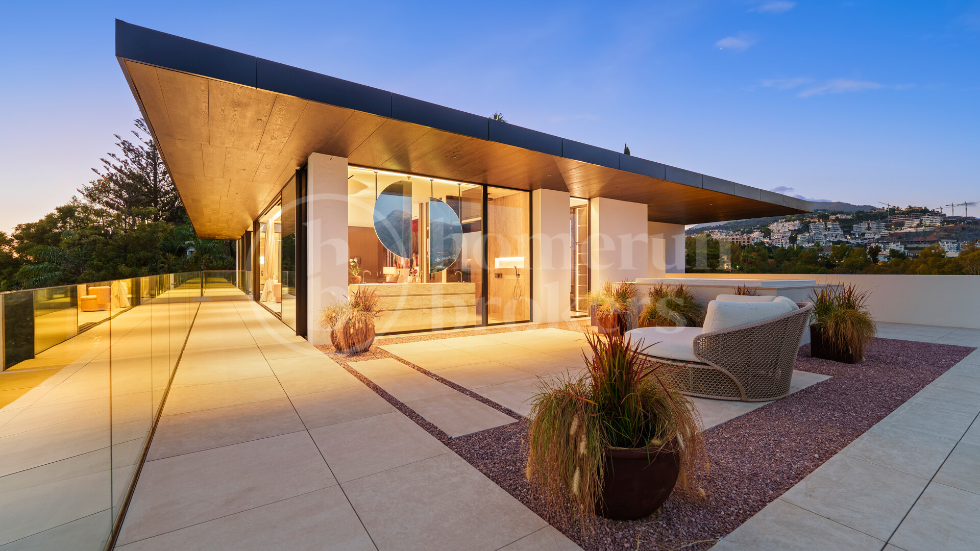 Approaching through the tree-lined avenues of the secure El Herrojo Alto enclave, you’re greeted by a grand entrance and an impressive driveway that leads to the property’s contemporary façade. The exterior combines clean architectural lines with natural stone and warm wood detailing, creating a seamless connection with its surrounding landscape. Designed for those who value privacy and sophistication, Casa Orquídea represents the pinnacle of modern Mediterranean living.