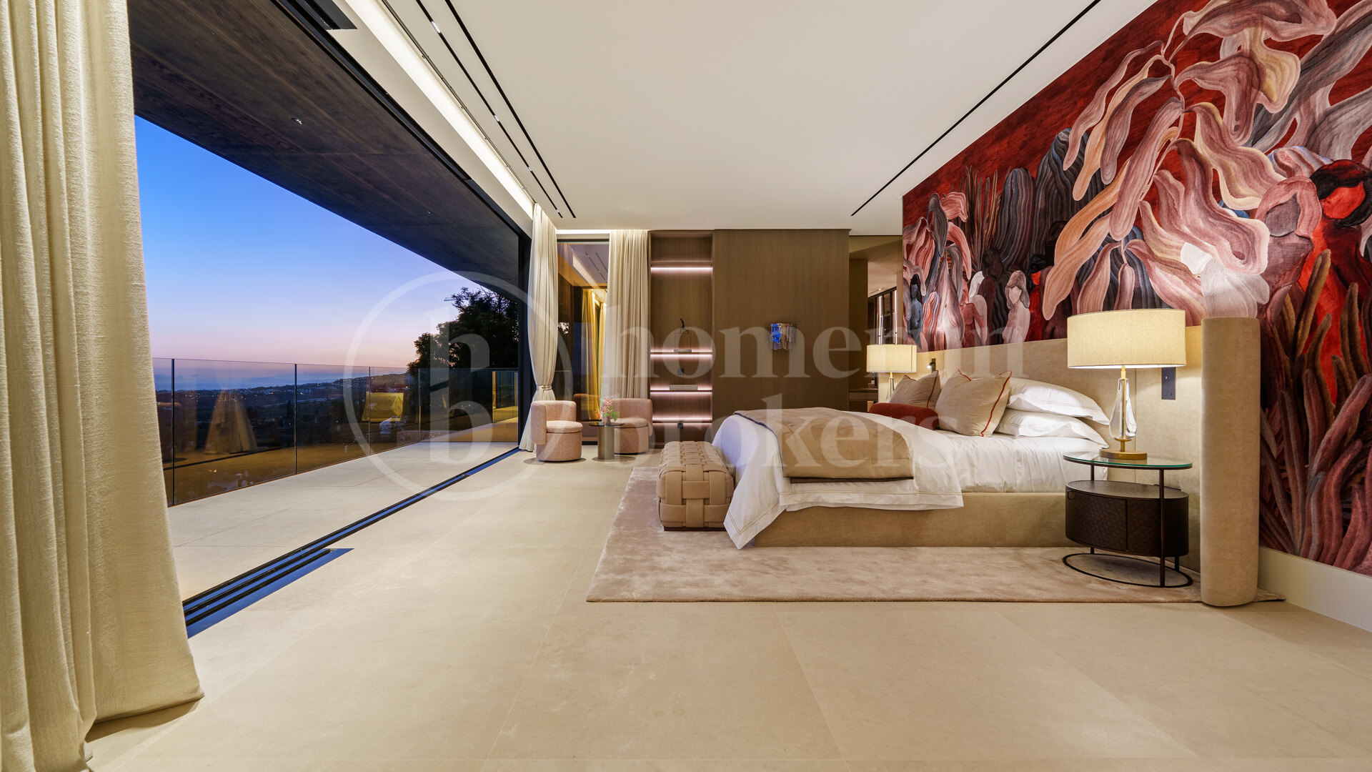 Ascending to the upper floor, you’ll find three additional en-suite bedrooms, including the spectacular master suite — a true sanctuary spanning over 70 m². The master retreat features a large walk-in dressing area, a luxurious bathroom with panoramic views, and a private terrace with a jacuzzi, perfect for unwinding while taking in the dramatic Andalusian sunsets.