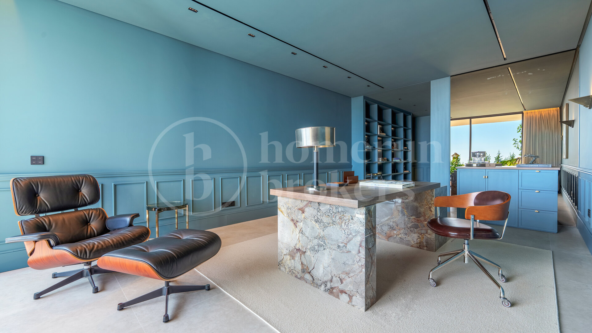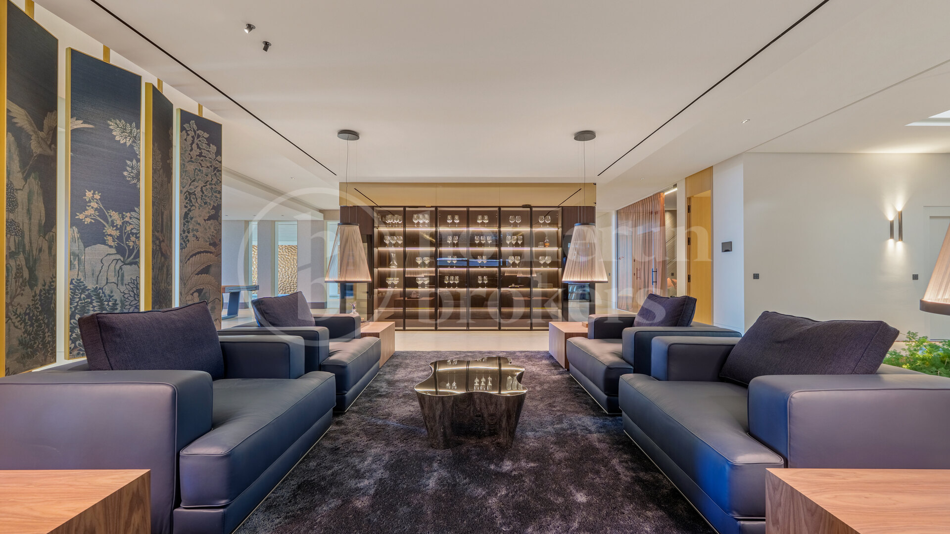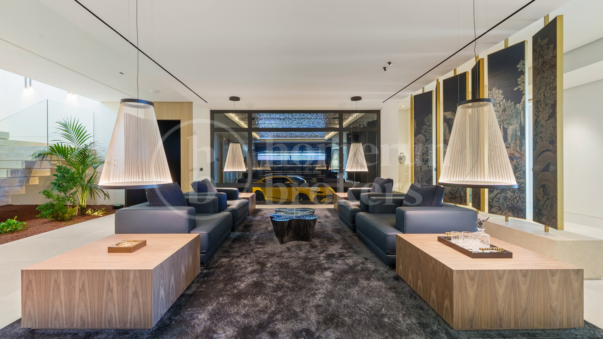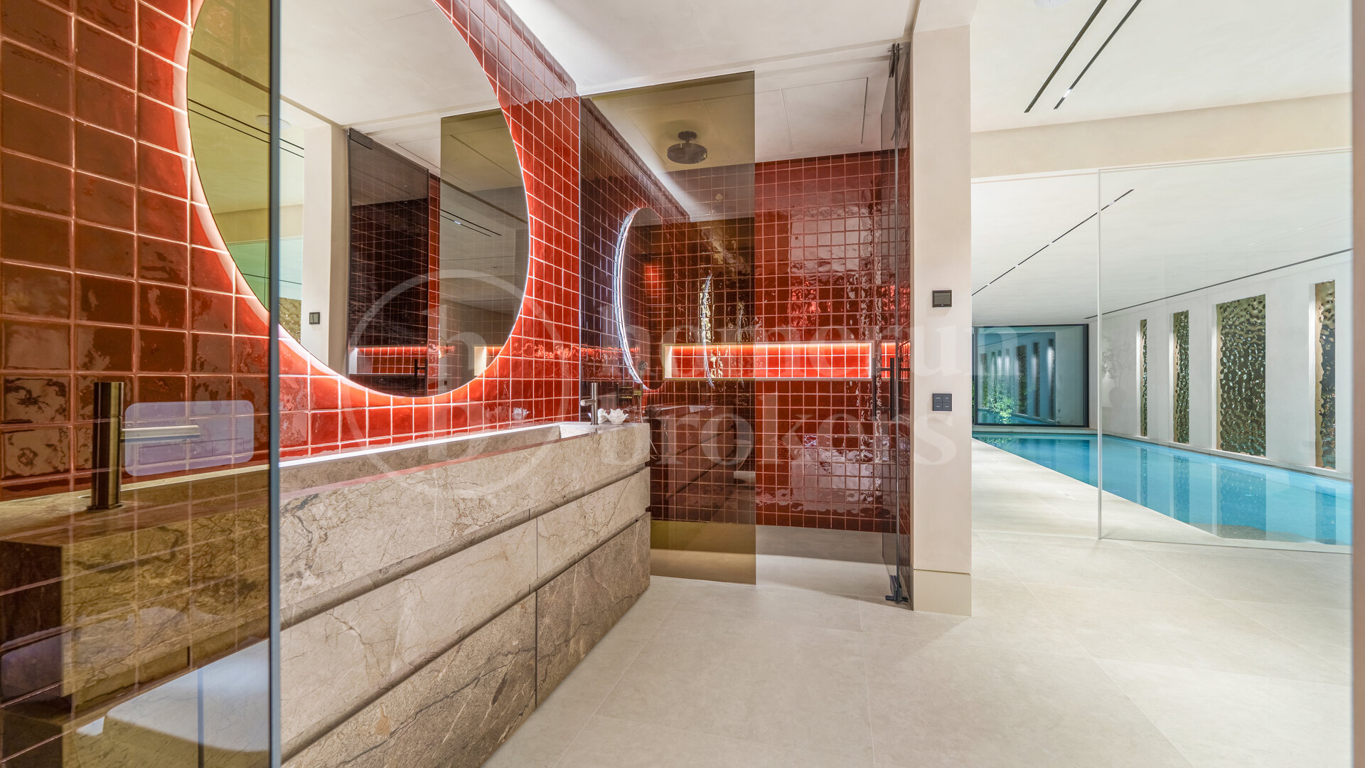 The villa’s lower level, encompassing nearly 800 m², is dedicated to leisure, wellness, and relaxation. This expansive space is bathed in natural light and opens to private garden areas, maintaining the connection with the outdoors. Here, residents can enjoy multiple lounge and entertainment zones, a playroom, a cinema room, a fully equipped gym, and a luxurious indoor spa with a heated pool and jacuzzi — creating a self-contained wellness retreat within the home.