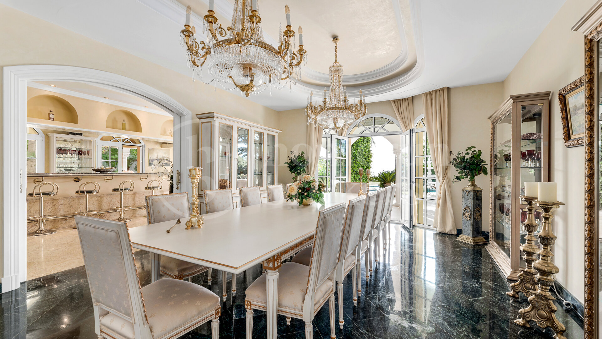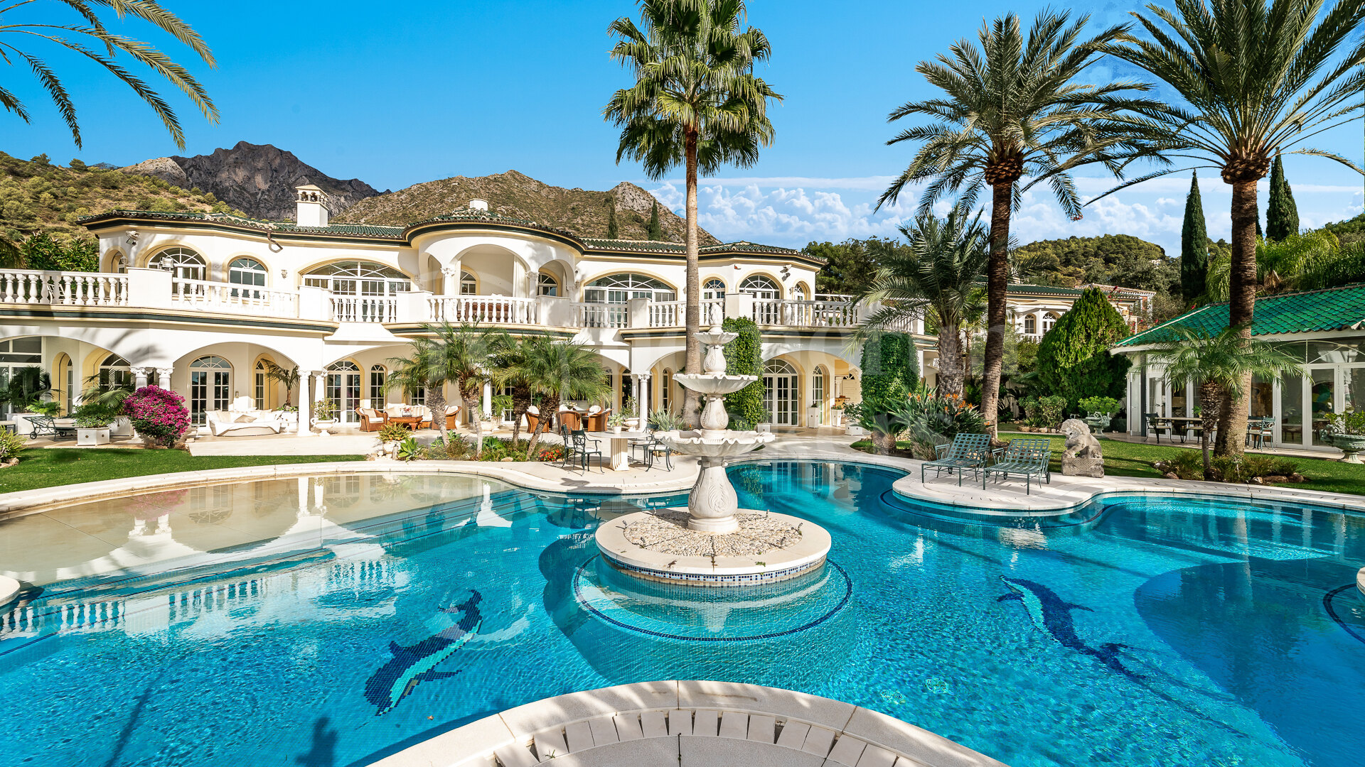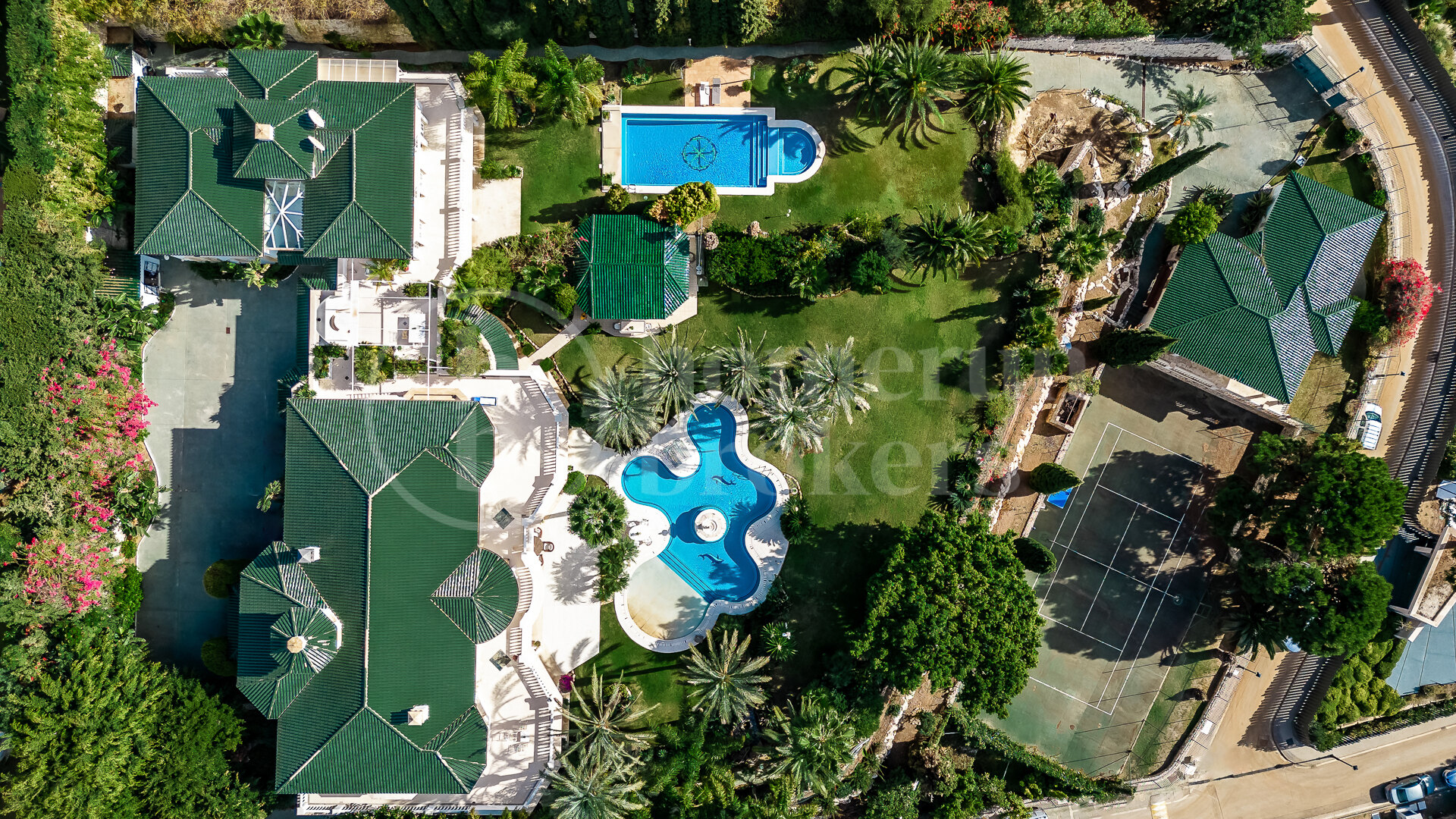 A luxury estate villa compound for sale in Cascada de Camoján offering fifteen bedrooms distributed across three independent residences, extensive garage capacity, heated swimming pools, landscaped gardens, and panoramic Mediterranean sea views occupies an elevated seven-thousand-two-hundred square metre plot within one of the most private gated communities on the Golden Mile hillside. Comprising a four-bedroom main residence, a seven-bedroom connected guest house, and a detached four-bedroom guest villa with its own tennis court, this exceptional property delivers remarkable scale designed for multigenerational living, entertaining, or high-level hospitality use.