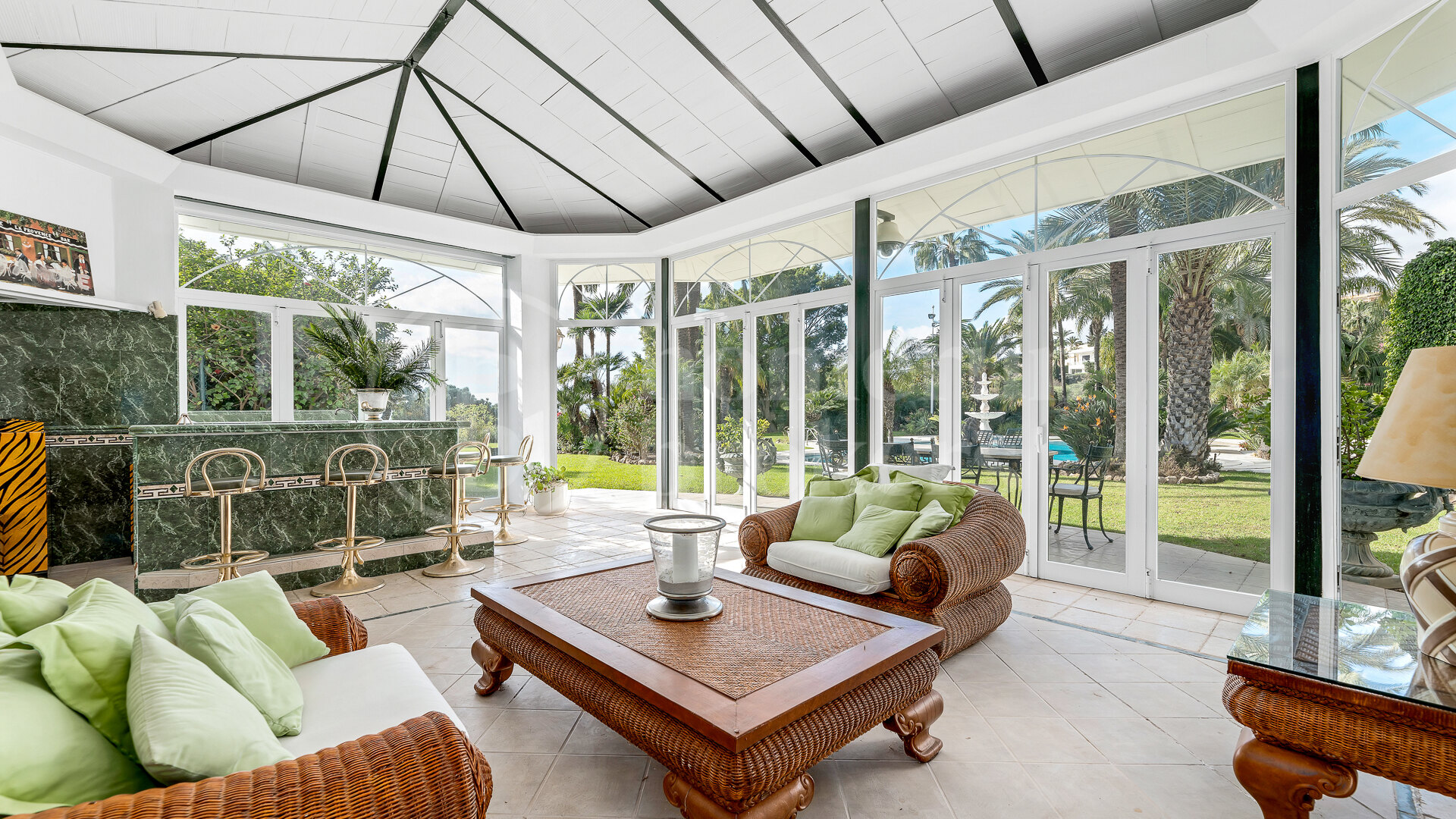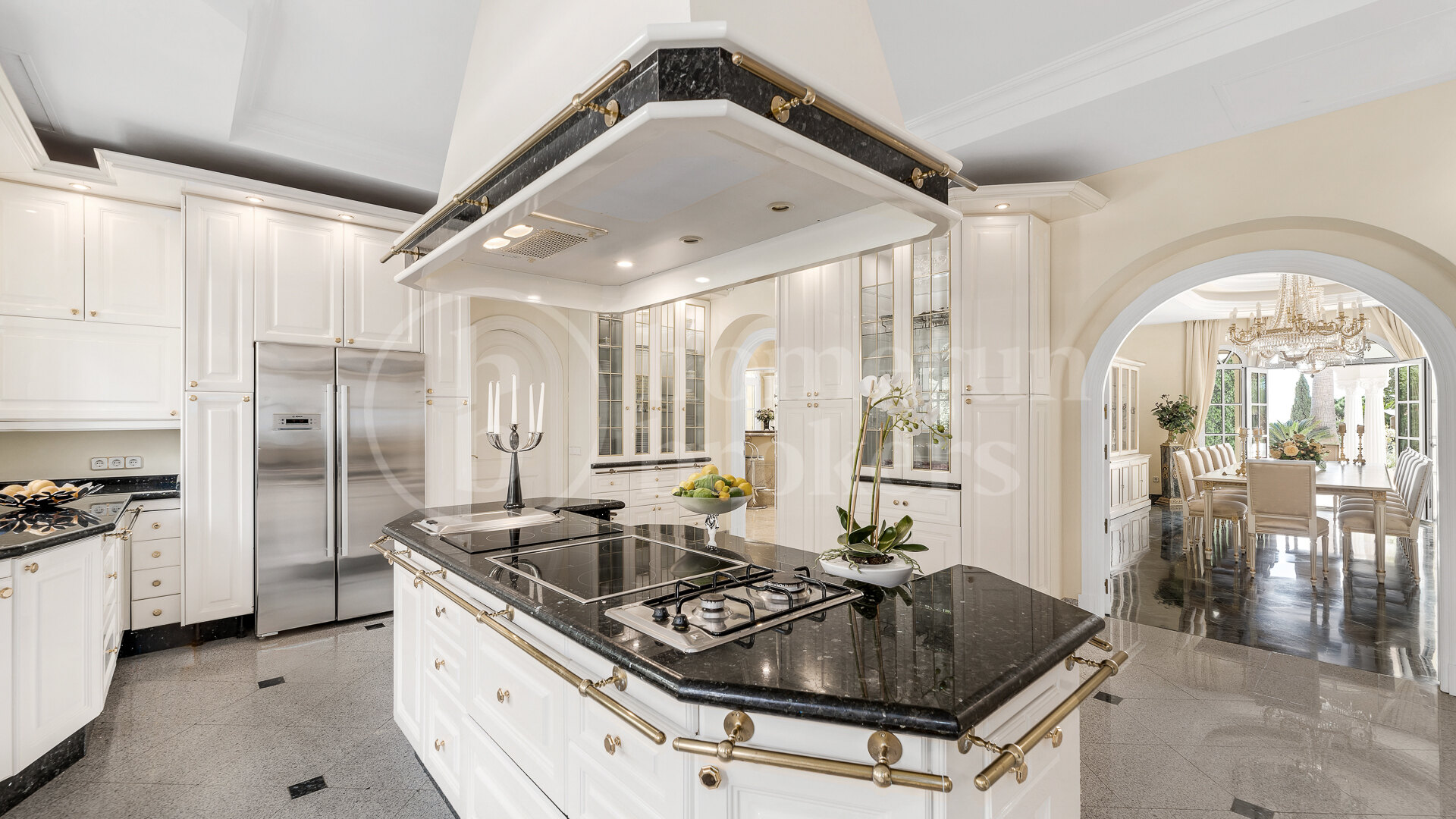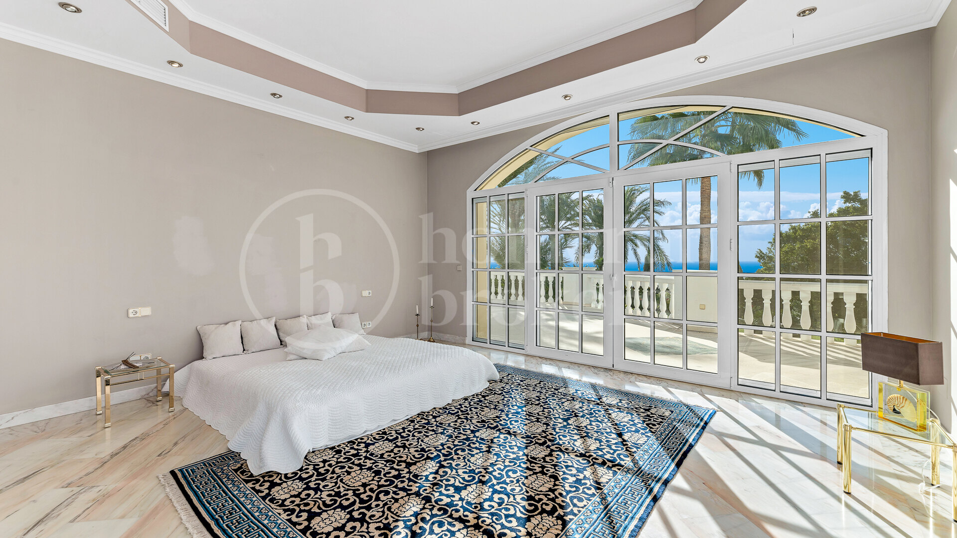 A luxury estate villa compound for sale in Cascada de Camoján offering fifteen bedrooms distributed across three independent residences, extensive garage capacity, heated swimming pools, landscaped gardens, and panoramic Mediterranean sea views occupies an elevated seven-thousand-two-hundred square metre plot within one of the most private gated communities on the Golden Mile hillside. Comprising a four-bedroom main residence, a seven-bedroom connected guest house, and a detached four-bedroom guest villa with its own tennis court, this exceptional property delivers remarkable scale designed for multigenerational living, entertaining, or high-level hospitality use.