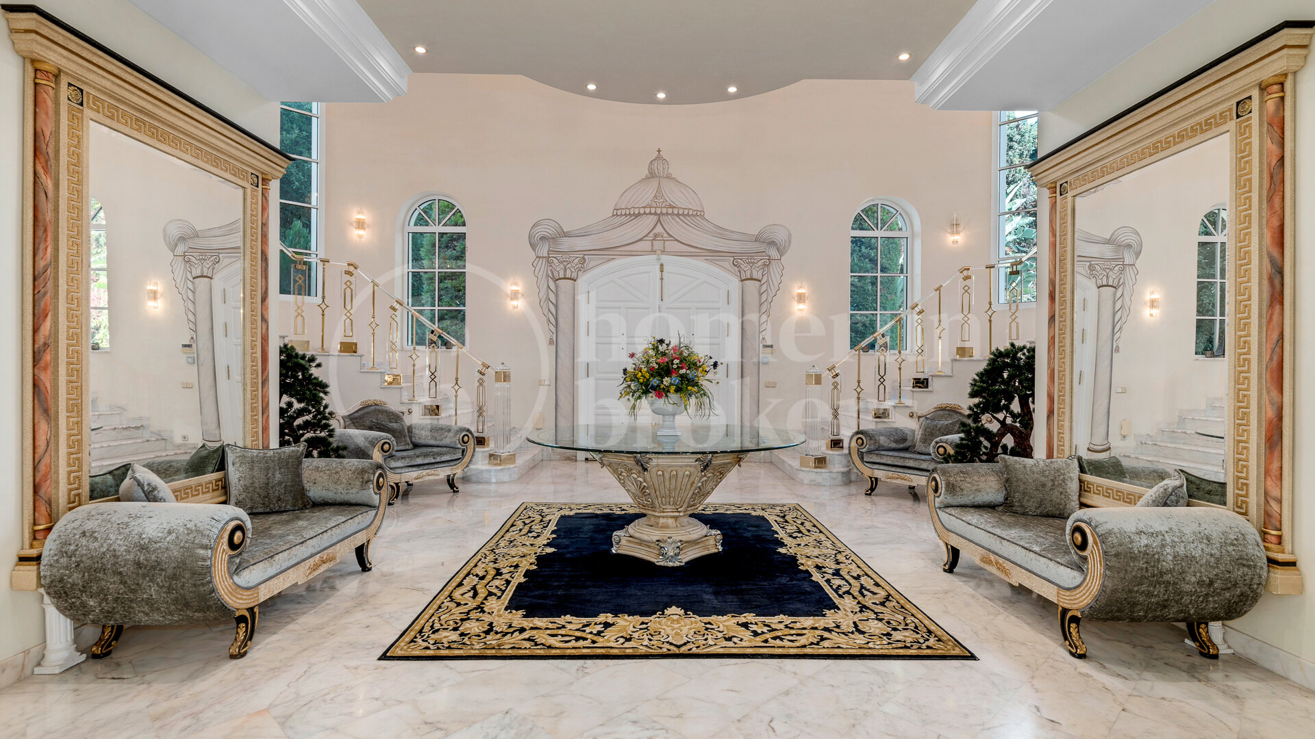 Arrival is defined by an imposing entrance gate leading to an expansive private driveway with space for multiple vehicles. In addition to underground parking for four cars and two enclosed garage spaces on the main level, the exterior forecourt comfortably accommodates up to eight additional vehicles, a rare advantage for large gatherings or staff access. The architectural composition introduces grandeur immediately upon entry, where a double-height entrance hall is framed by an impressive imperial staircase that establishes the tone for the residence.