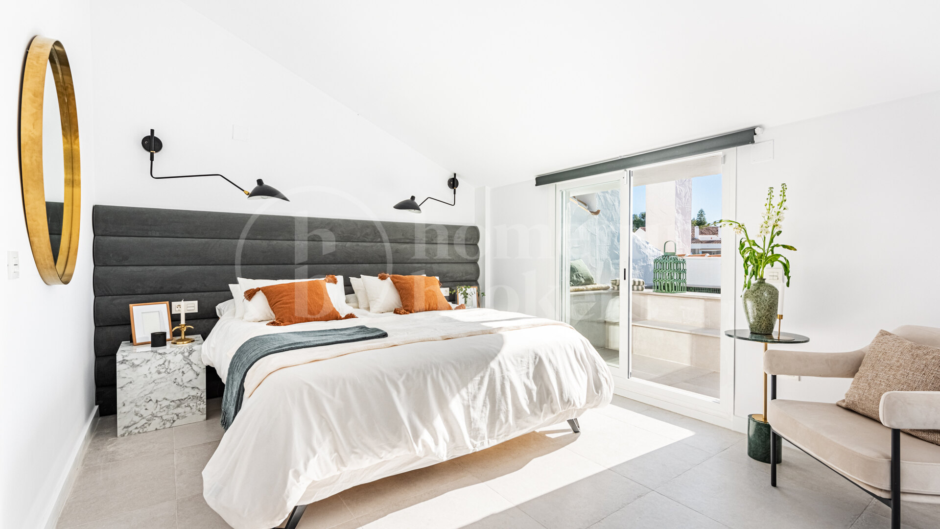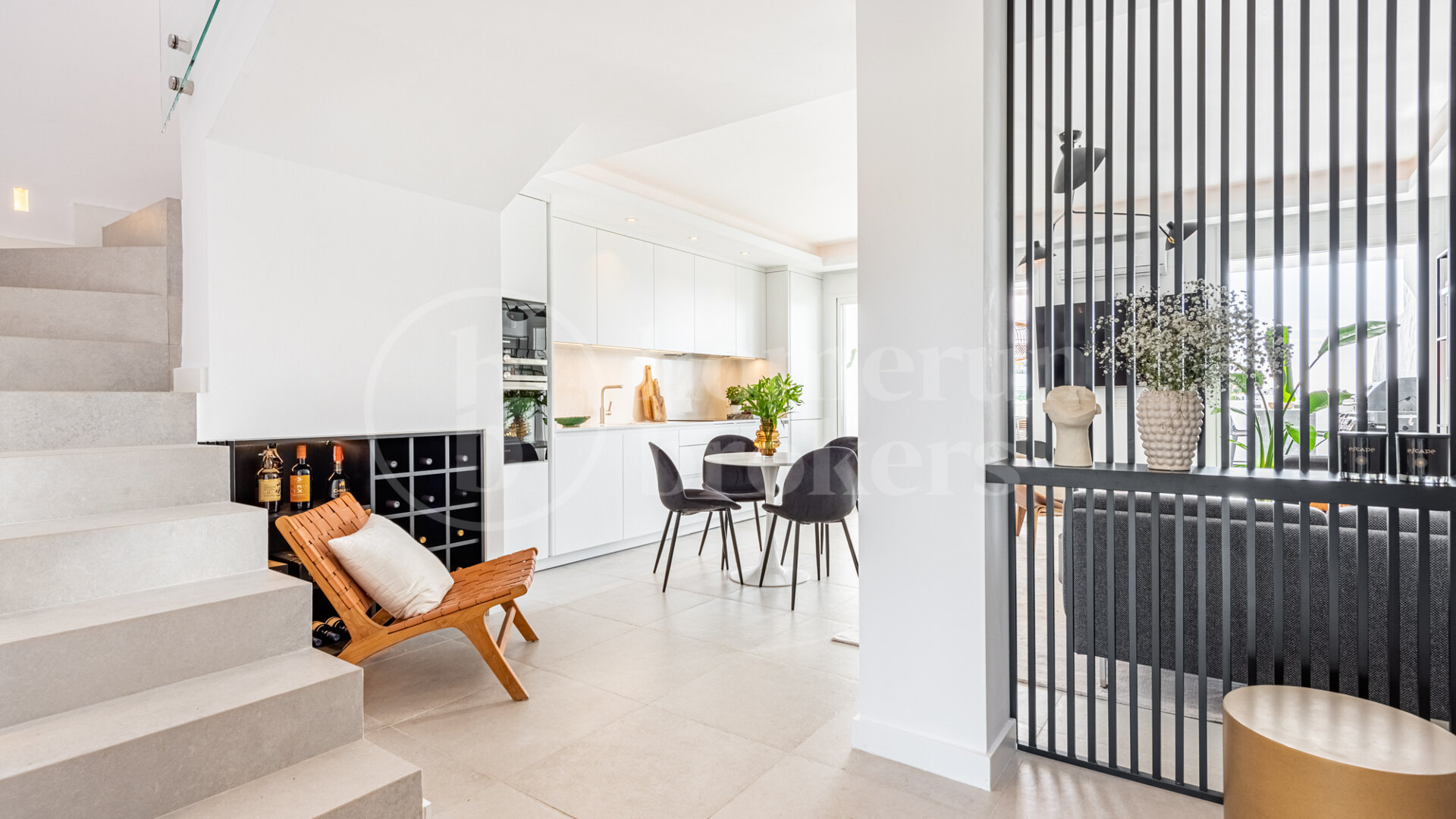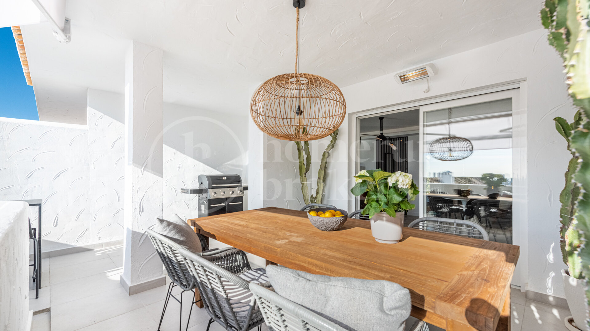 Located in the sought-after urbanization of El Dorado in Nueva Andalucia, this Duplex Penthouse is a symbol of luxury and convenience. Designed with modern Scandinavian elegance, the property spans two floors, featuring three bedrooms and three bathrooms. The ground level has a bright, open-plan kitchen with premium appliances, seamlessly merging into a living area that opens to a south-facing terrace. This space is complemented by a dining table, a bar table, and a BBQ area, overlooking the spacious community pool.