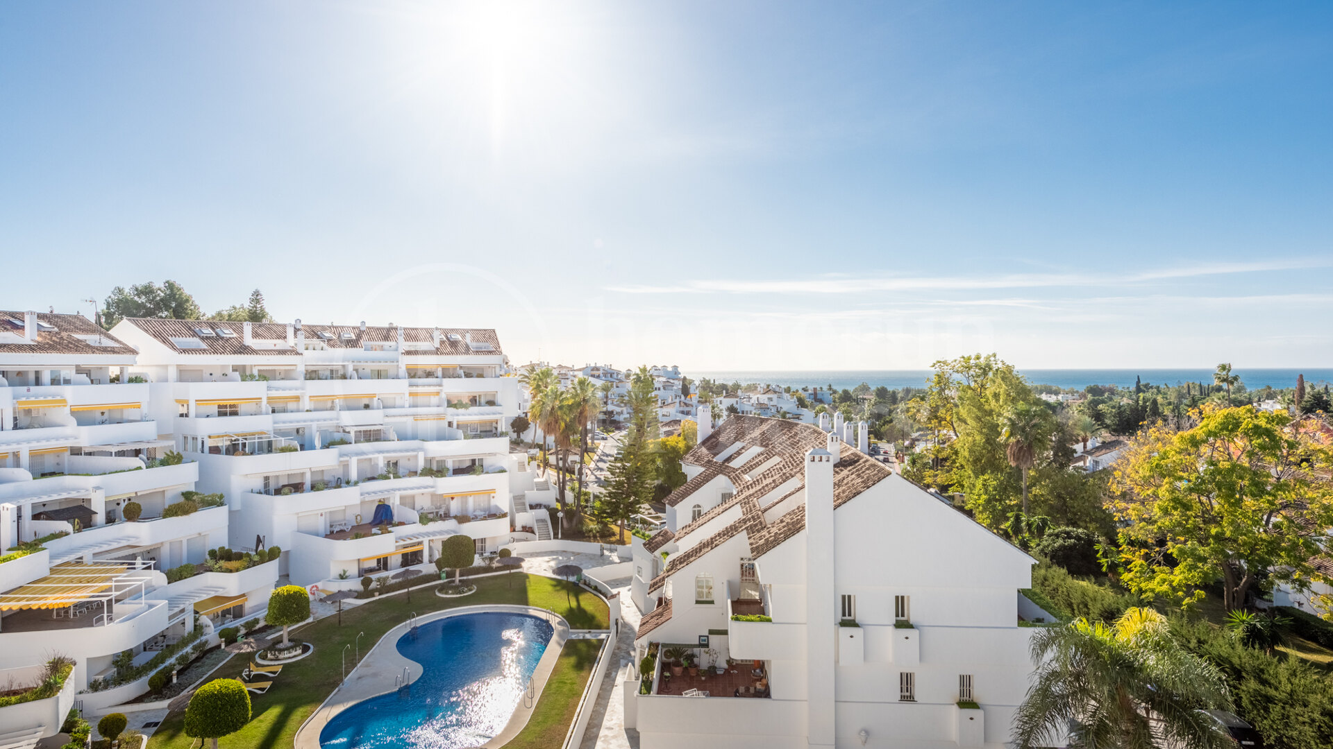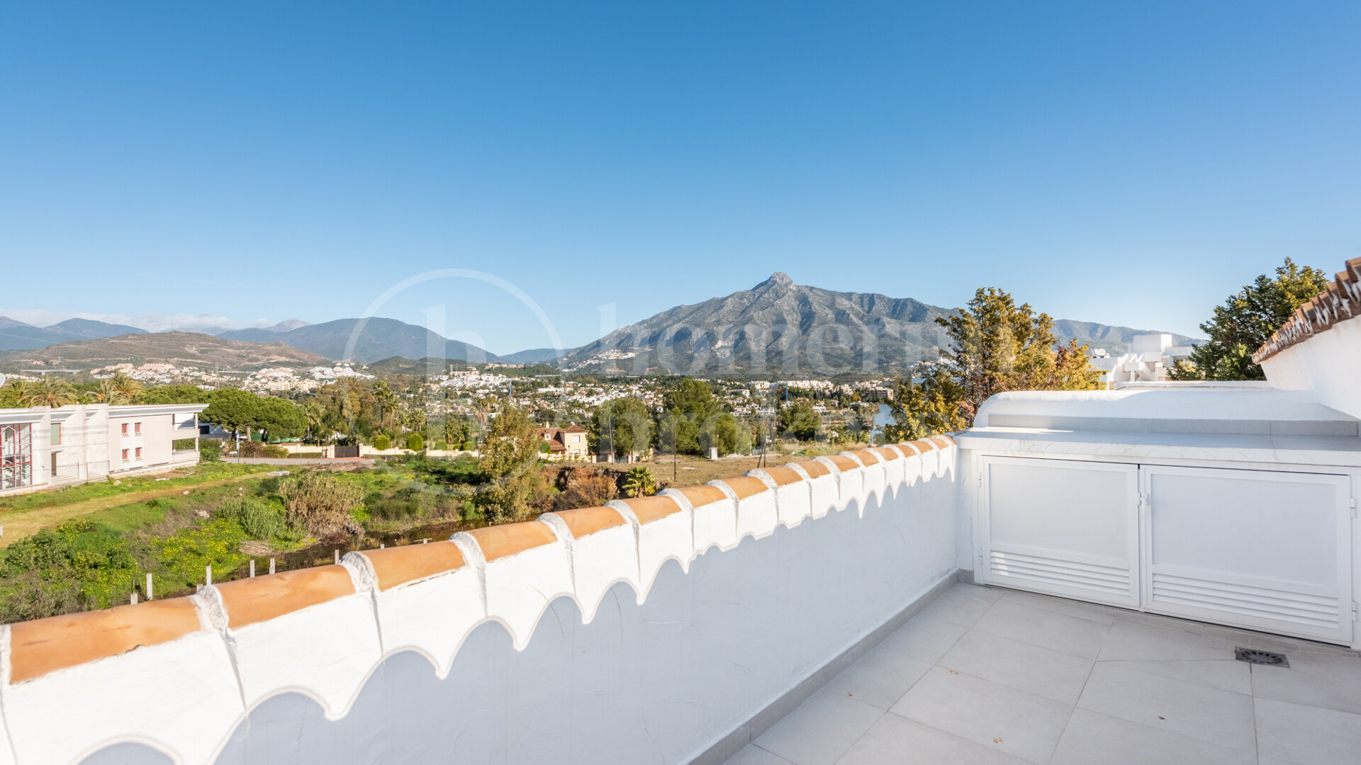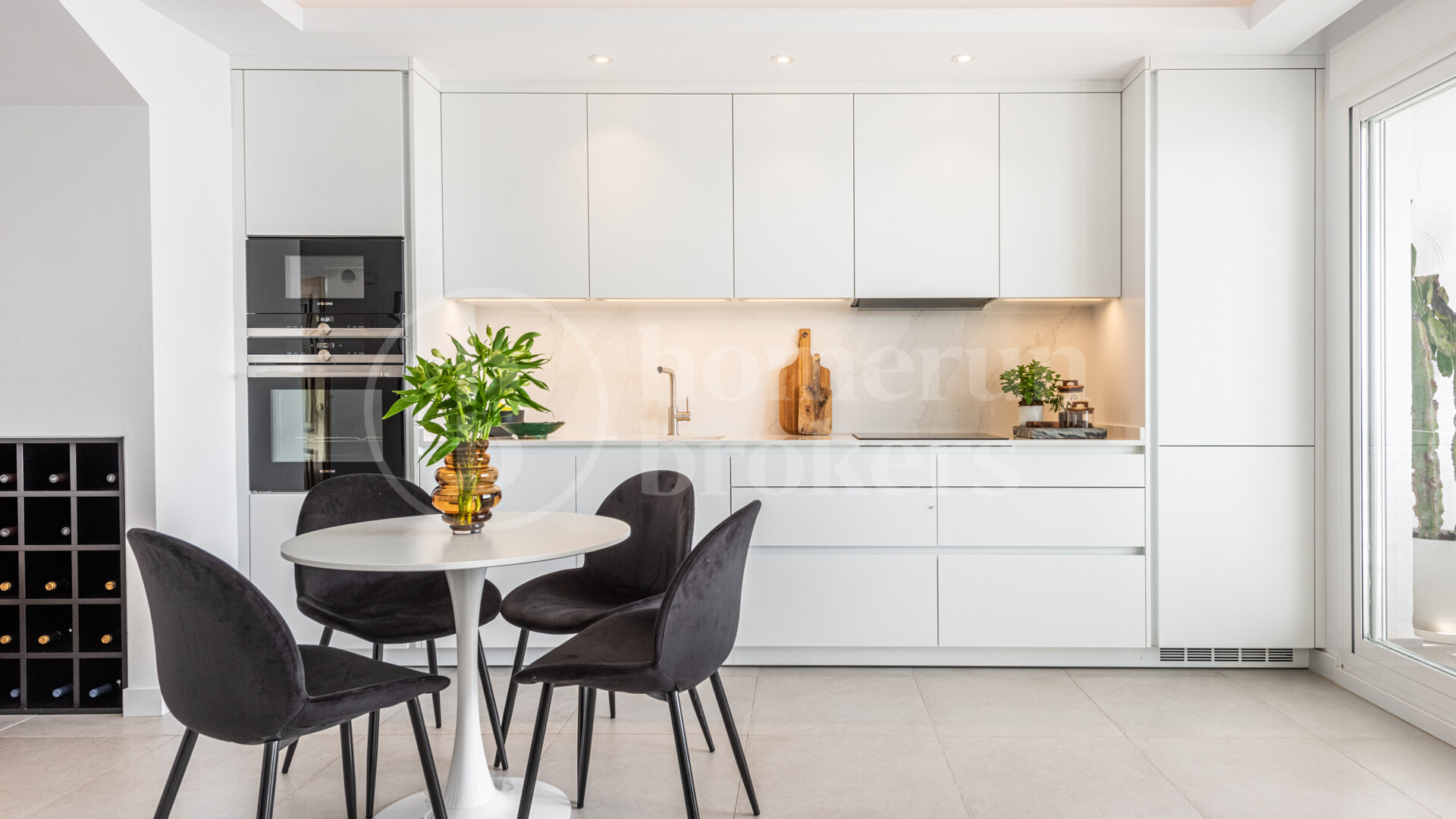 Located in the sought-after urbanization of El Dorado in Nueva Andalucia, this Duplex Penthouse is a symbol of luxury and convenience. Designed with modern Scandinavian elegance, the property spans two floors, featuring three bedrooms and three bathrooms. The ground level has a bright, open-plan kitchen with premium appliances, seamlessly merging into a living area that opens to a south-facing terrace. This space is complemented by a dining table, a bar table, and a BBQ area, overlooking the spacious community pool.