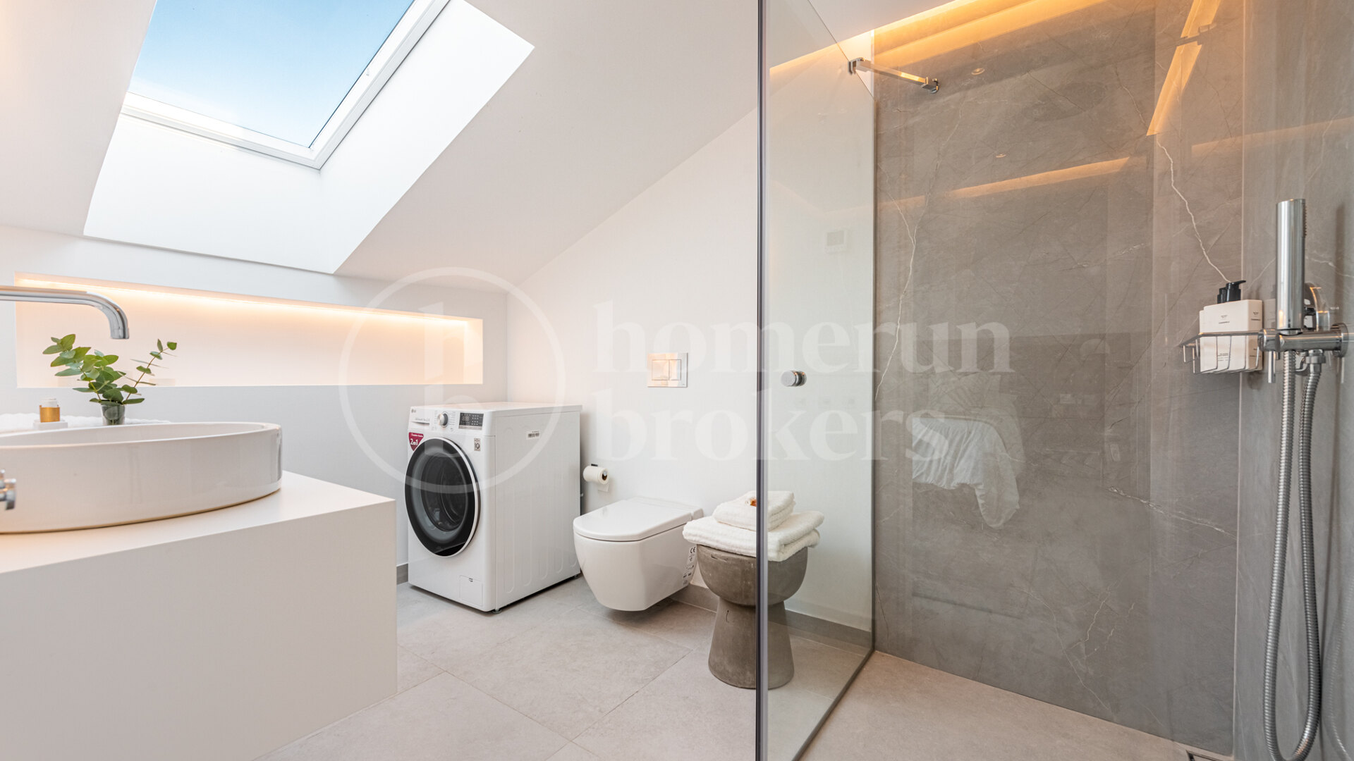 The upper level is equally impressive, housing two bedrooms, each with an ensuite bathroom. The master suite, with its walk-in closet, opens to a terrace with a heated plunge pool, offering panoramic sea views. The second bedroom, designed for afternoon relaxation, presents a west-facing terrace with serene mountain views.