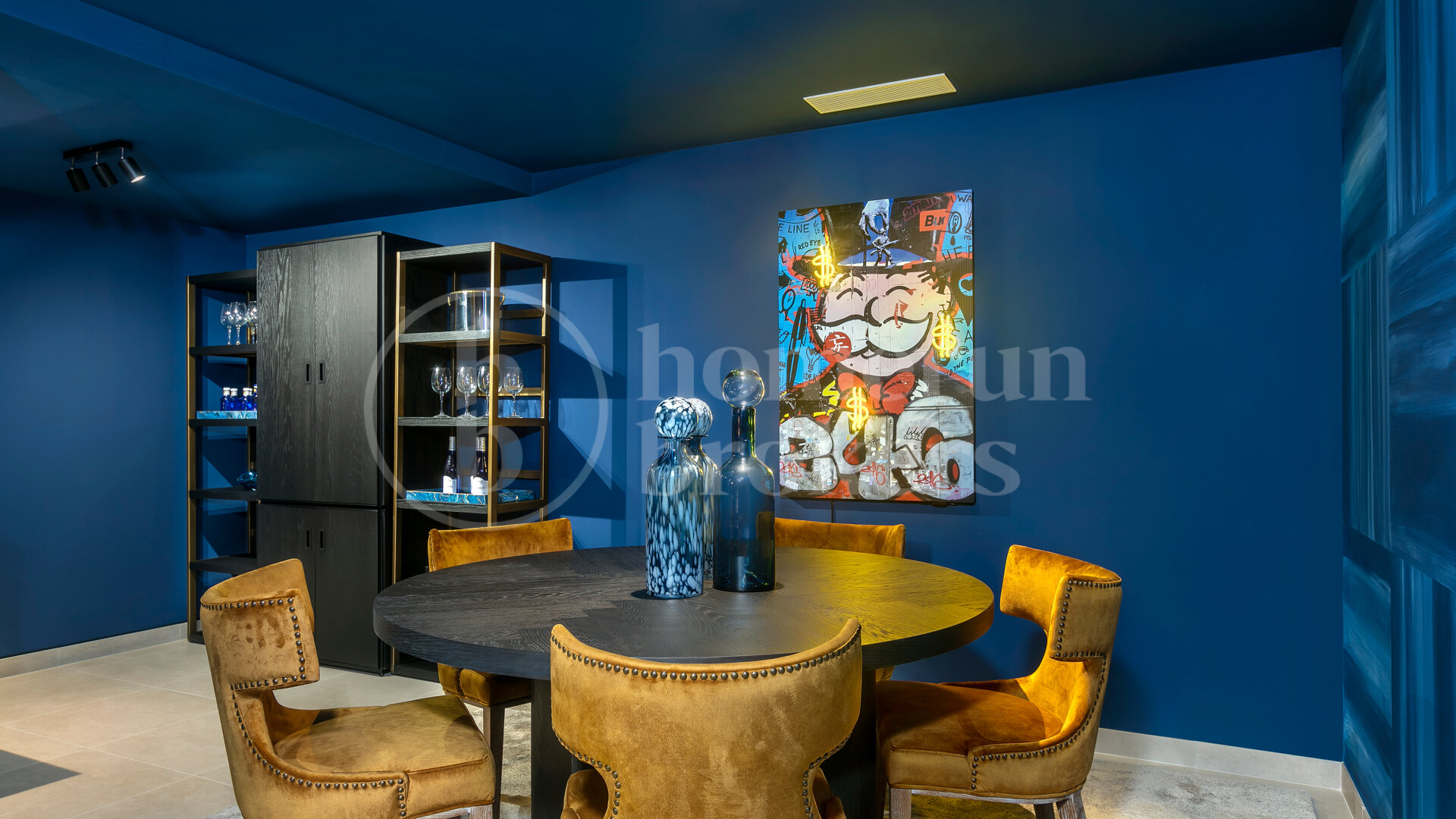 On the lower level, the home reveals a distinctive bar and entertainment lounge, inspired by the charm of a classic jazz club — a unique and inviting space designed for evenings of leisure and style.