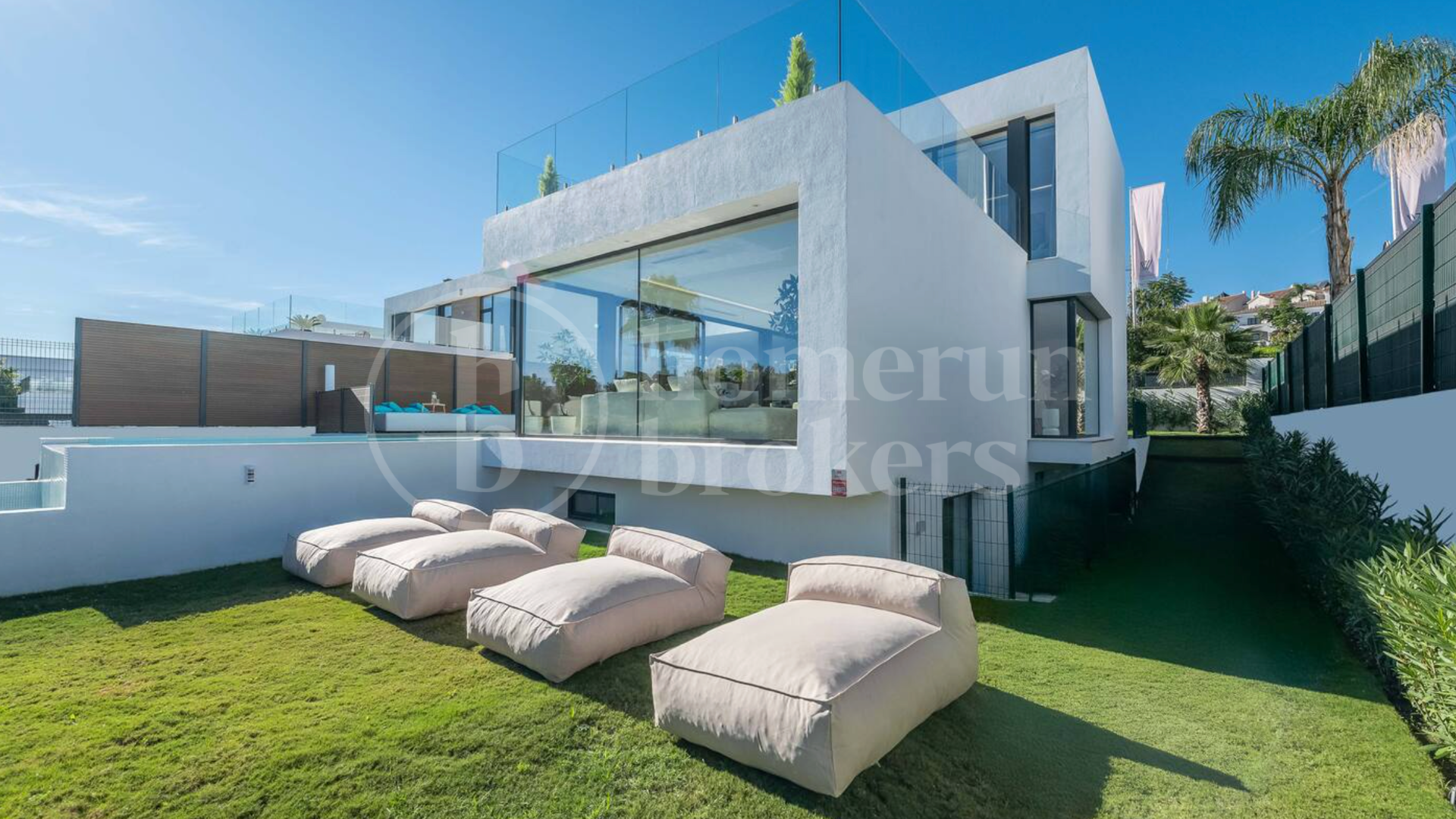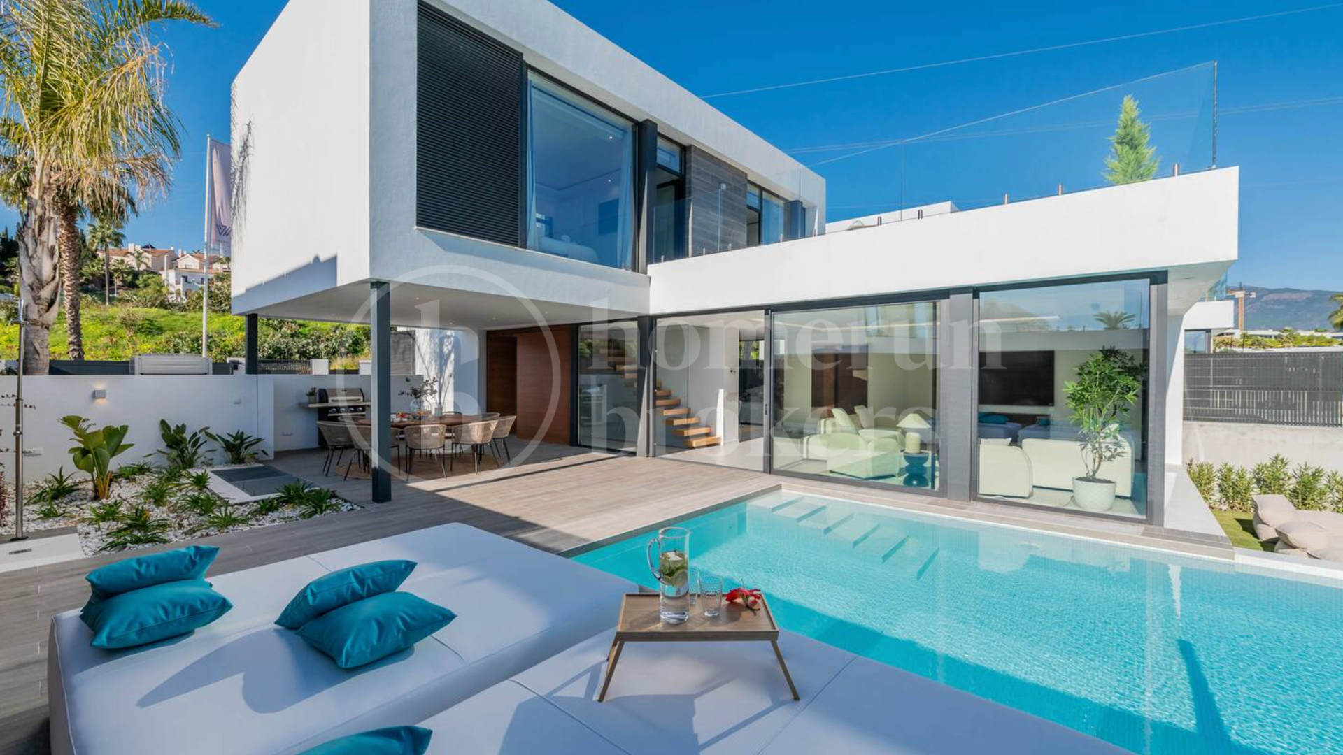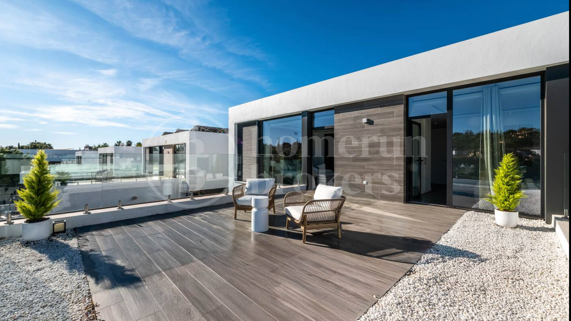 Modern villa for sale in El Campanario, Estepona East, offering five bedrooms, five bathrooms, three levels, 311 sqm built area, expansive terraces, and panoramic golf views within a contemporary residential setting on the New Golden Mile.