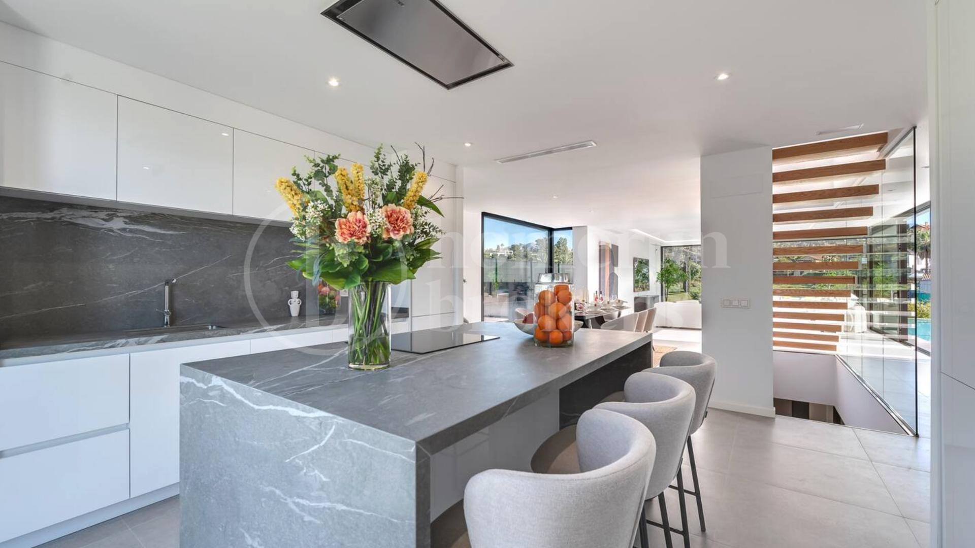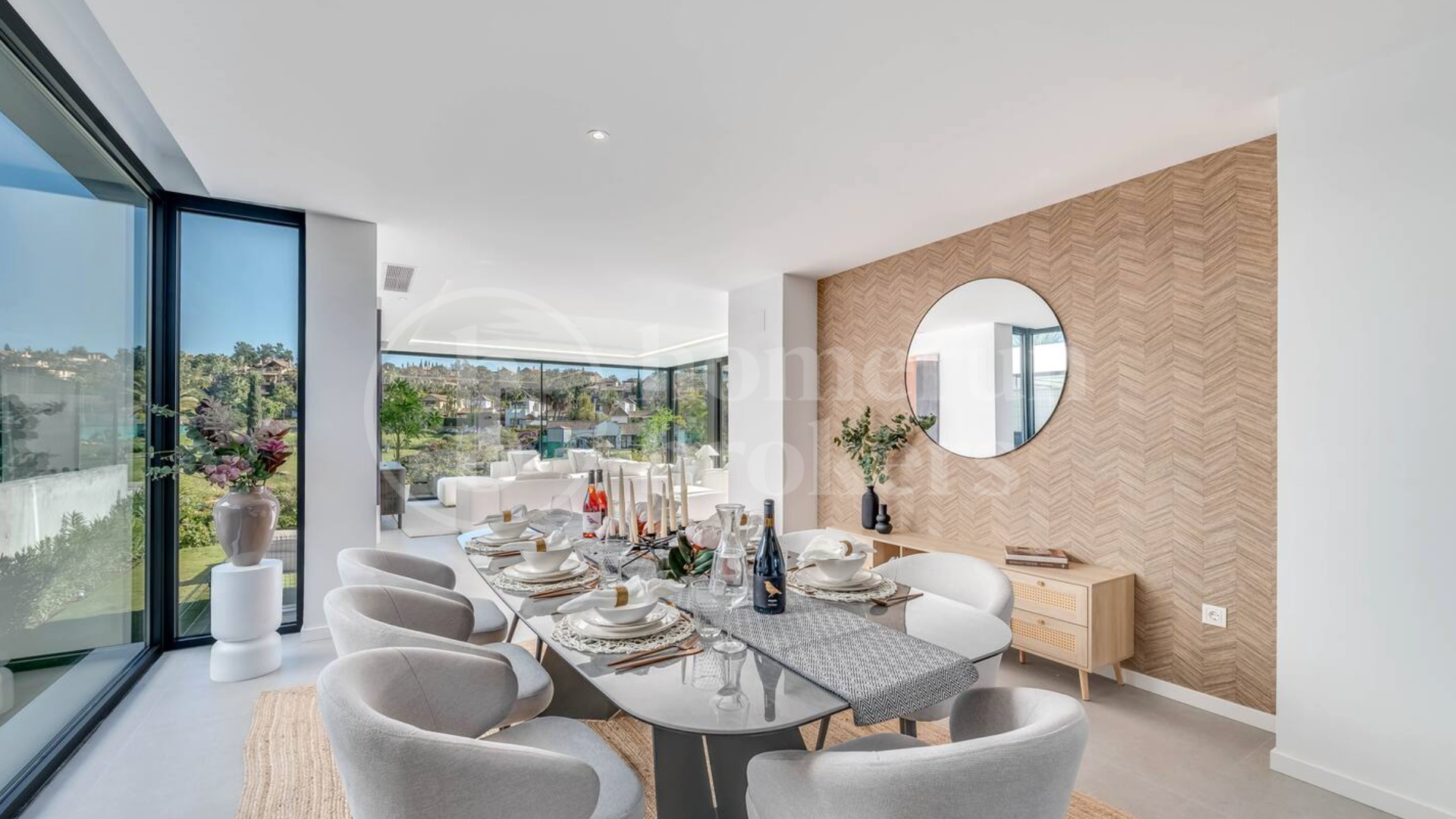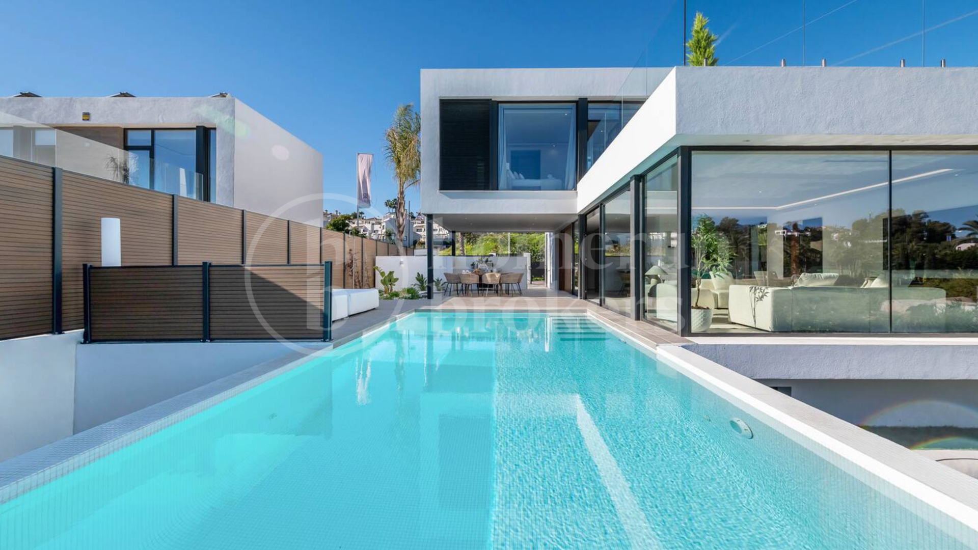Modern villa for sale in El Campanario, Estepona East, offering five bedrooms, five bathrooms, three levels, 311 sqm built area, expansive terraces, and panoramic golf views within a contemporary residential setting on the New Golden Mile.