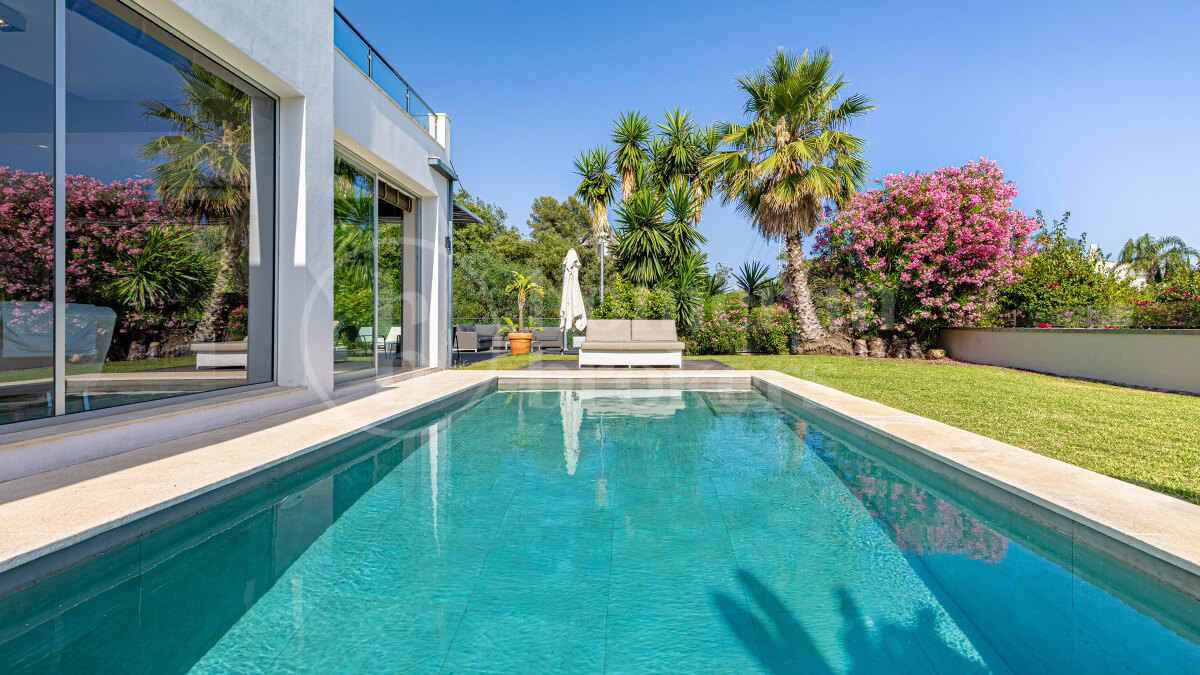 Built on a generous plot, the villa has been thoughtfully designed to maximise space and light. The outdoor area is a true highlight, featuring a stylish modern pool, expansive terraces, and shaded seating areas that encourage relaxation and al fresco dining under the Andalusian sun. Surrounded by tropical landscaping, the exterior spaces offer complete seclusion and are perfectly suited for entertaining guests or enjoying quiet moments with family.