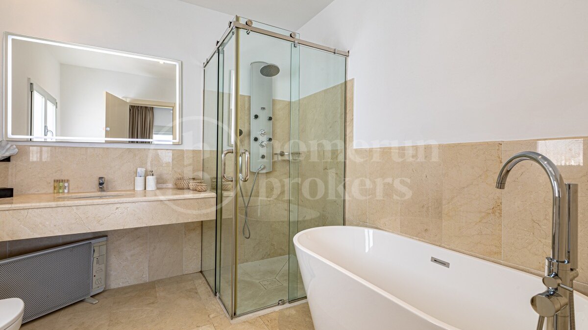 The villa offers three generously sized bedrooms, each with its own en-suite bathroom, ensuring comfort and privacy for residents and guests. Every room follows a minimalist, sophisticated design, using neutral tones, natural materials, and soft lighting to create a serene atmosphere. High-quality finishes, built-in wardrobes, and elegant bathroom fittings contribute to the property’s refined character.