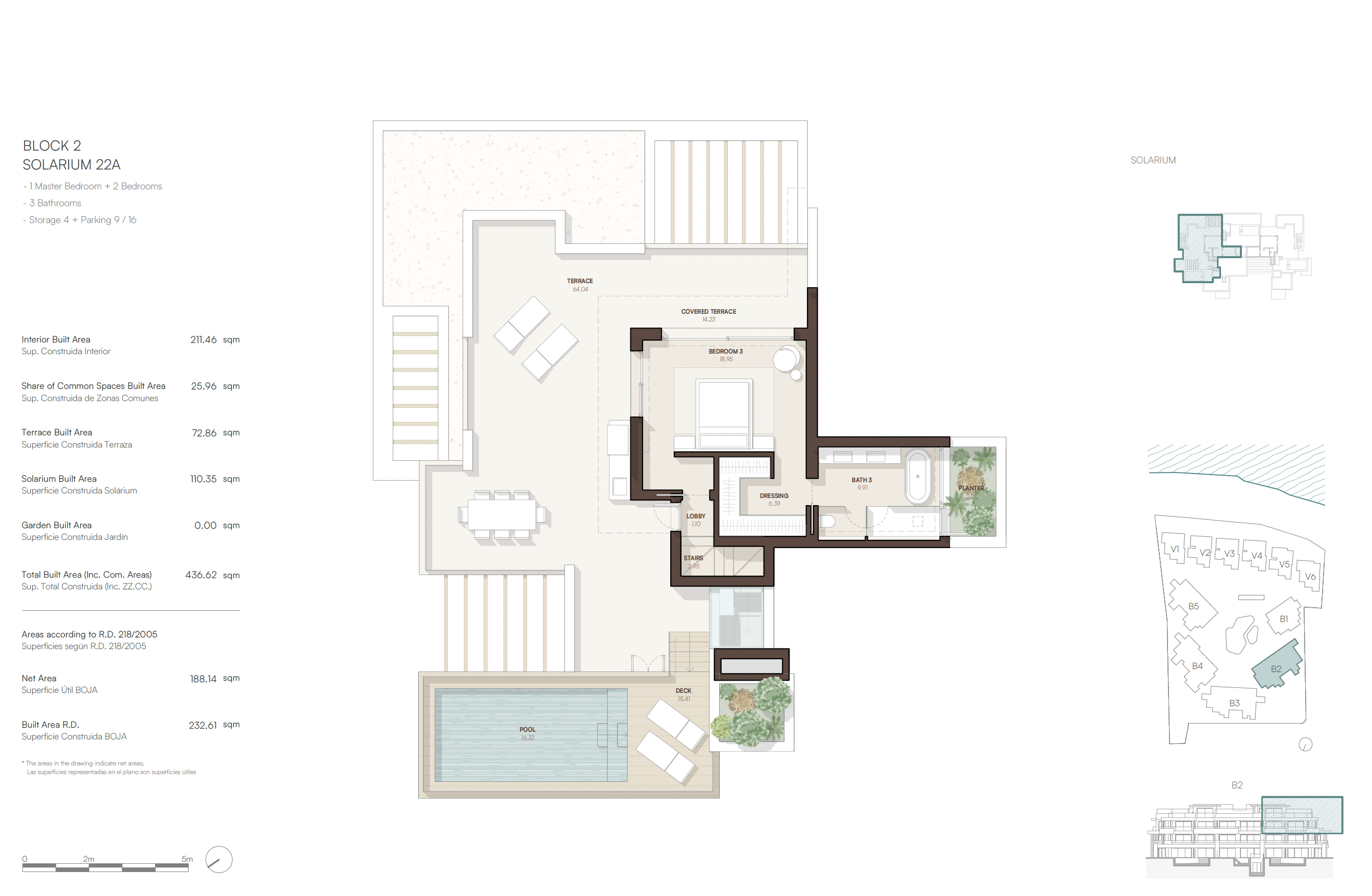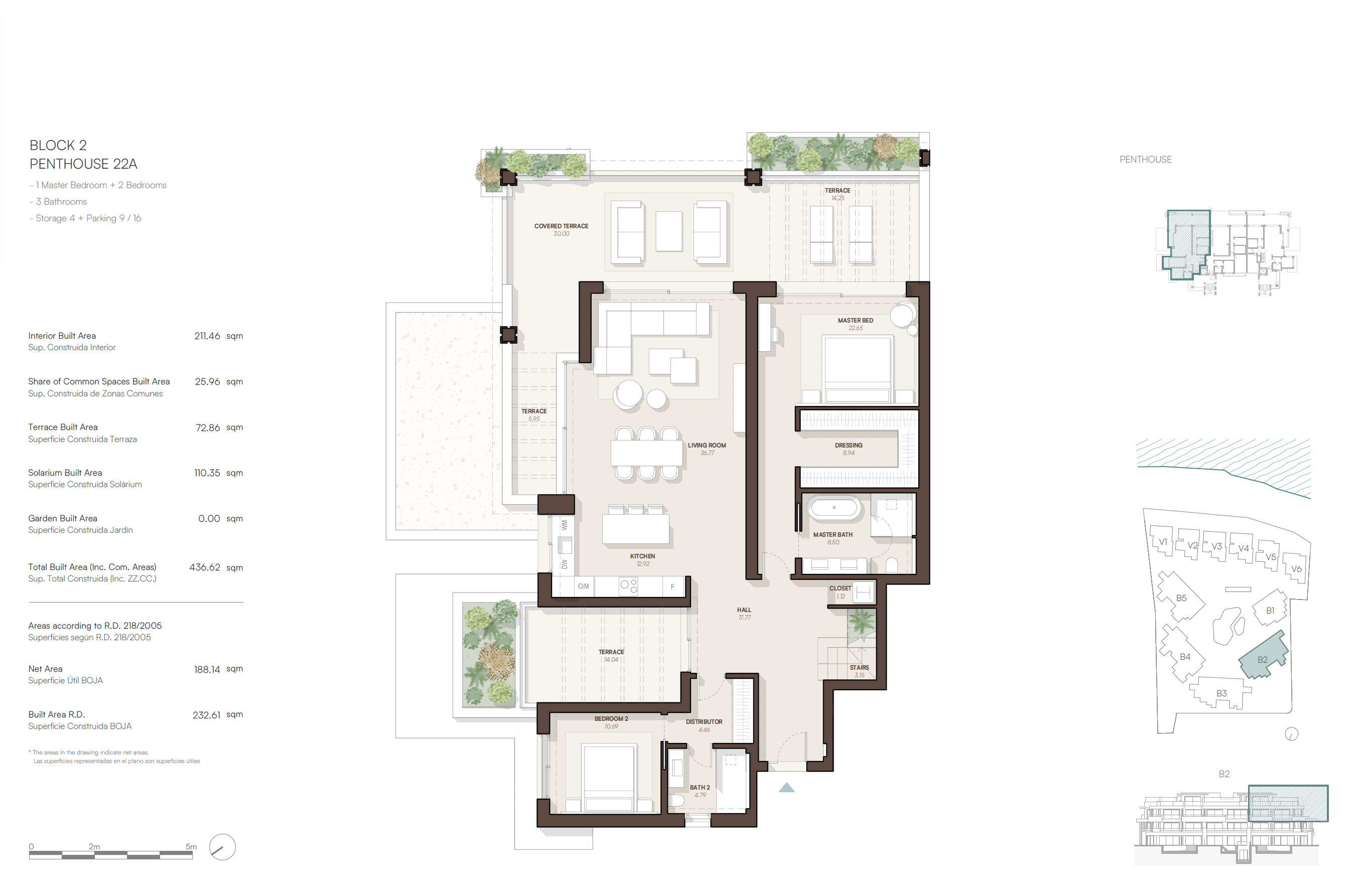 This three-bedroom, three-bathroom duplex penthouse for sale offers 211 m² of built space and an additional 73 m² of terraces within a contemporary development designed as a seamless extension of its coastal surroundings. Spread across five three-storey buildings, the community includes 42 apartments and penthouses, all positioned to maximise sea views while maintaining an elegant, understated architectural presence. The complex is arranged around landscaped gardens with native flora, creating an atmosphere where tranquillity and design work together to elevate daily life.