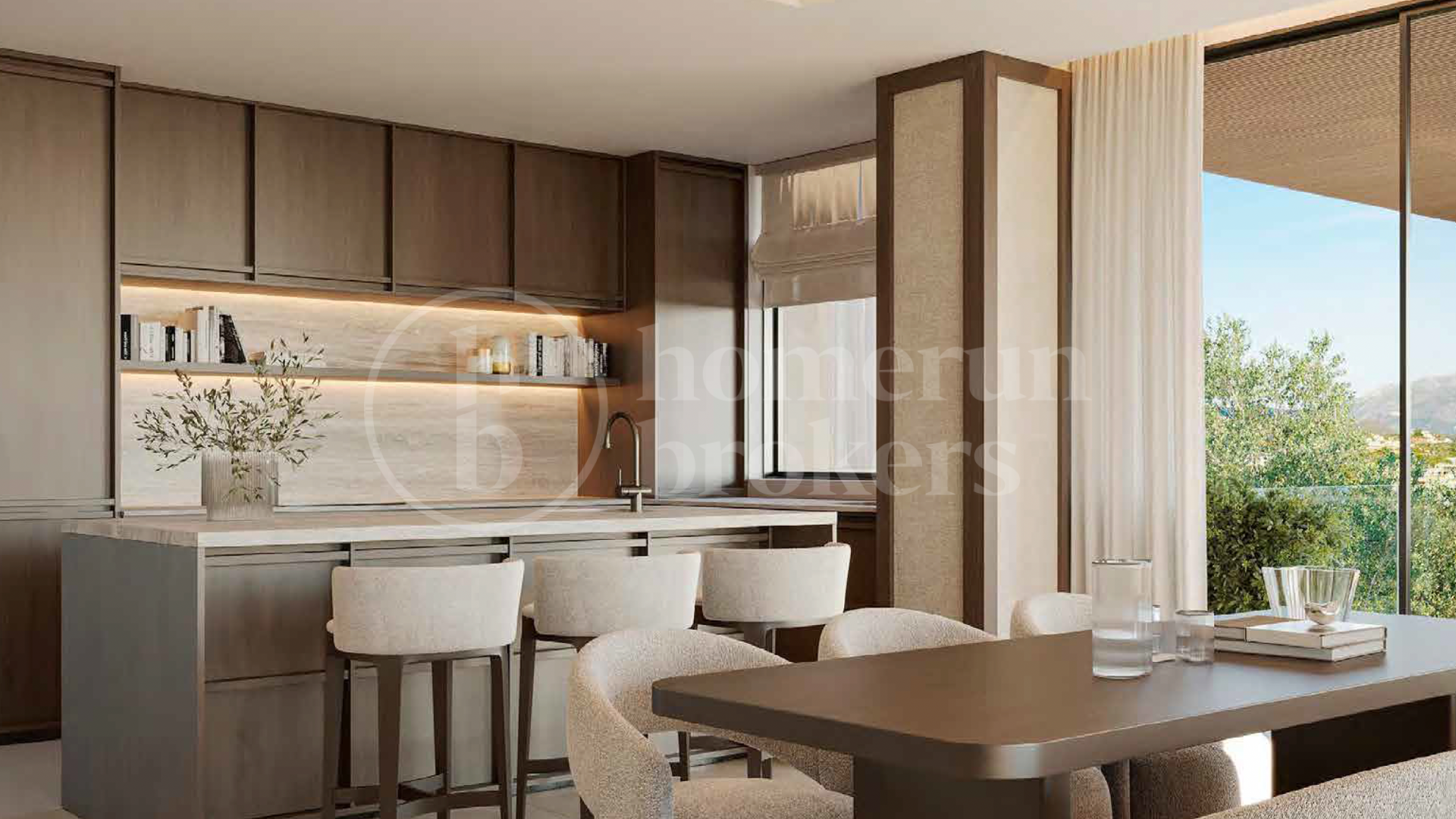 The penthouse occupies one of the prime positions in the development, facing the Mediterranean and benefitting from the natural light that shapes every corner of the interior. The layout has been carefully planned to ensure fluid transitions between rooms, with open-plan living areas that draw the eye outward toward the horizon. Large glazed openings create a constant dialogue with the surrounding landscape, making the views an integral part of the home’s character. The kitchen blends organically into the living and dining areas, highlighting a modern concept of living where space feels effortless and connected.