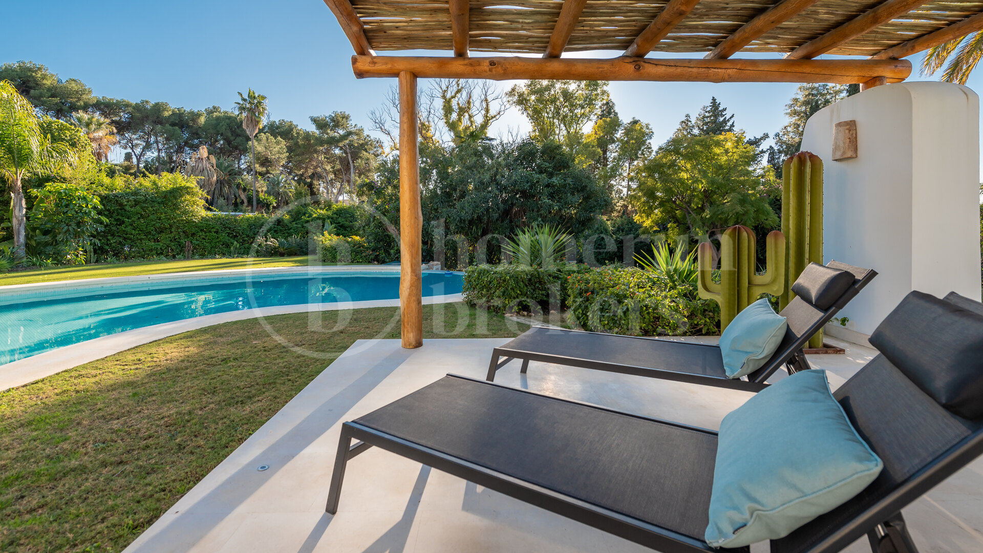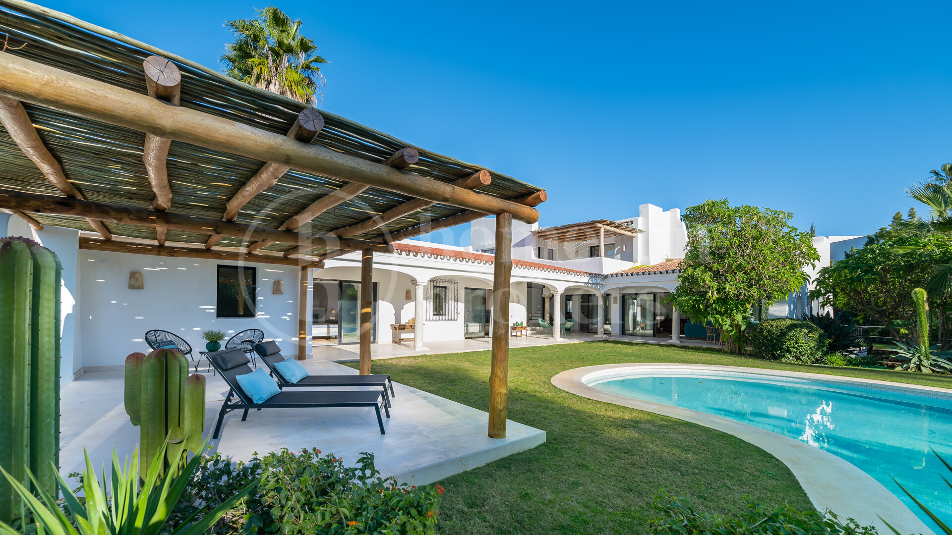 Outdoor living plays a central role in this property. Expansive garden areas surround a large swimming pool, creating space for sunbathing, outdoor dining and social gatherings. The low building density of Guadalmina Baja ensures open surroundings, wide plots and a tranquil residential environment, largely composed of luxury villas, beachside homes and golf-front properties with a strong Andalusian and Mediterranean architectural influence.