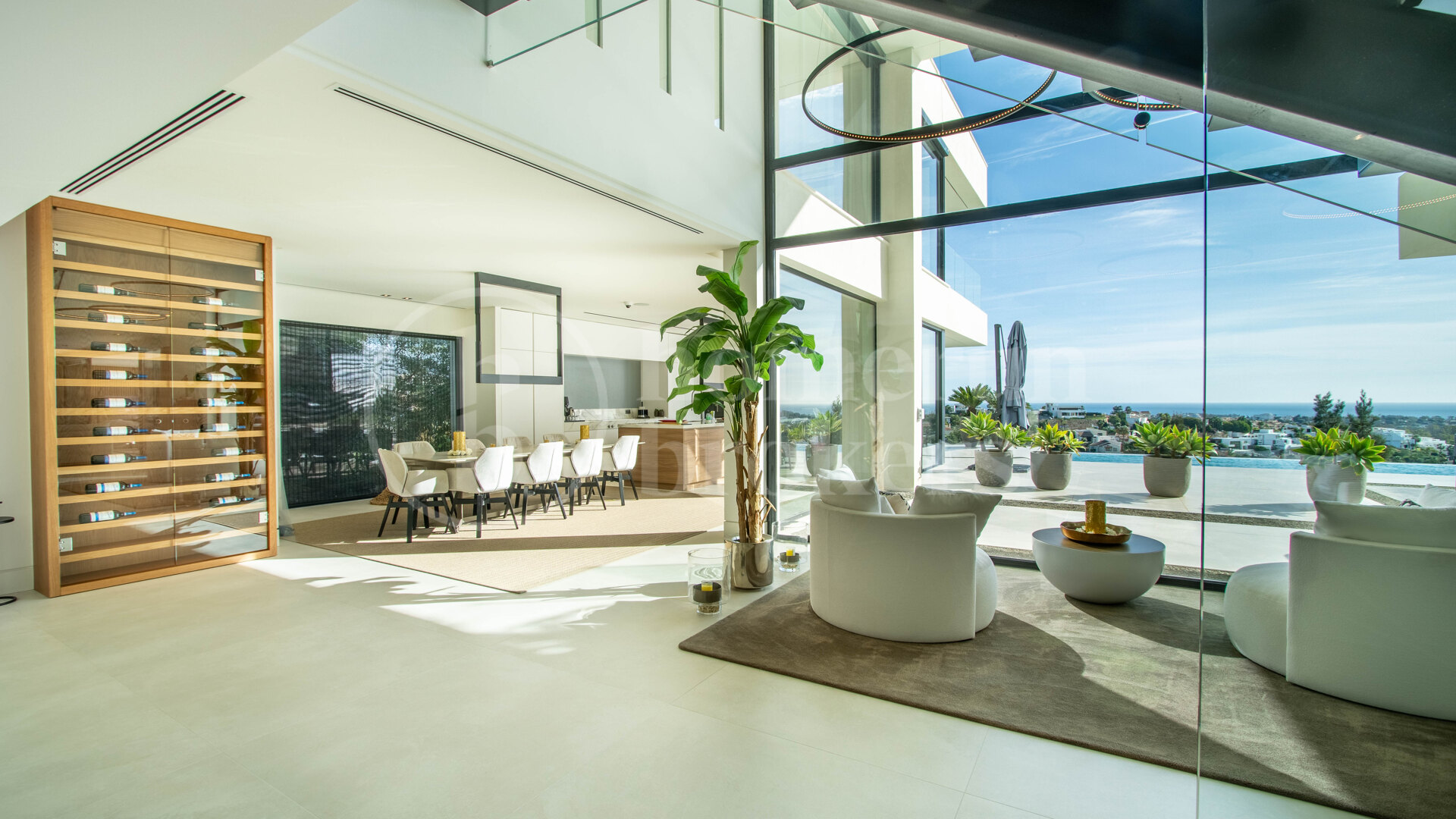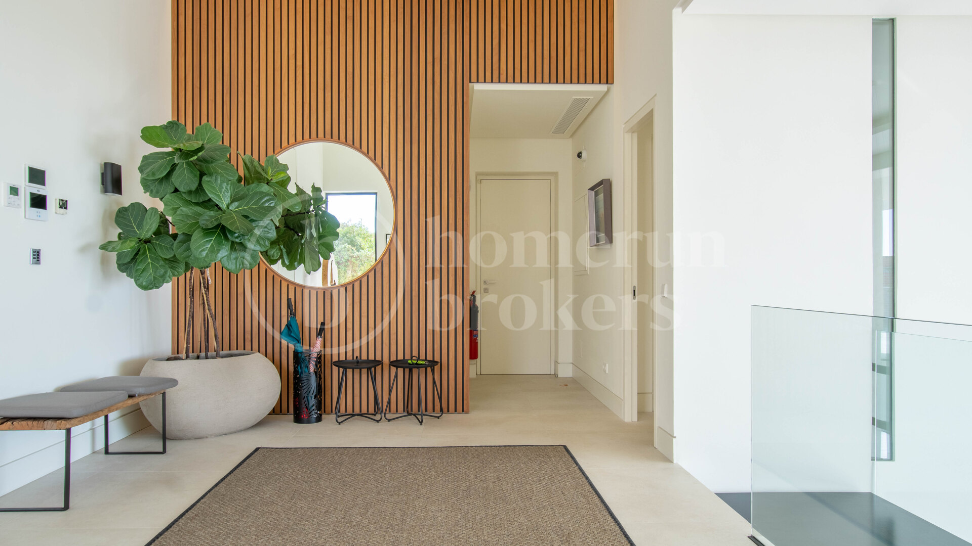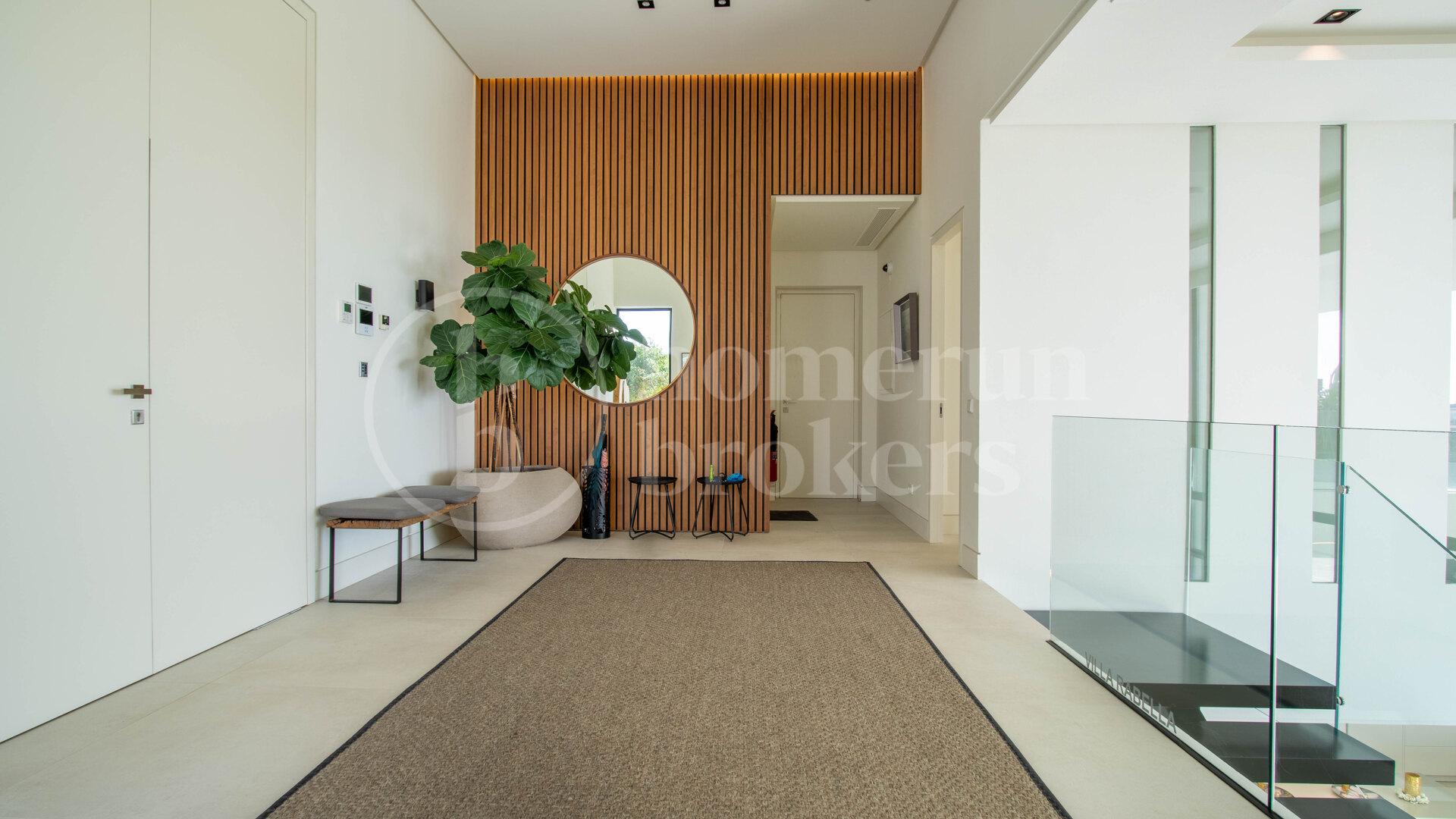 Villa Rabella is a contemporary luxury villa for sale in La Alquería, Benahavís, offering panoramic views across the Mediterranean Sea, surrounding golf courses, and the mountain landscape. Designed by renowned architect Carlos Lamas, the property has been conceived as a modern three-level home where architecture, light, and open space work together to create an elegant yet highly functional living environment. The villa accommodates five generously proportioned bedrooms and six bathrooms, all finished with premium materials and integrated with the latest home technologies. From the moment you arrive, the emphasis on scale and design is clear, with a striking double-height entrance hall setting the tone for what follows.
