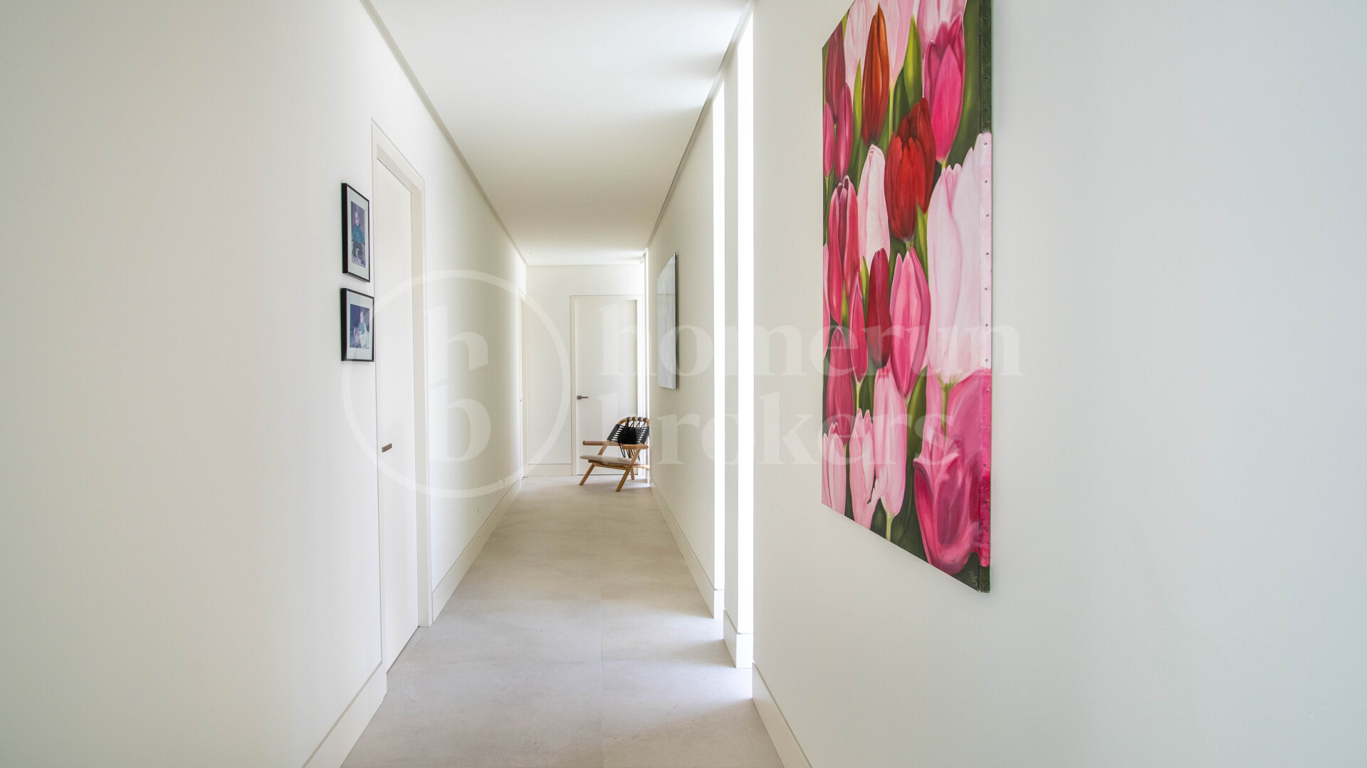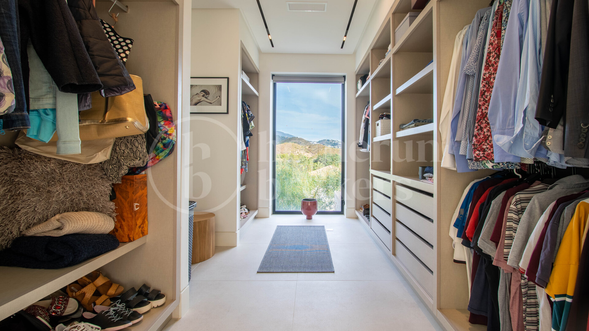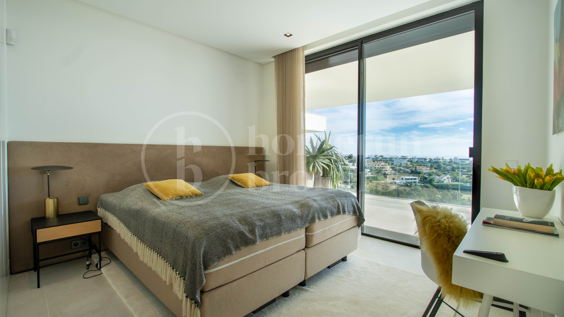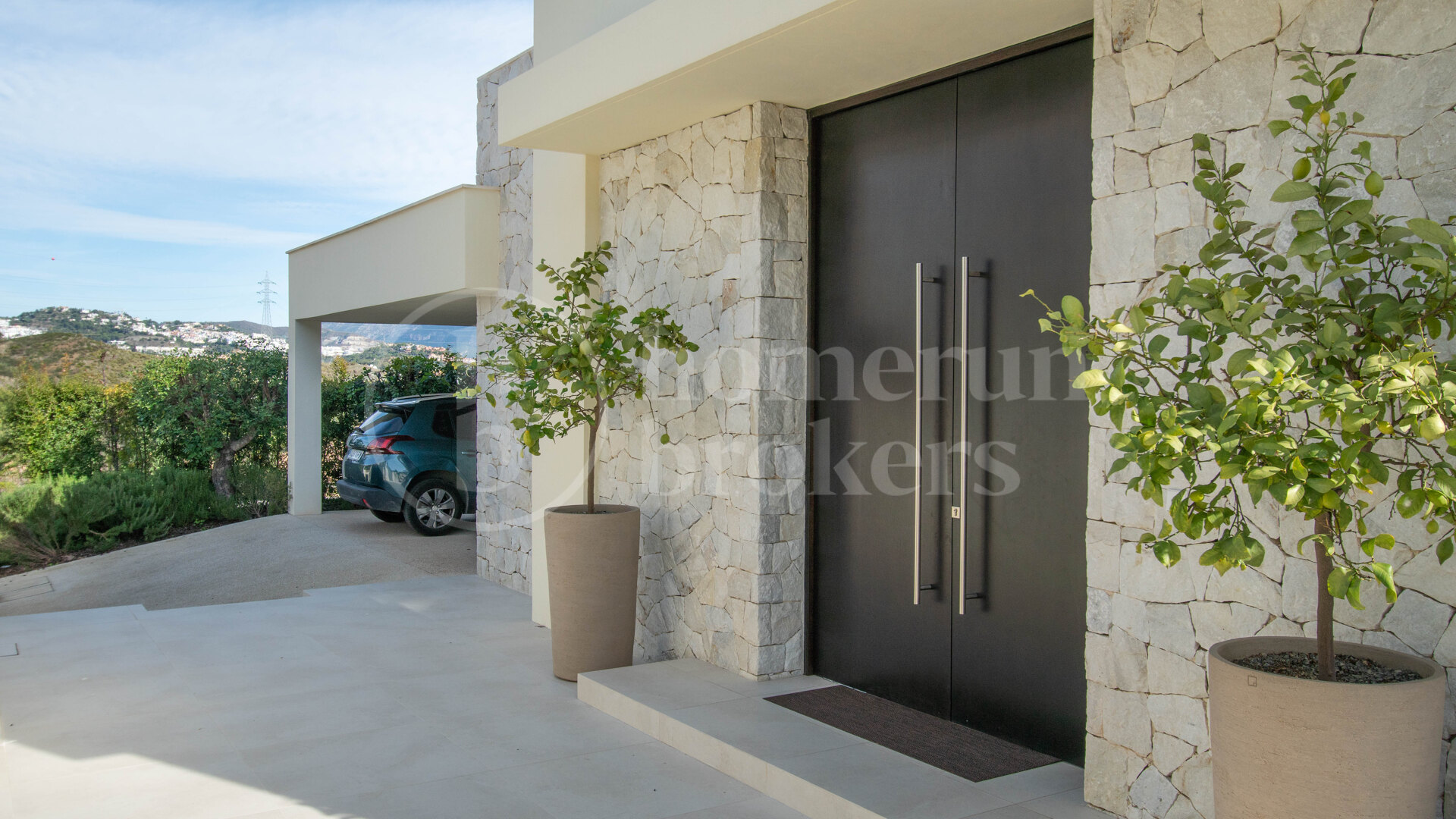 Villa Rabella is a contemporary luxury villa for sale in La Alquería, Benahavís, offering panoramic views across the Mediterranean Sea, surrounding golf courses, and the mountain landscape. Designed by renowned architect Carlos Lamas, the property has been conceived as a modern three-level home where architecture, light, and open space work together to create an elegant yet highly functional living environment. The villa accommodates five generously proportioned bedrooms and six bathrooms, all finished with premium materials and integrated with the latest home technologies. From the moment you arrive, the emphasis on scale and design is clear, with a striking double-height entrance hall setting the tone for what follows.