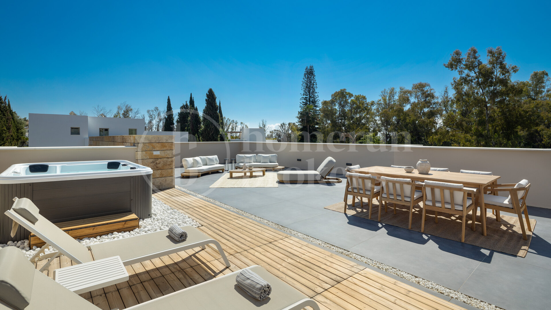 Ascending to the rooftop solarium, you’ll discover a true lifestyle haven. Complete with a jacuzzi and lounge area, this space offers breathtaking views of La Concha mountain perfect for sunset cocktails and relaxed evenings under the Mediterranean sky.