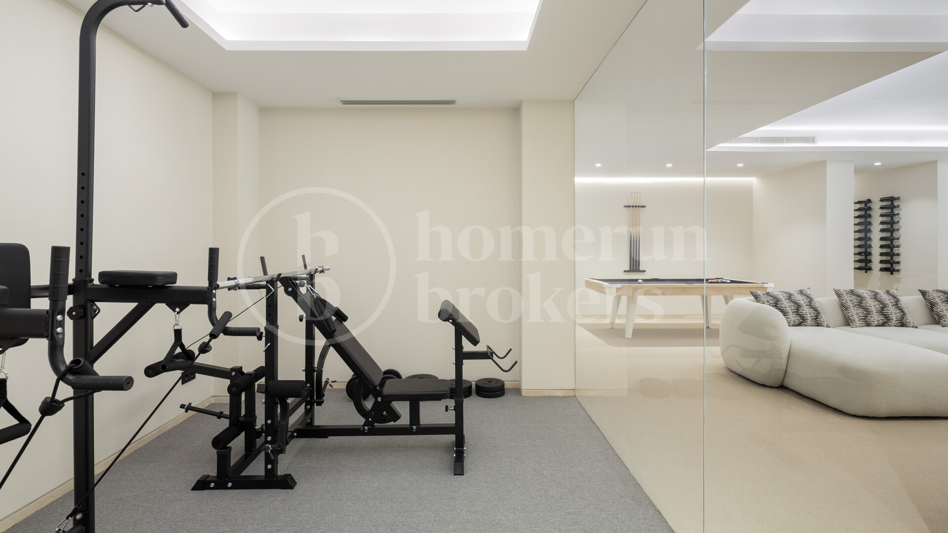 The lower level is designed for leisure and functionality, featuring a fully equipped gym, a bespoke bodega, a second living room, and an additional kitchen with bar area. This level also includes two en-suite guest bedrooms, both with direct access to a secondary pool area and landscaped gardens, creating a private retreat for guests. A three-car garage and guest toilet complete this floor.