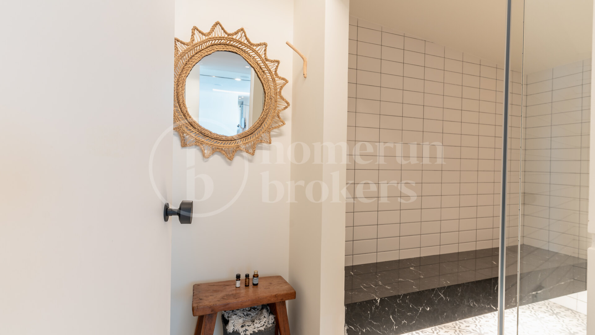 The middle level forms the heart of the home. An elegant open-plan kitchen with a pantry flows effortlessly into the dining and living areas, all of which open onto an expansive terrace designed for outdoor living. Here, interior and exterior merge seamlessly, allowing you to enjoy uninterrupted views of the sea and mountains from sunrise to sunset.