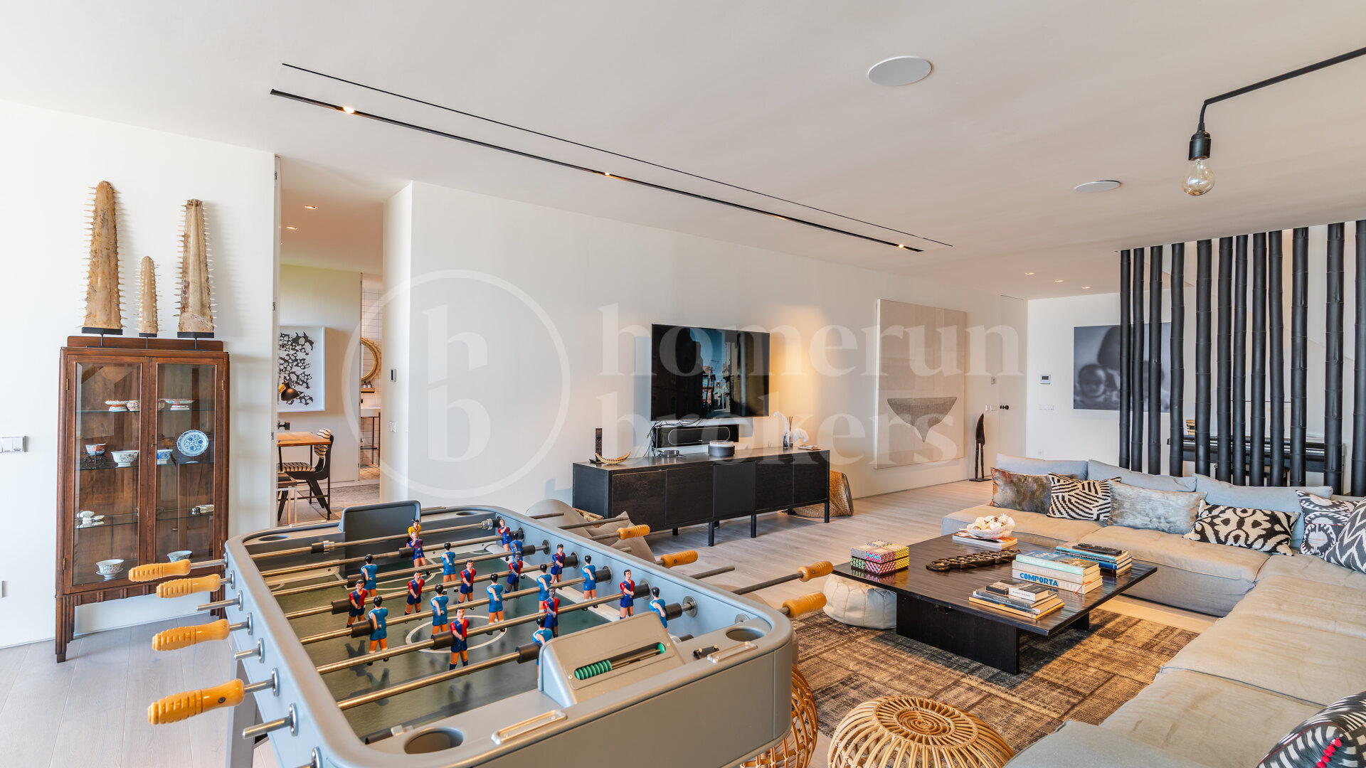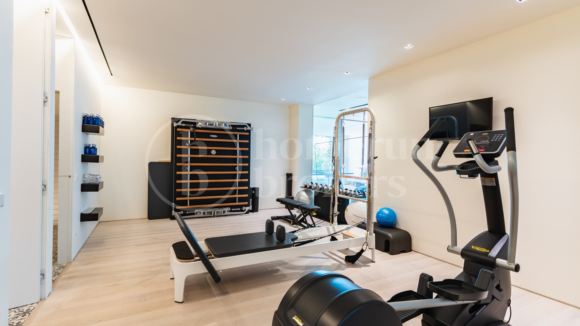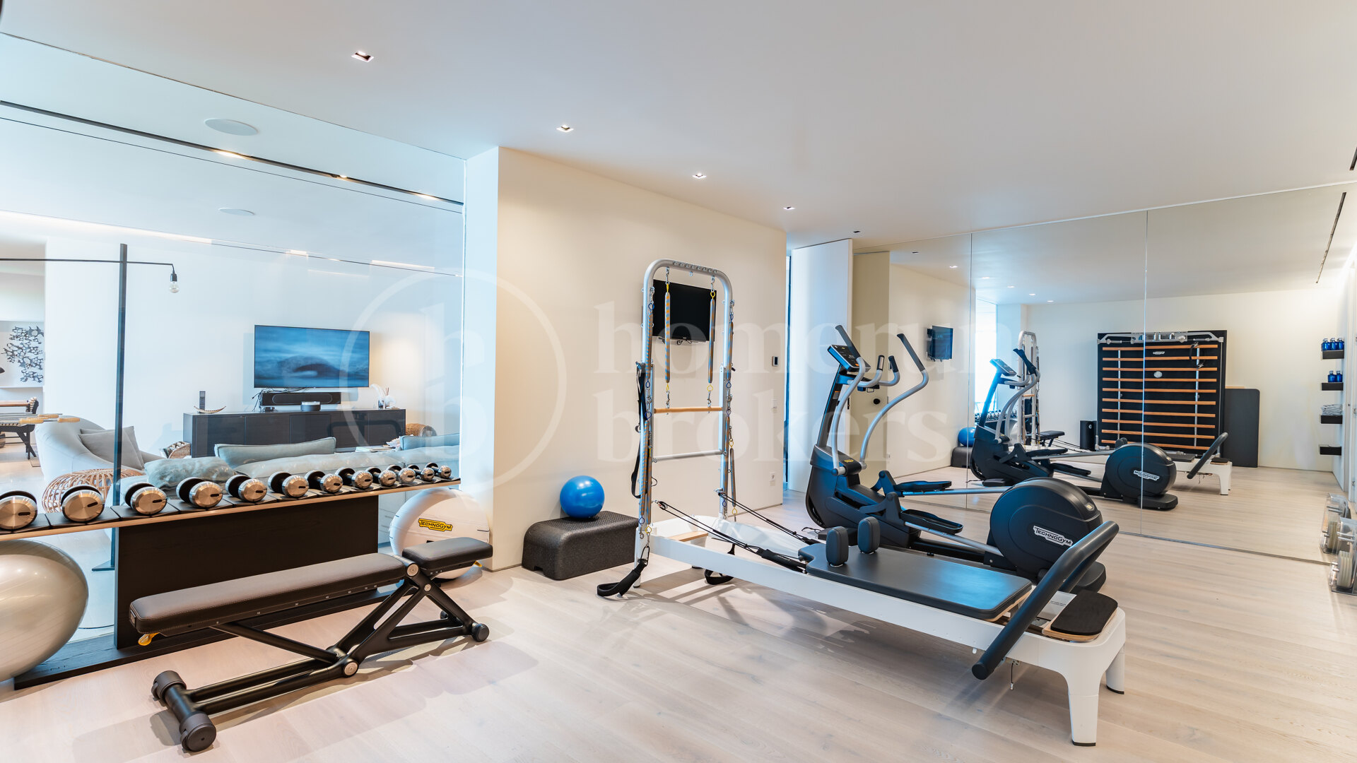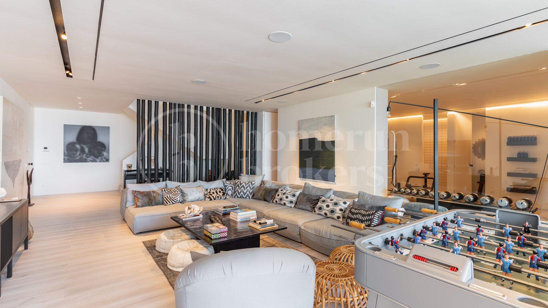 The lower level offers remarkable flexibility, accommodating three additional bedrooms—one currently used as an office—a spacious TV and lounge area, a fully equipped gym, and a sauna. This level opens onto a covered terrace, presently arranged as a games area, but easily adaptable to suit different needs. From here, a short path leads directly to the swimming pool, once again positioned to make the most of the captivating coastal scenery.