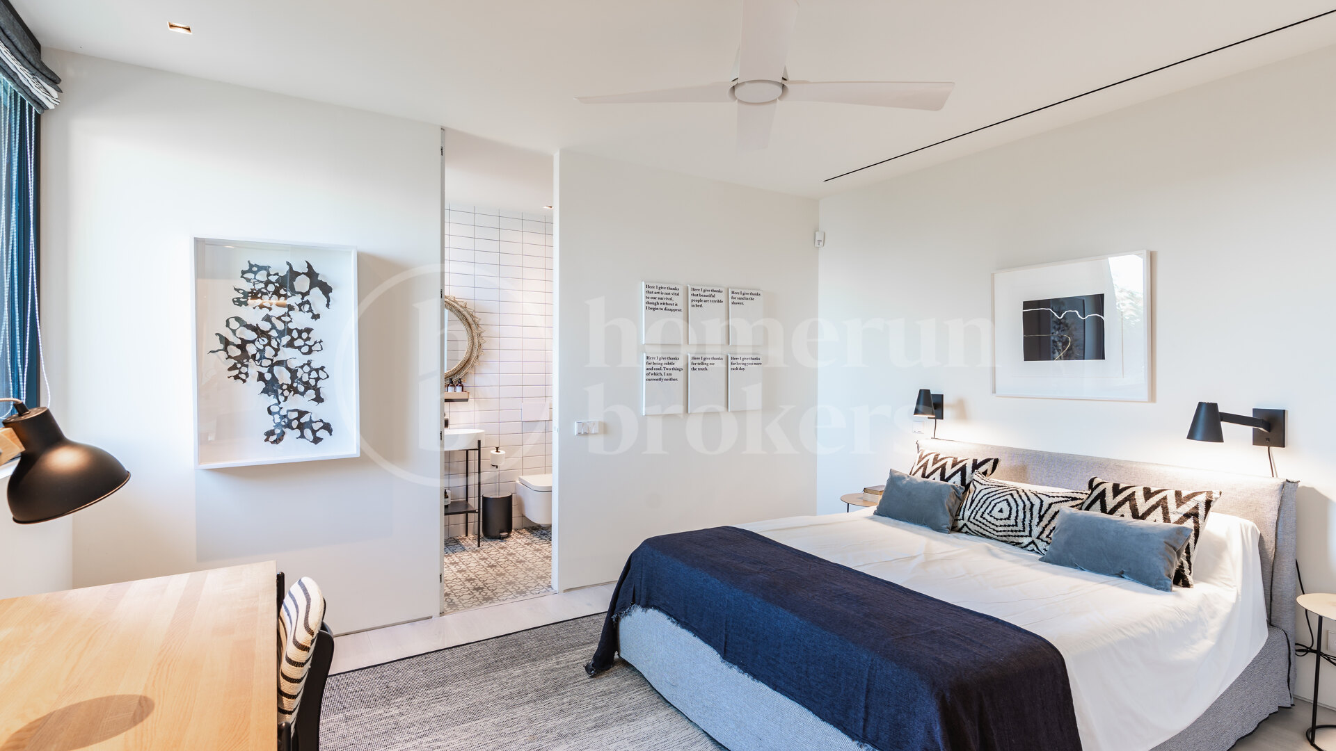 From the moment you enter, the villa frames the Mediterranean horizon. The entrance level features a generous lounge area and several bedrooms, all positioned to capture the sea and landscape. Expansive floor-to-ceiling windows and wide sliding doors invite abundant natural light and the refreshing coastal breeze, creating a continuous feeling of space and calm.