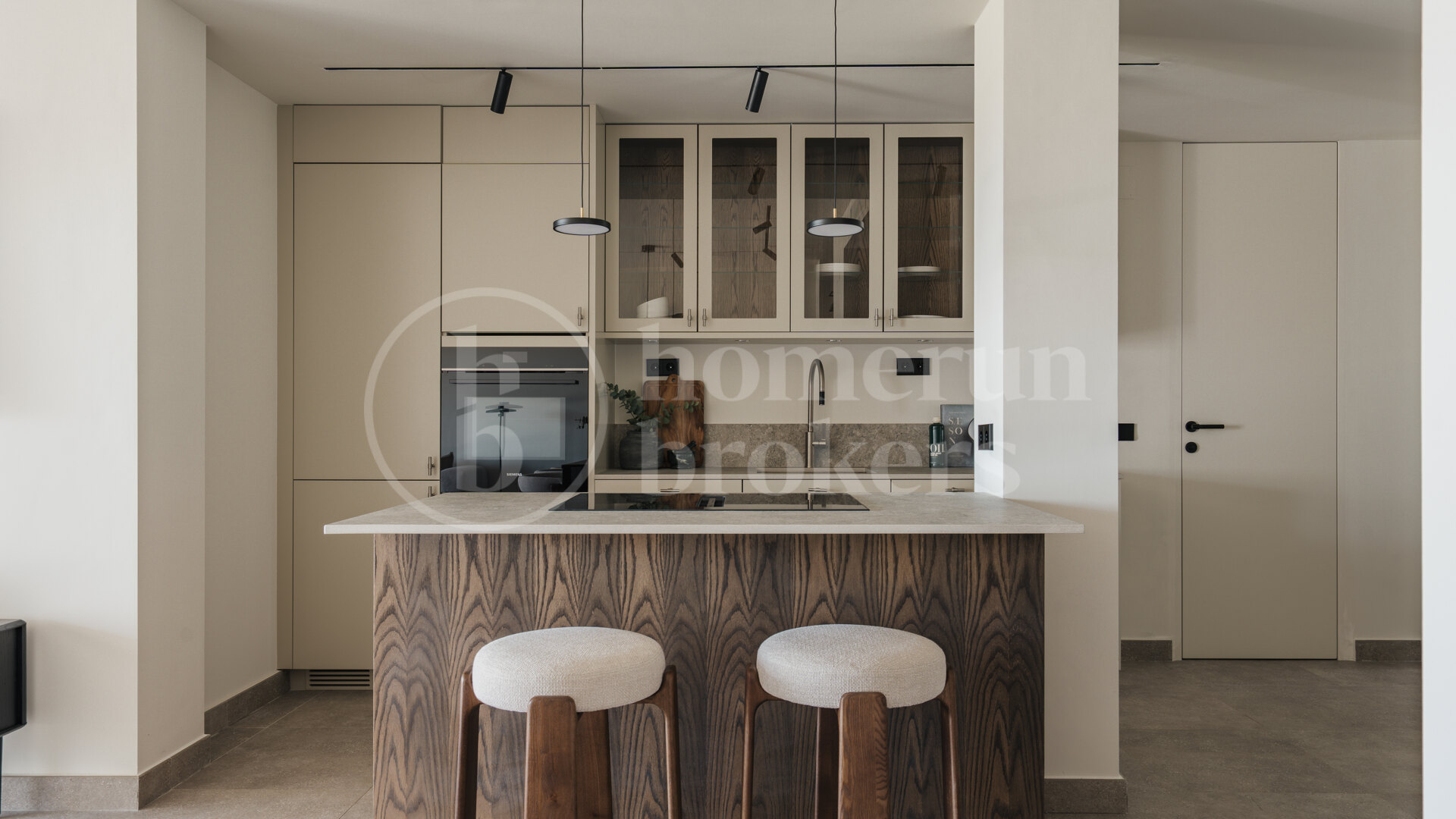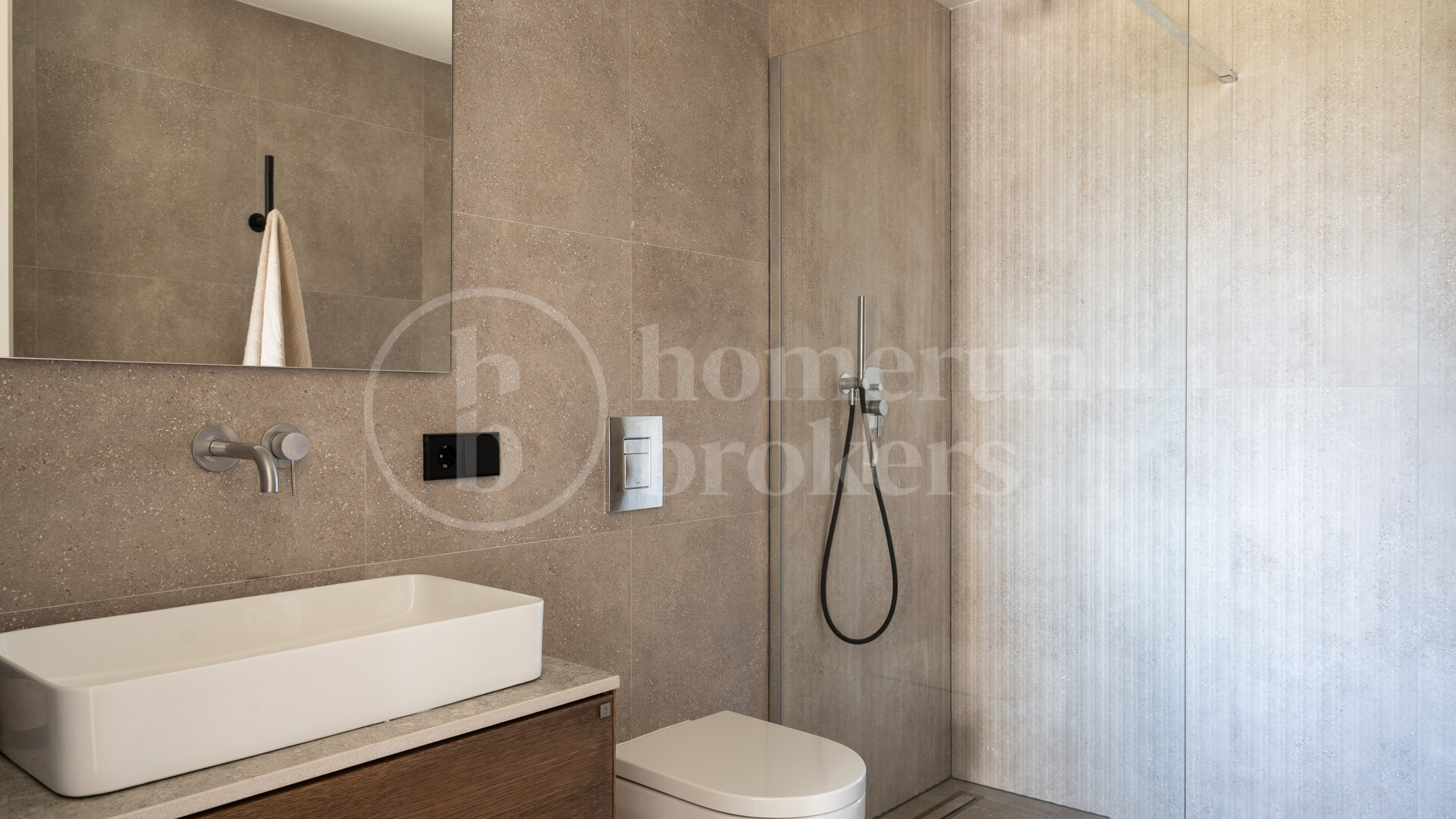 The main bedroom includes an en-suite bathroom and direct access to the terrace, creating a private and آرام connection to the outdoor space. Two additional bedrooms share a second bathroom, providing flexibility for family living or hosting guests. The layout ensures a balanced separation between living and sleeping areas while maintaining a consistent modern finish.